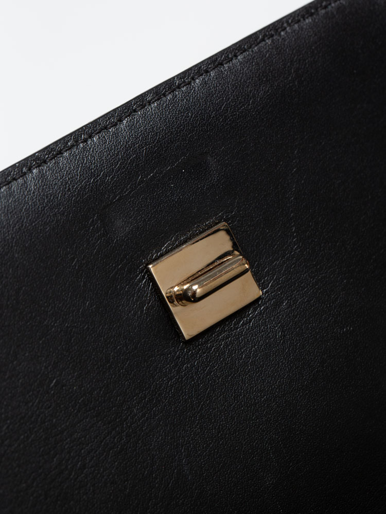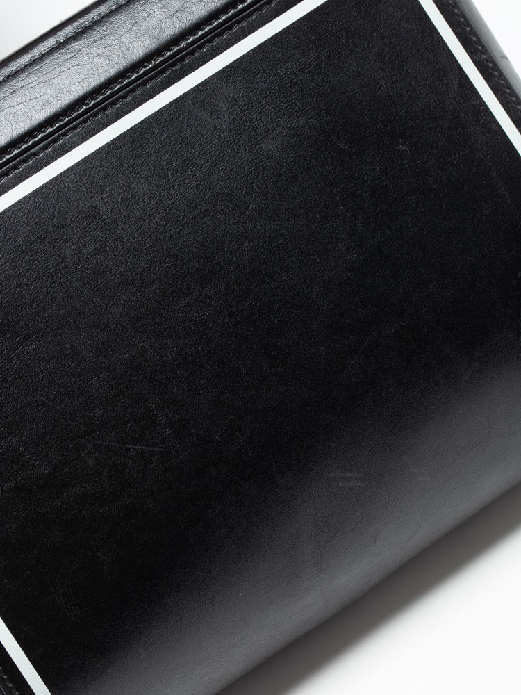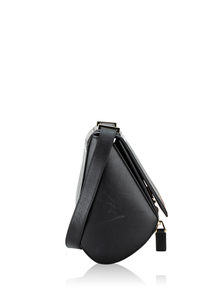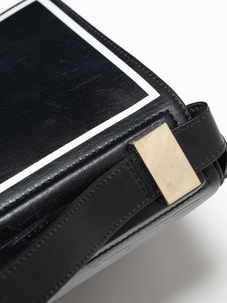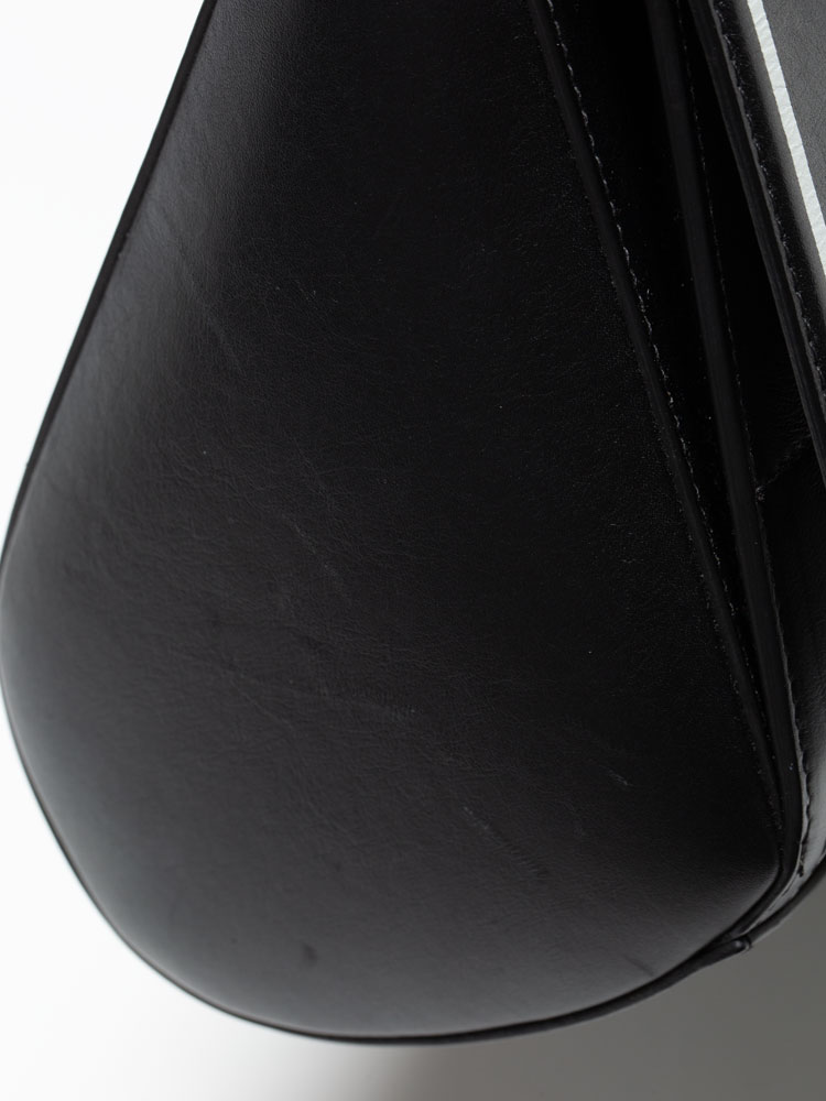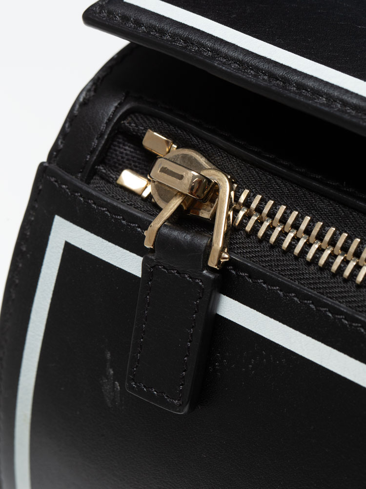 This bag is crafted of calfskin material. The bag features an adjustable long strap, front zipper pocket, and a polished gold logo press lock for the facing flap with white list details on border.