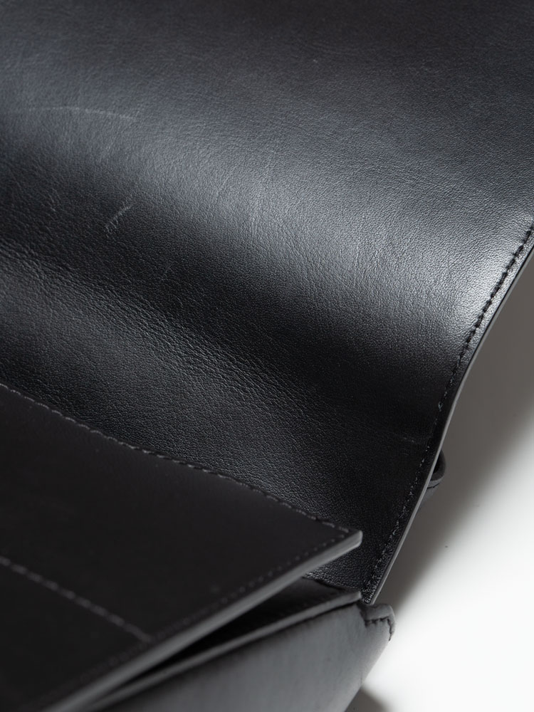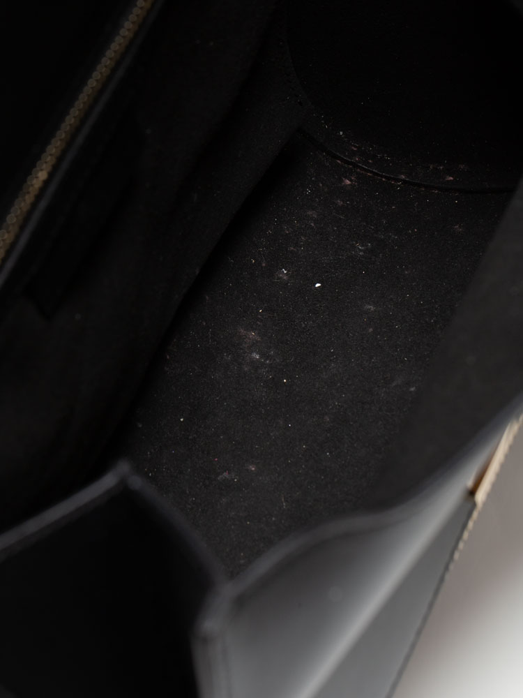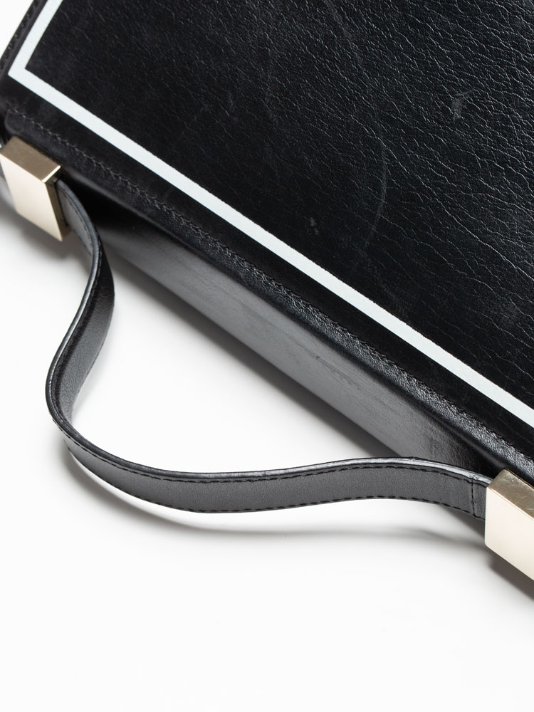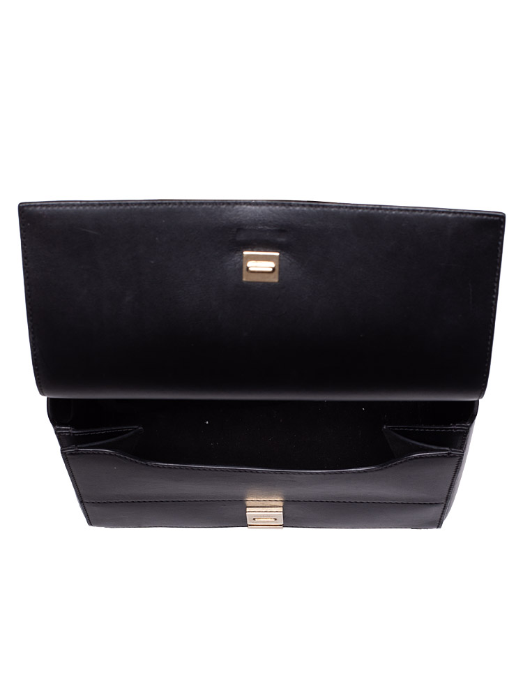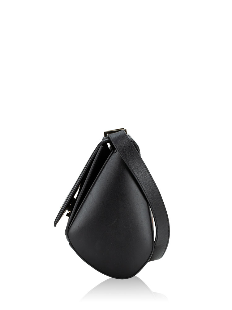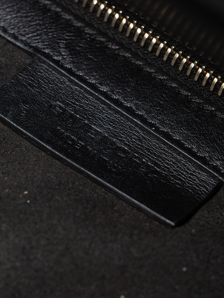 This bag is crafted of calfskin material. The bag features an adjustable long strap, front zipper pocket, and a polished gold logo press lock for the facing flap with white list details on border.