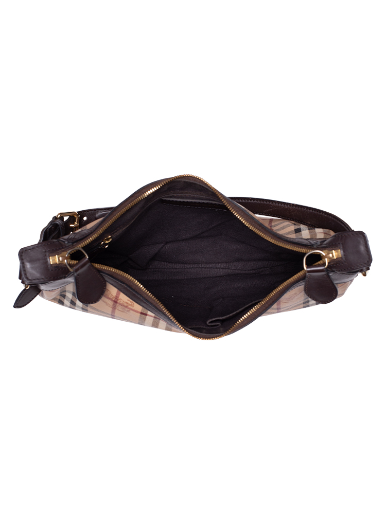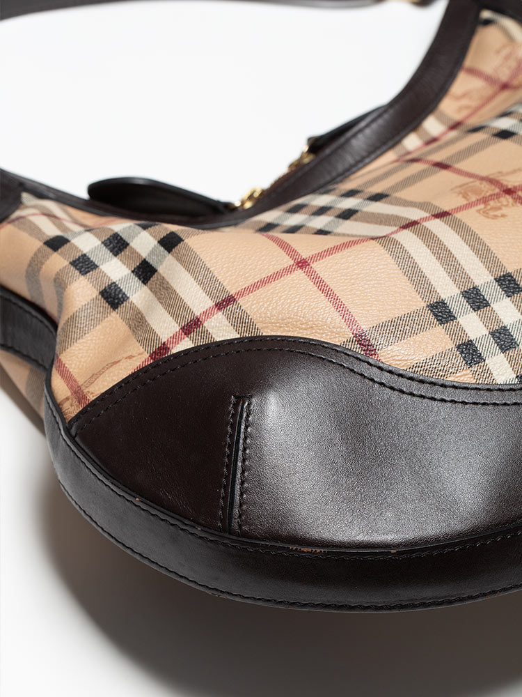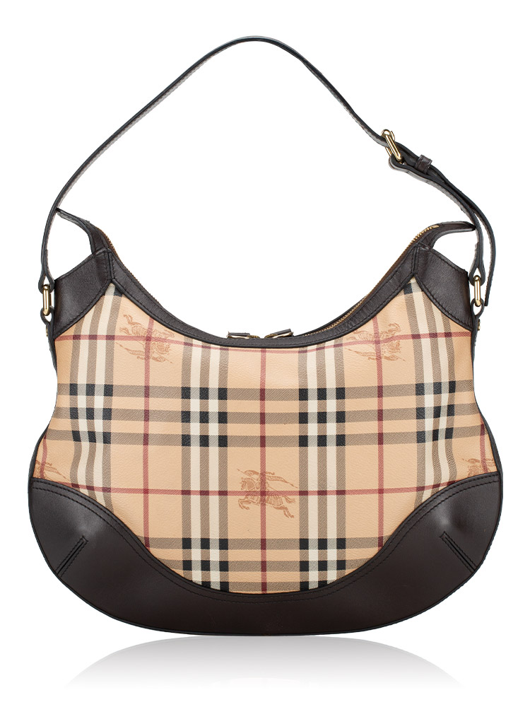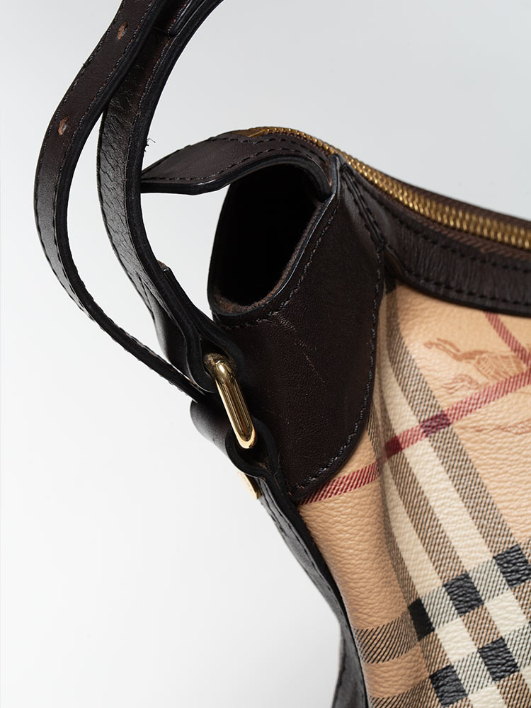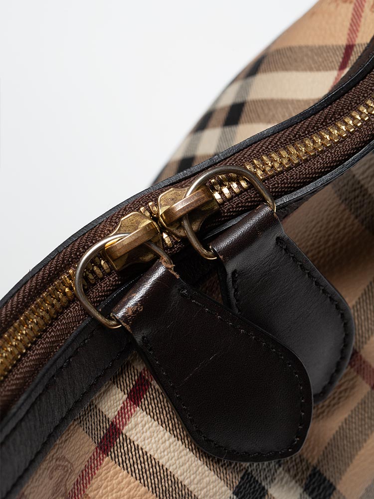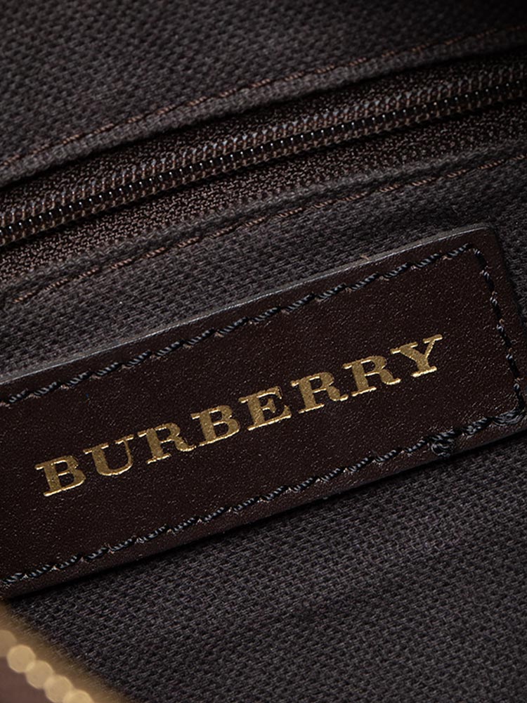 This bag is crafted of Burberry Haymarket coated canvas. It features leather trim and adjustable top handle. The top zipper opens to a fabric lining with slip and zipper pocket.