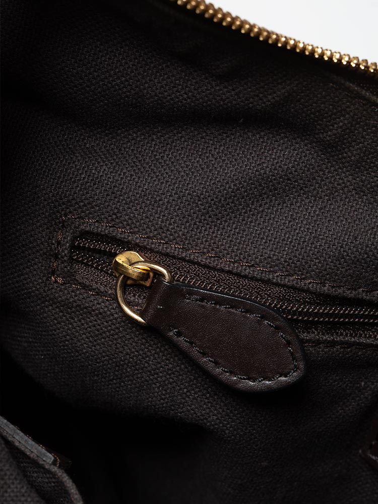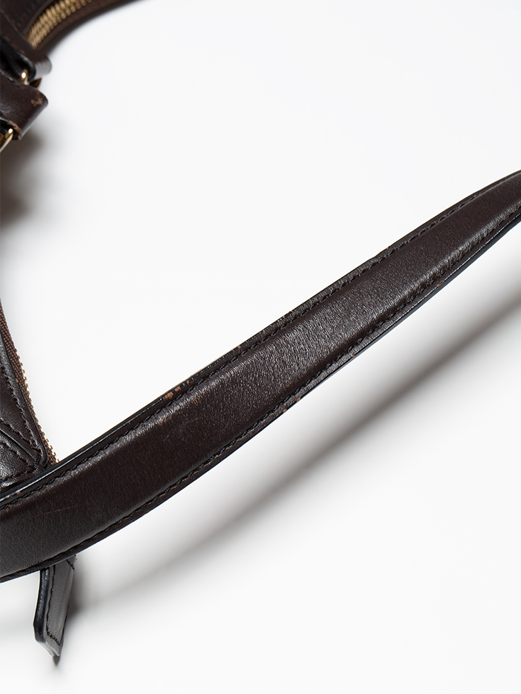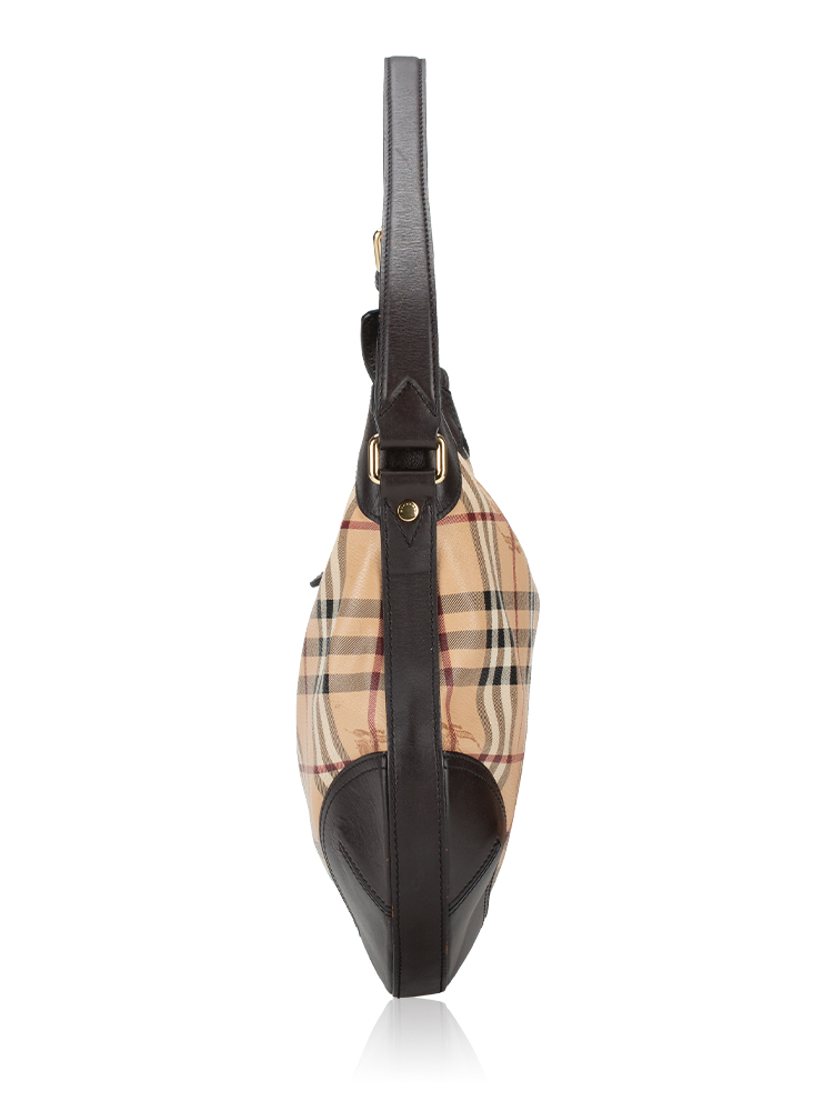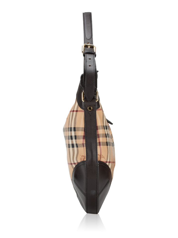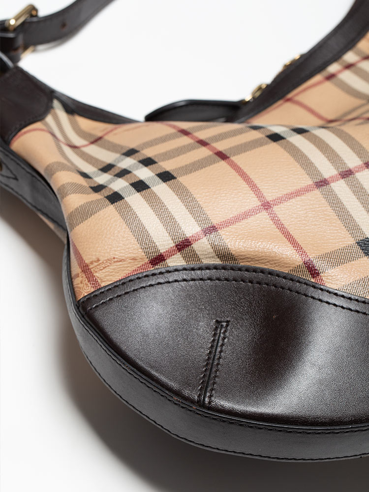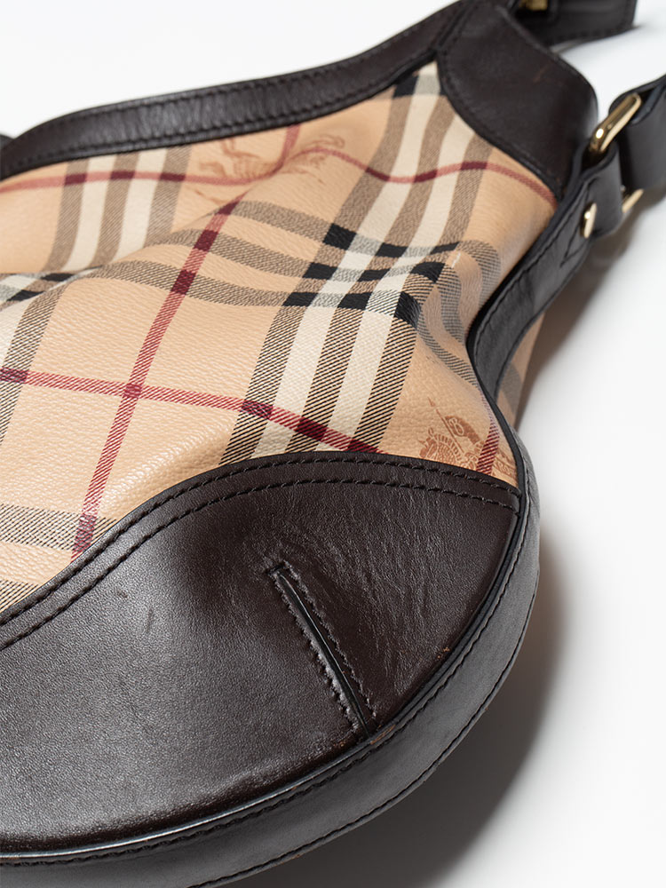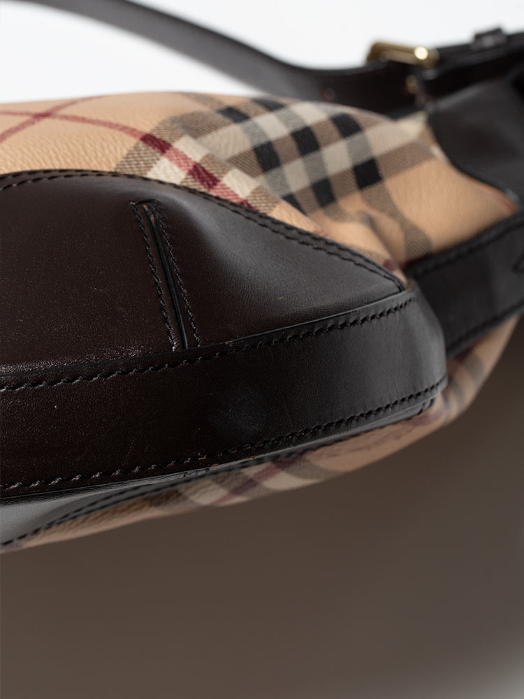This bag is crafted of Burberry Haymarket coated canvas. It features leather trim and adjustable top handle. The top zipper opens to a fabric lining with slip and zipper pocket.