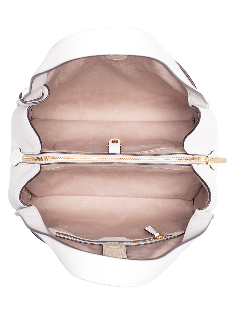 Made of pebble leather. The bag features a magnetic snap closure that opens to suede and faille lining with interior two compartments, middle zip pocket, one zip pocket, one slip pocket, one slip pocket with button closure.
