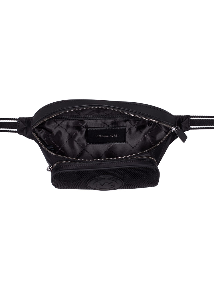 Made of nylon and leather trim. The belt bag features a zip closure that opens to polyester lining with one slip pocket, exterior one zip compartment at front, one zip pocket at back, adjustable strap.
