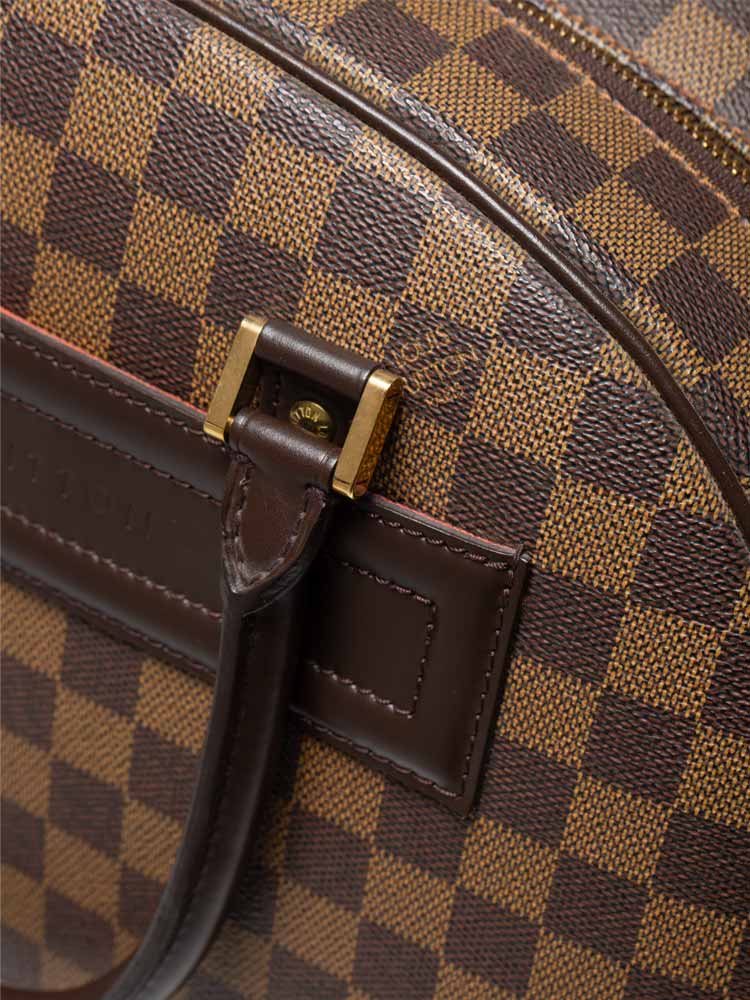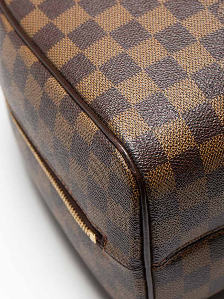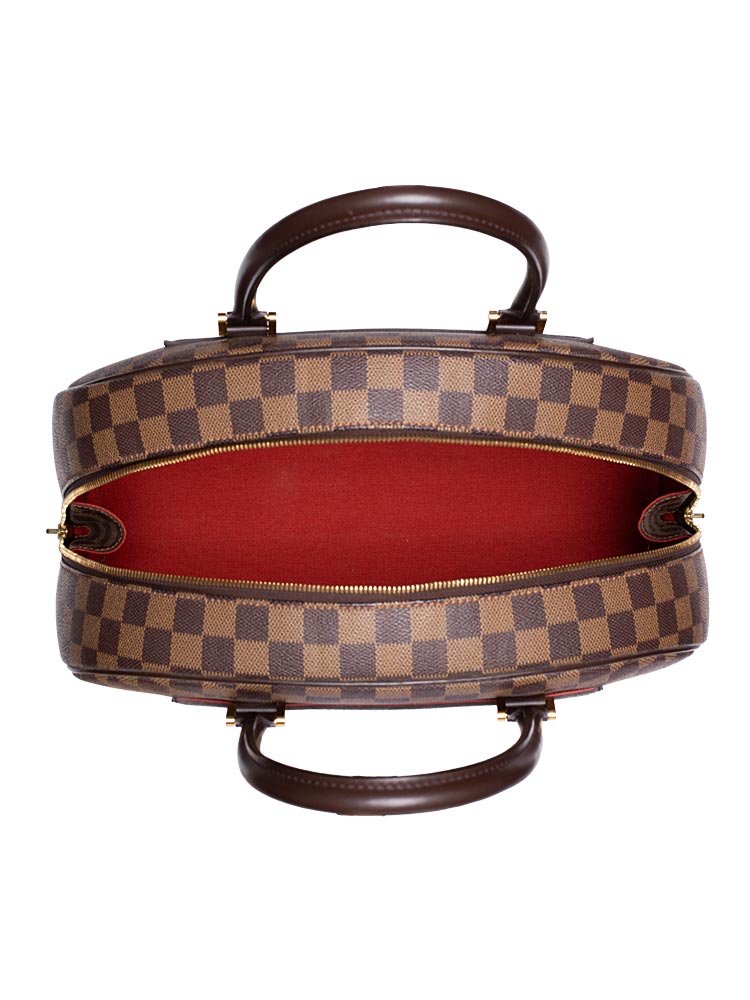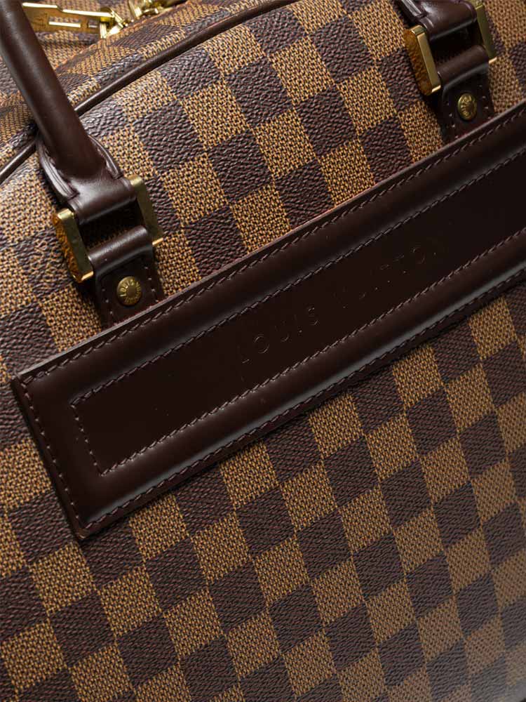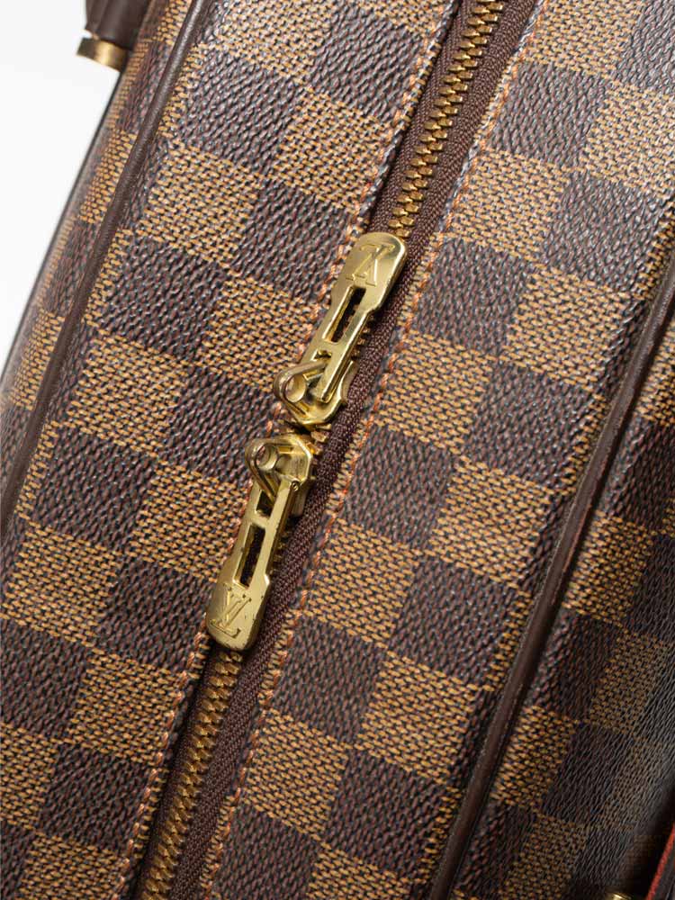 Crafted of Louis Vuitton Damier ebene coated canvas. Features rolled leather top handles and trim with polished brass hardware, and front pocket. The wrap-around zipper opens to a fabric interior with zipper and patch pockets.