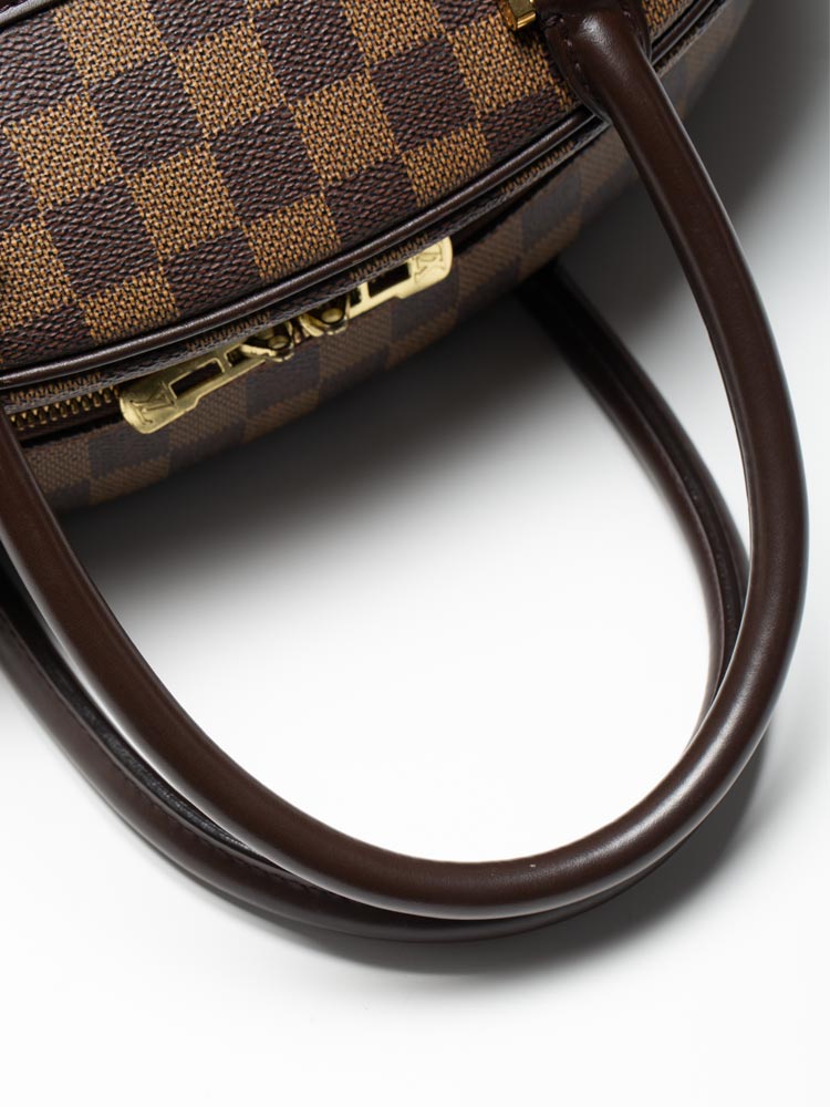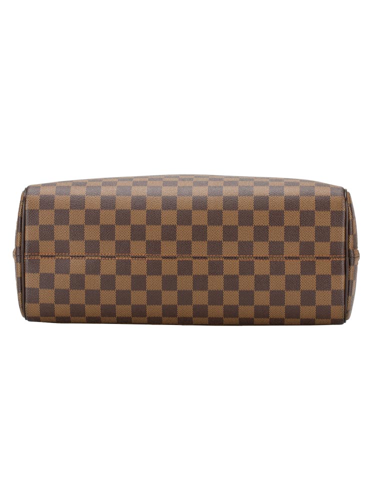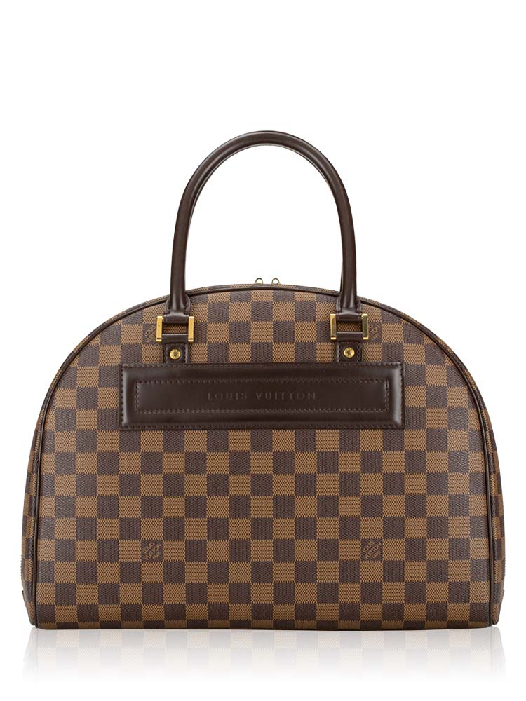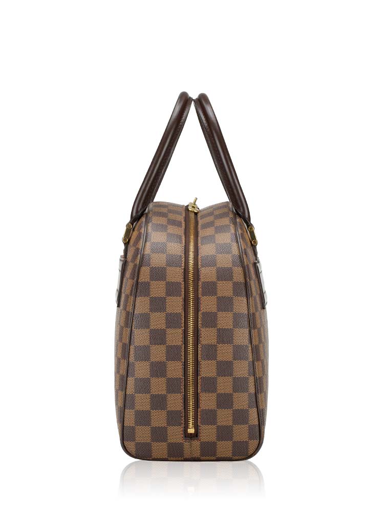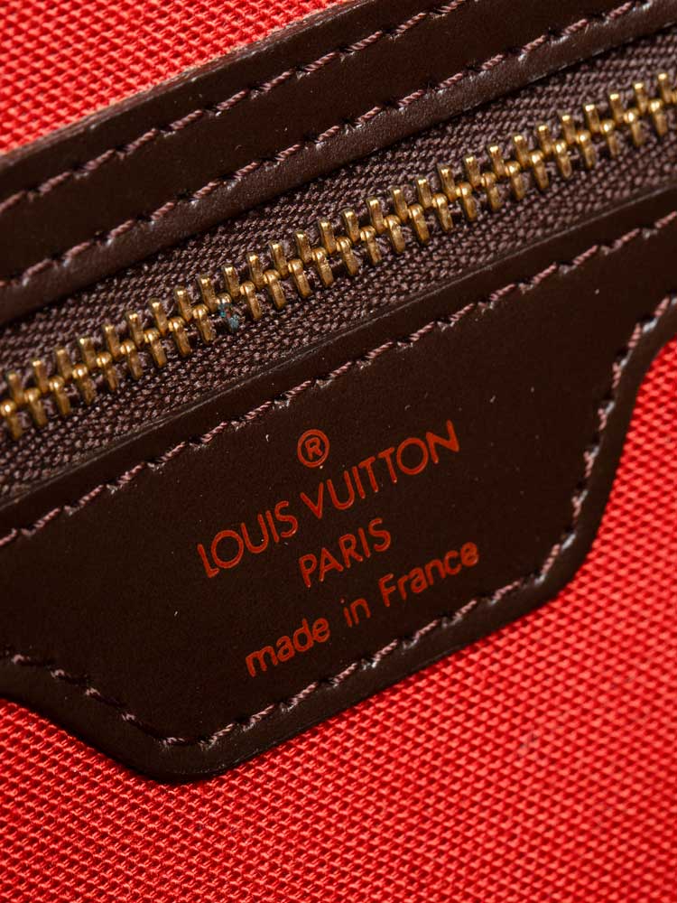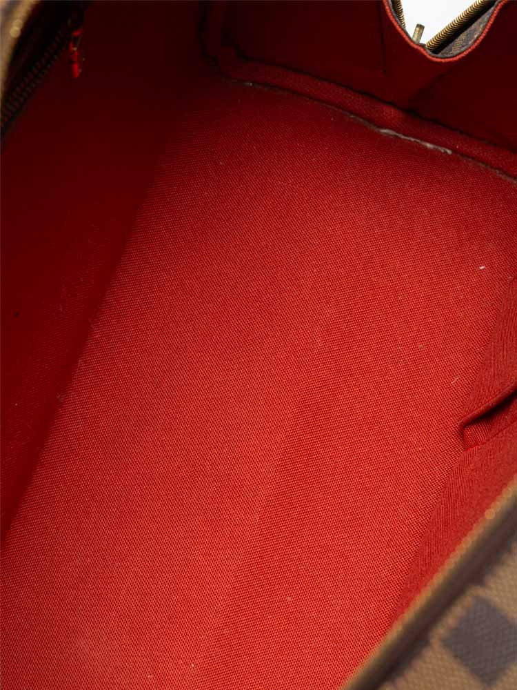 Crafted of Louis Vuitton Damier ebene coated canvas. Features rolled leather top handles and trim with polished brass hardware, and front pocket. The wrap-around zipper opens to a fabric interior with zipper and patch pockets.