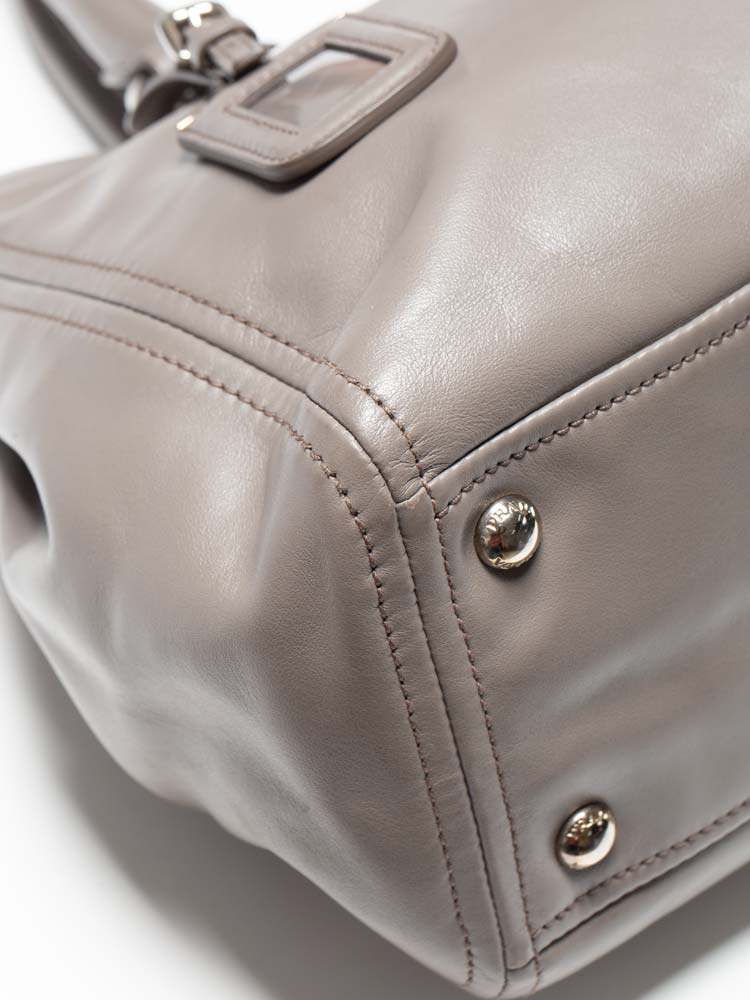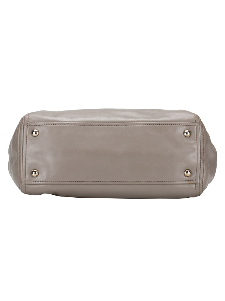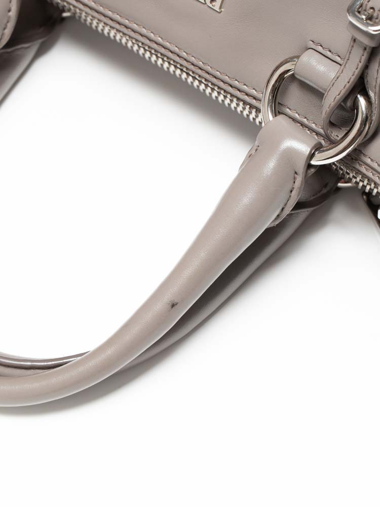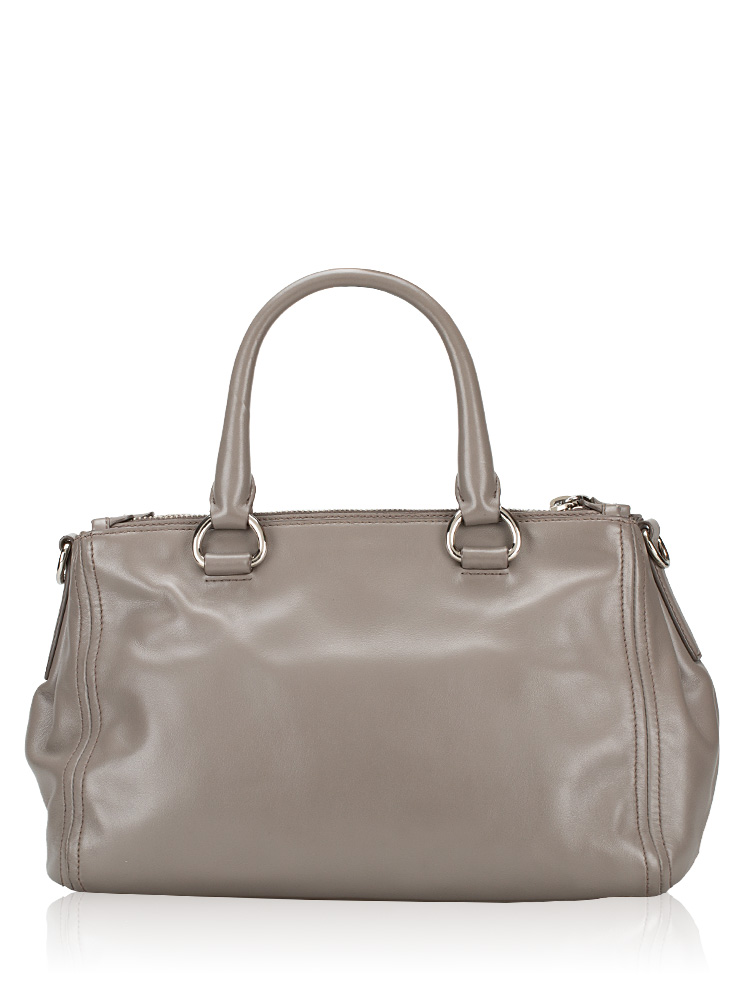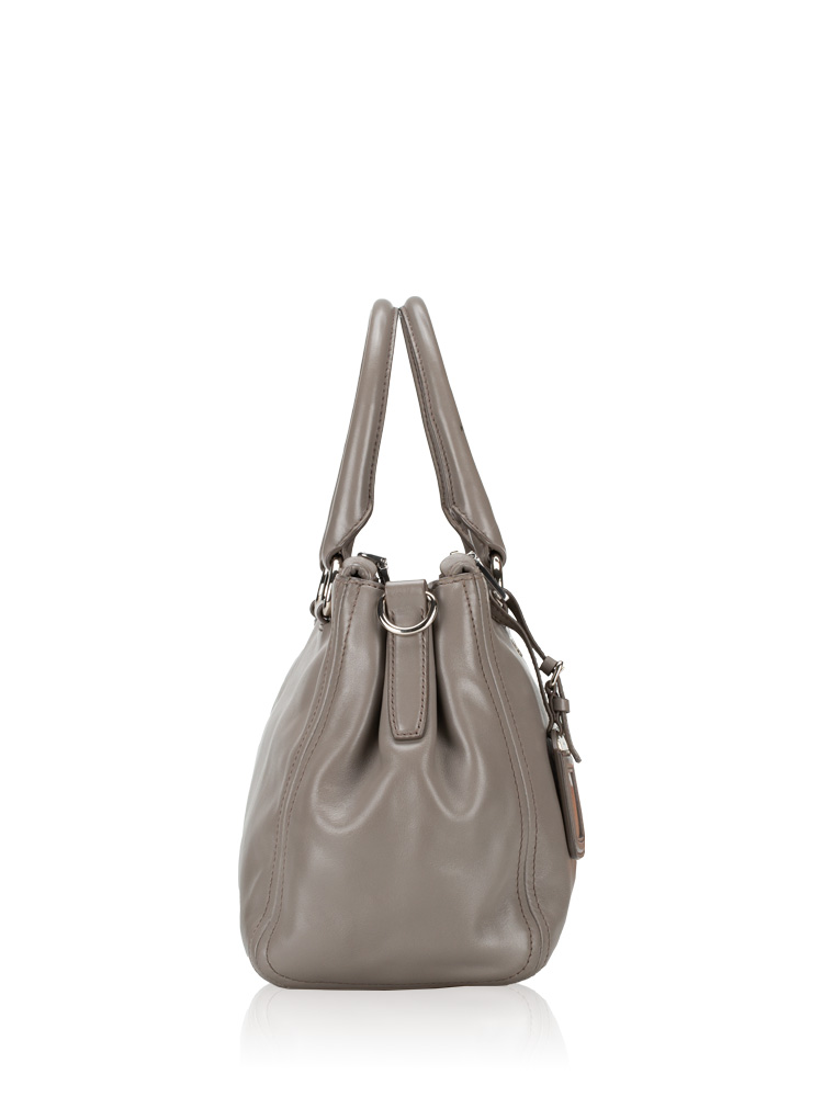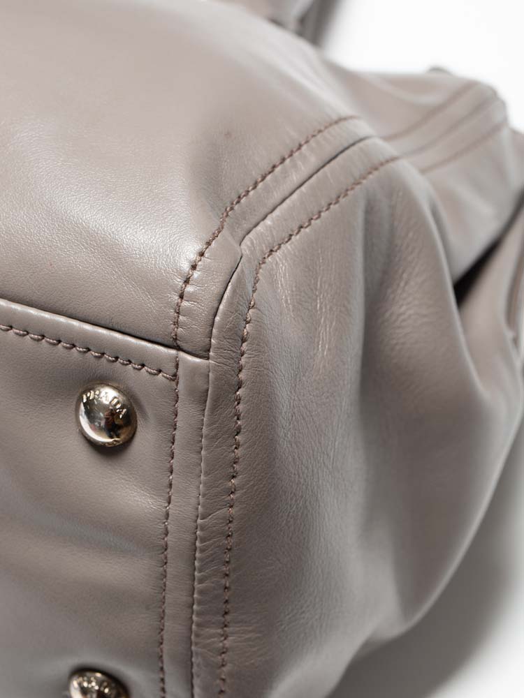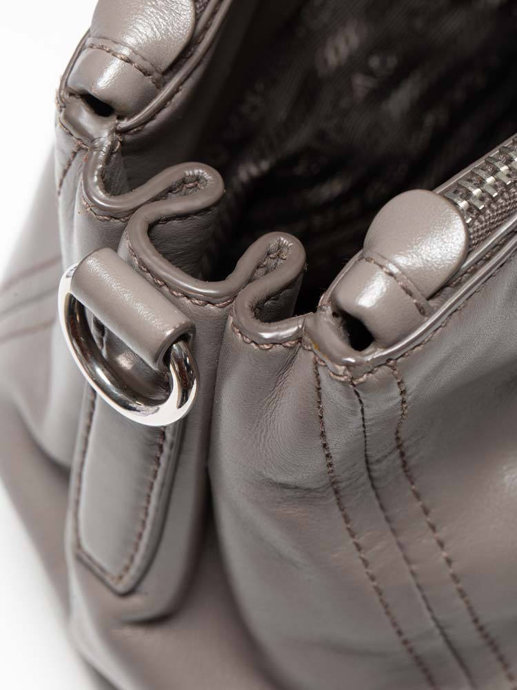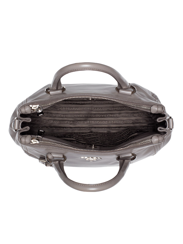 Crafted of soft calfskin leather. The bag features rolled leather top handles, an optional adjustable shoulder strap, and silver hardware. The top is open to a spacious Prada logo interior with zipper and patch pockets.