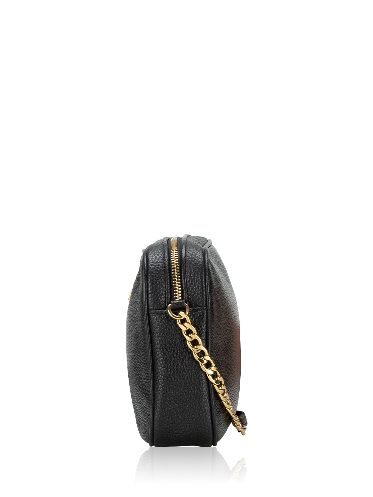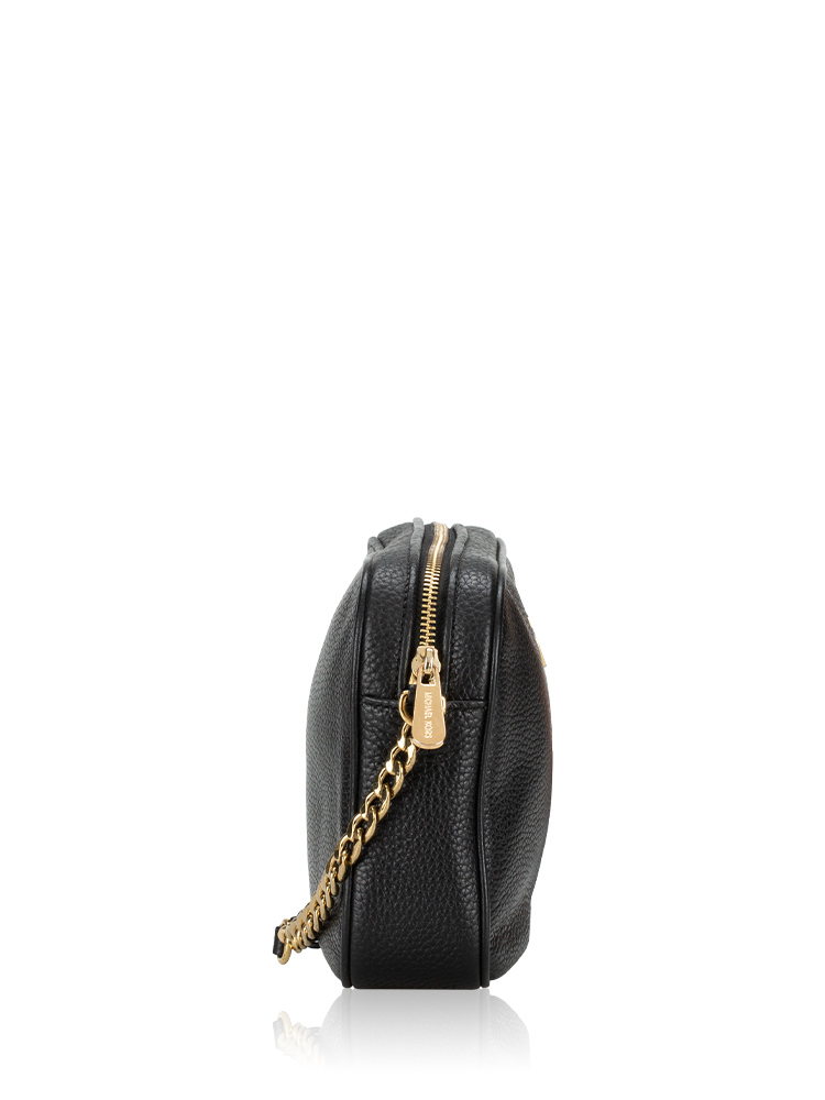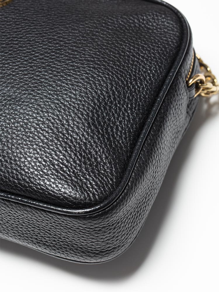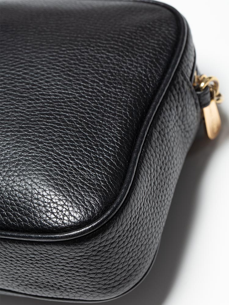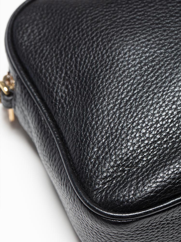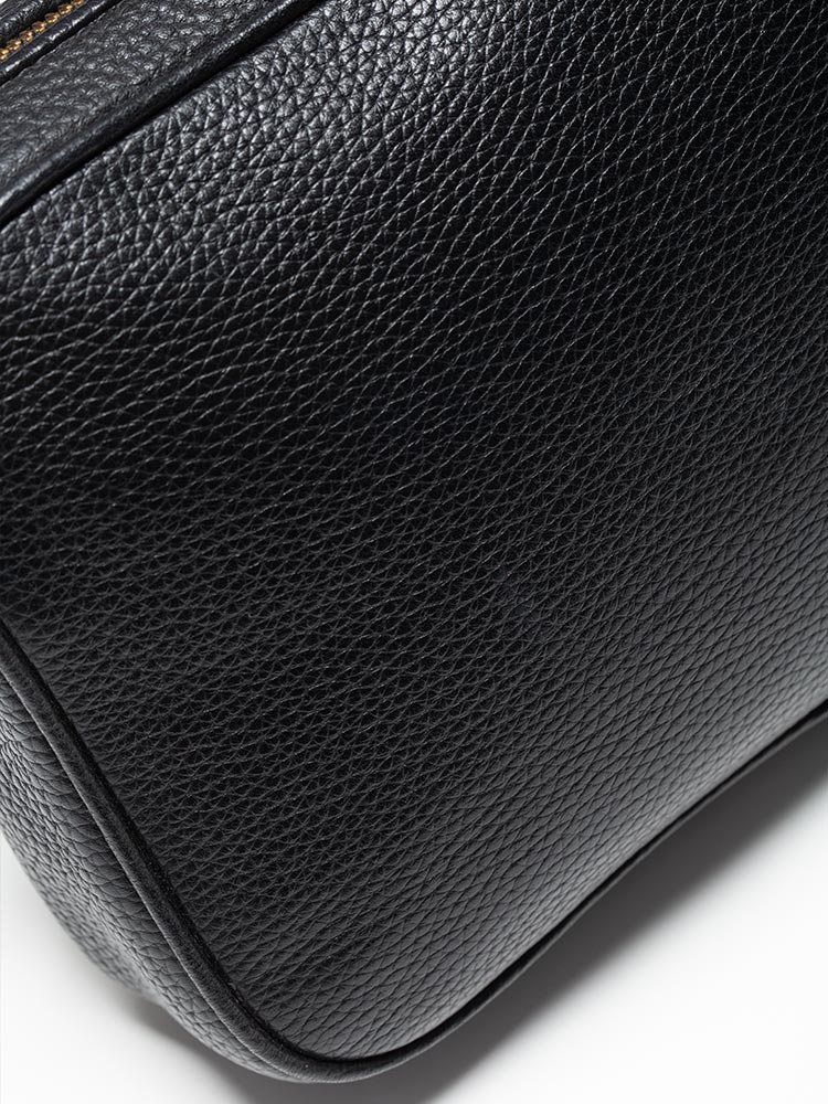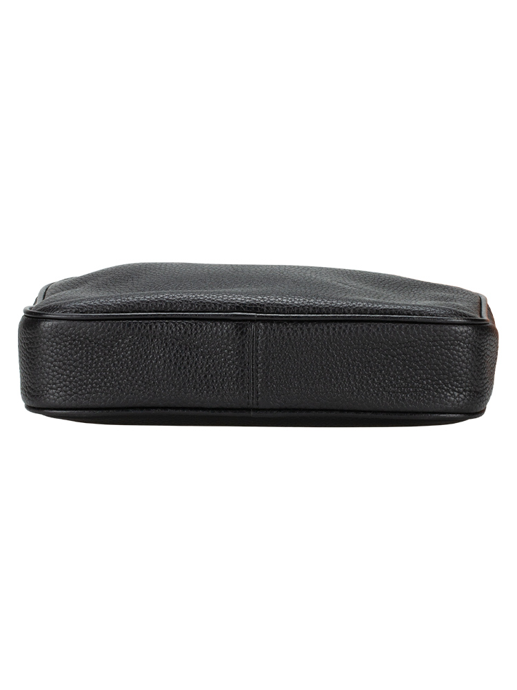 Made of pebble leather. The bag features a zip closure that opens to polyester lining with interior three slip pockets.