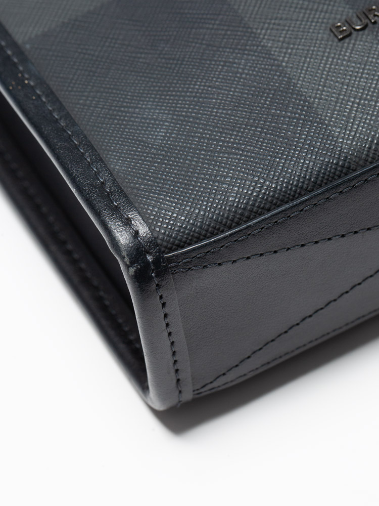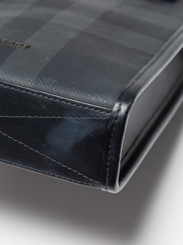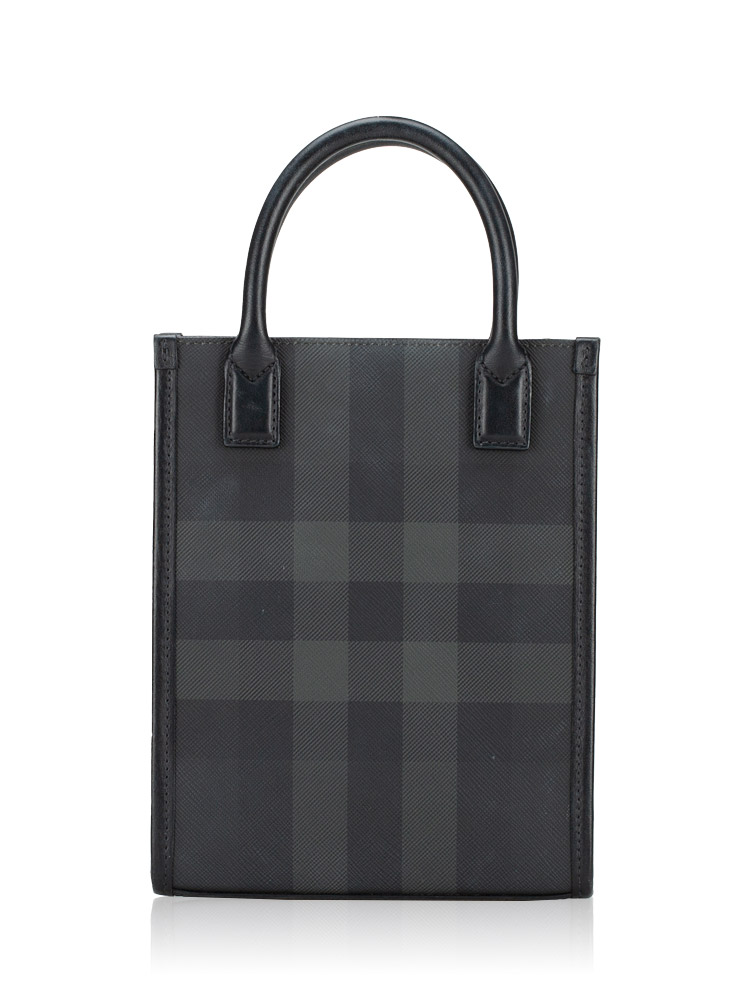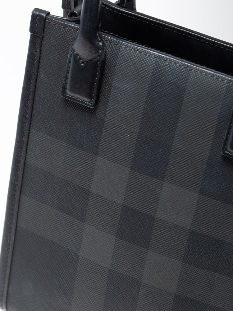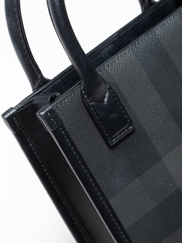 Crafted of Burberry London Check coated canvas. Features rolled leather top handles and leather trim. The top opens to fabric interior with patch pockets.