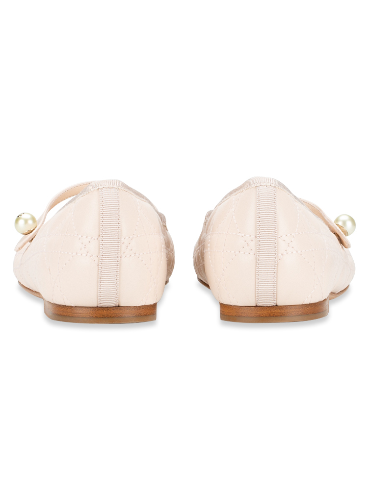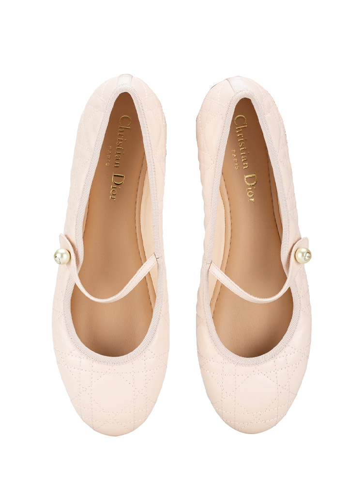 These flat shoes are crafted of calfskin material. It features strap and pearl with CD logo.