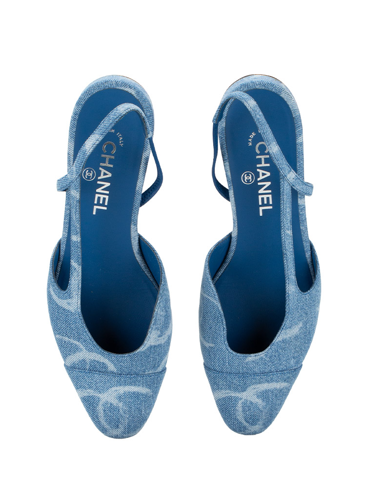These slingback pumps are crafted of blue denim, and feature a matching denim cap toe, multicolor CC logos, and 2.5 cm heel.