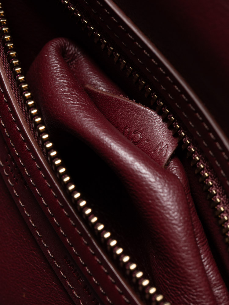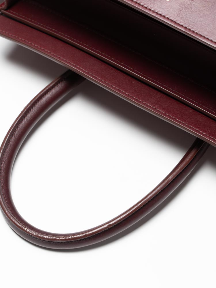 Crafted of calfskin material. The bag features with double top handles, expandable sides, a frontal zipper pocket, and decorative leather trim. The bag opens to a leather lining with slip and zipper pockets.