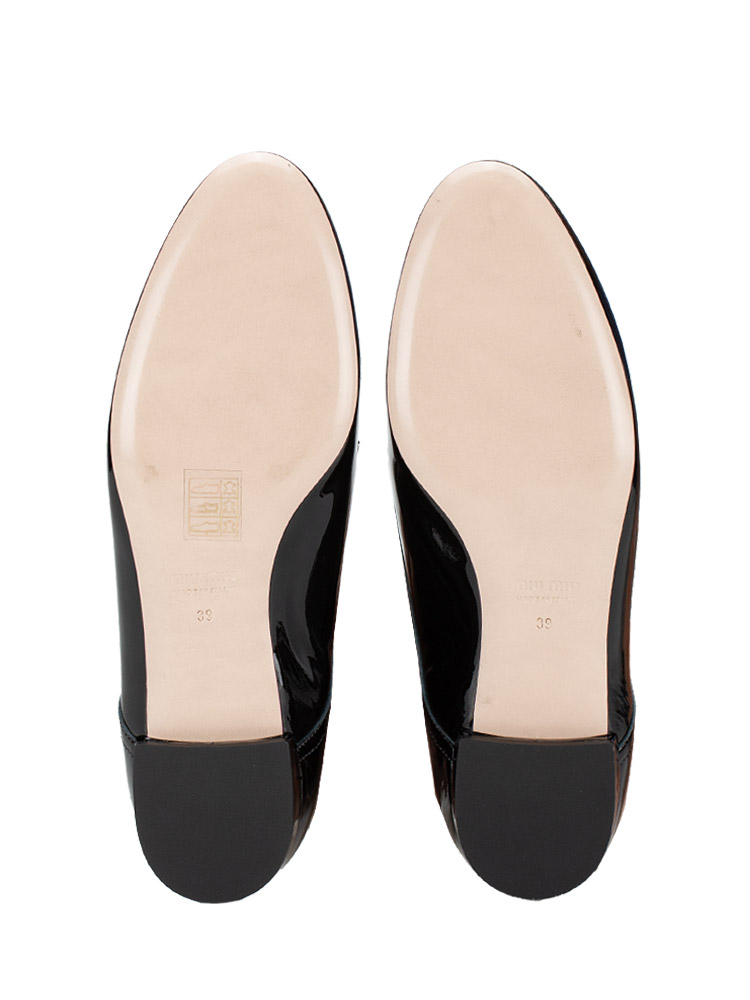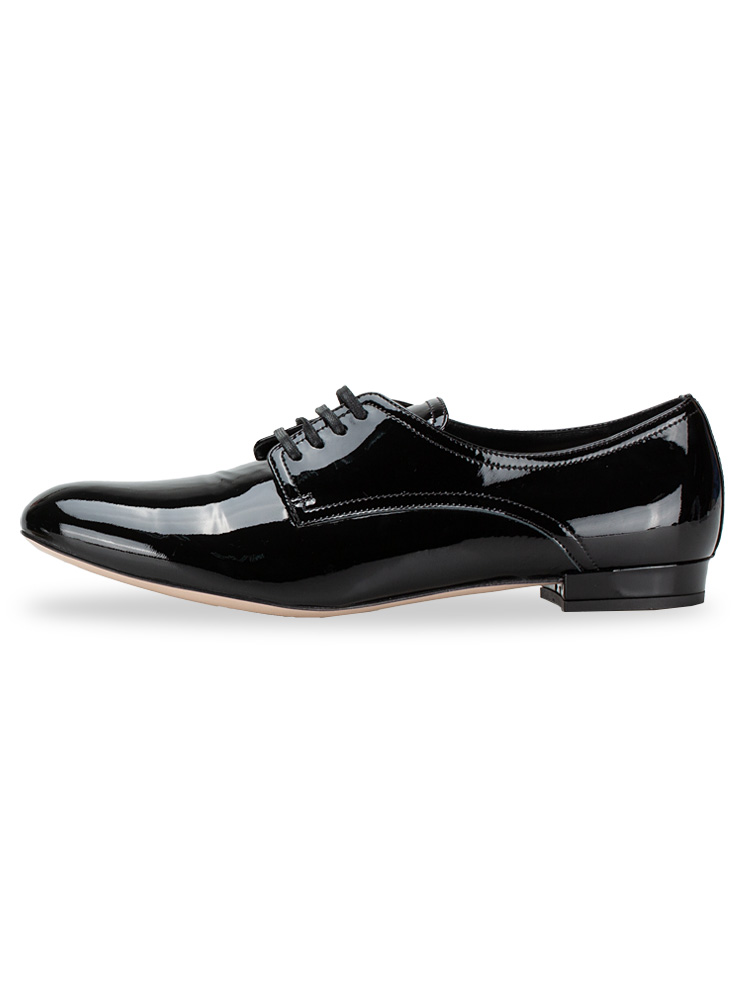 Crafted of patent leather with a leather insole. and front lace detailing on the front.