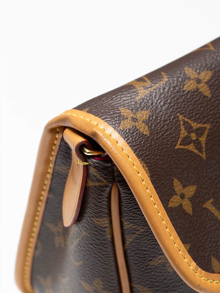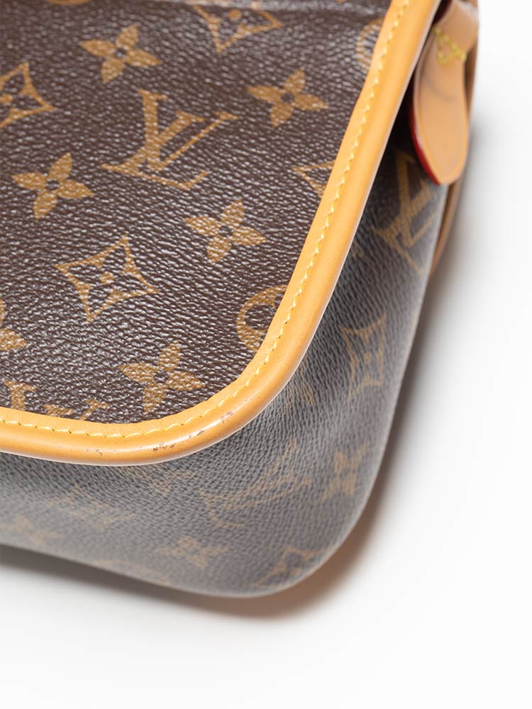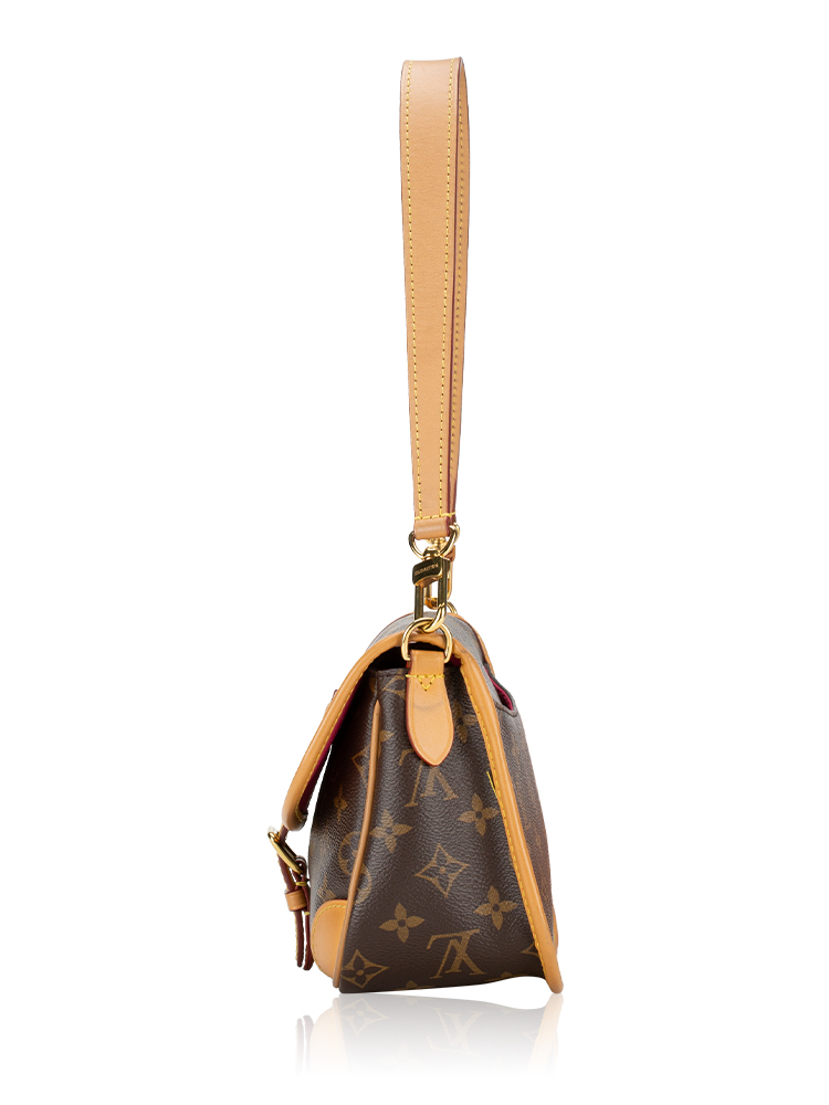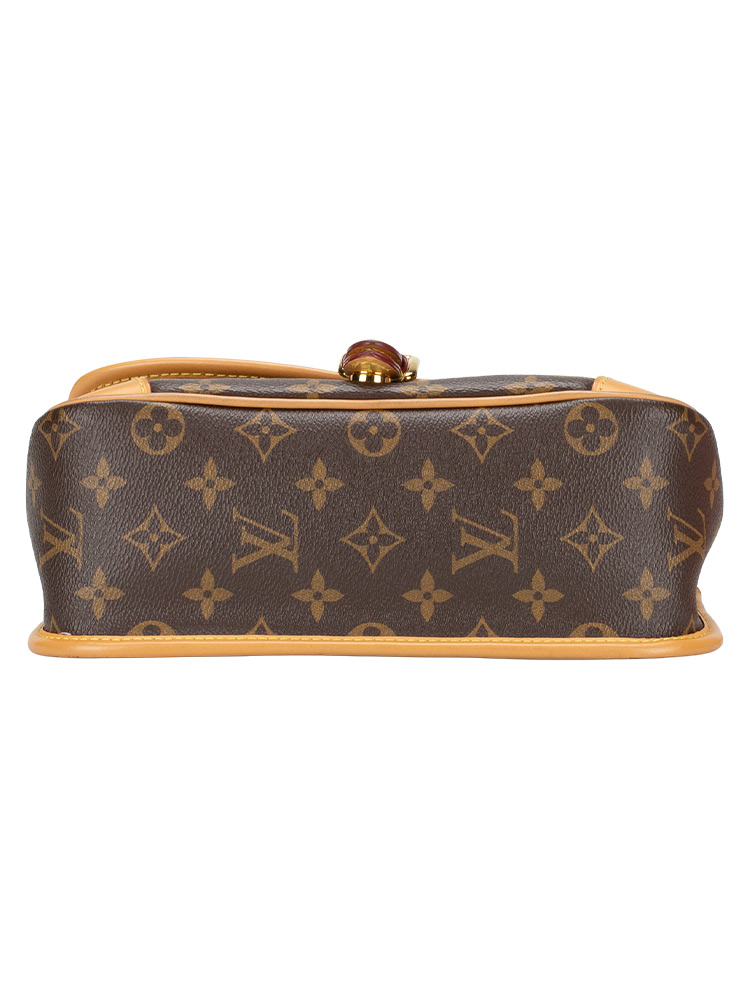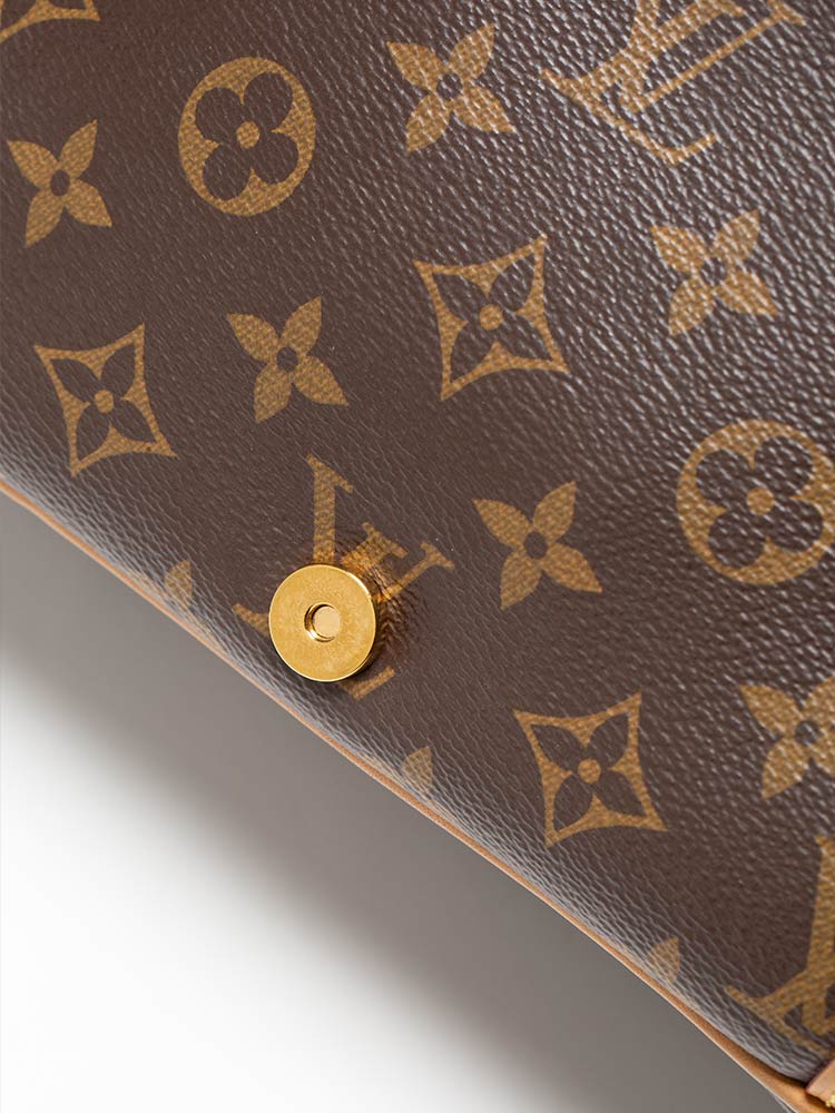 Crafted of Louis Vuitton monogram coated canvas. The bag features a vachetta cowhide top handle, and brass hardware. The crossover flap opens to a fabric interior with zip pockets.