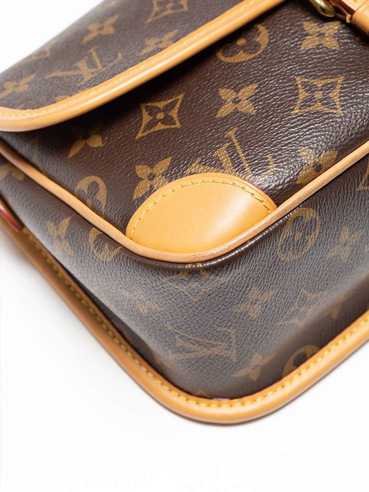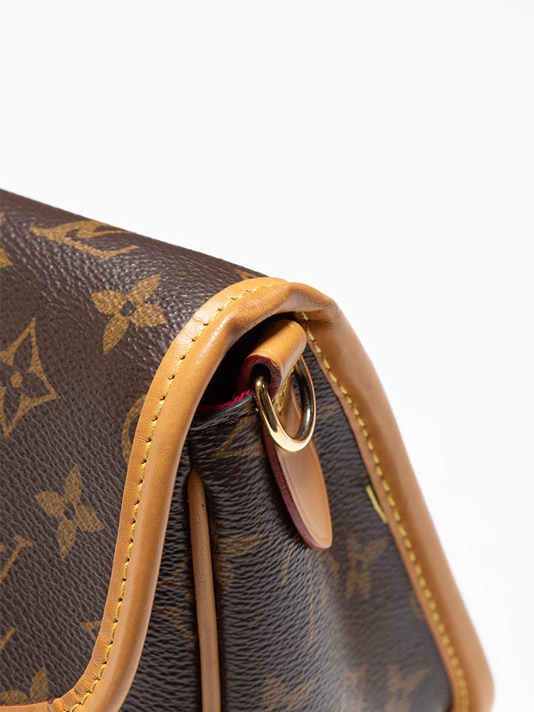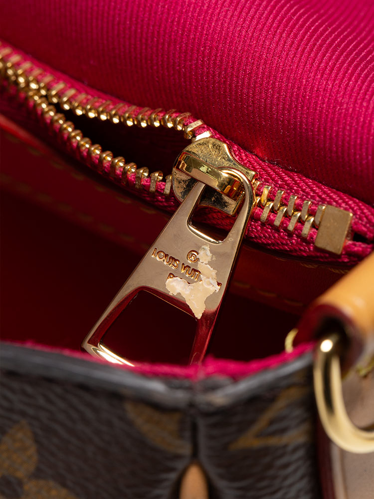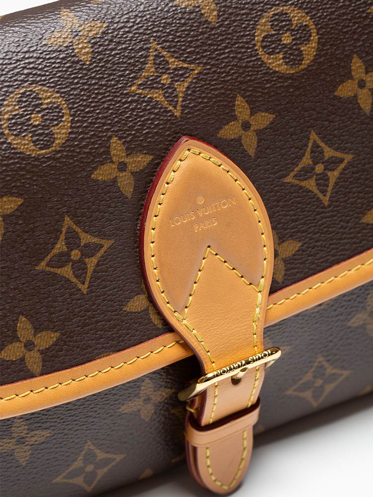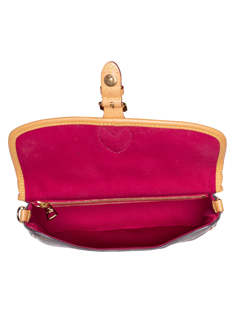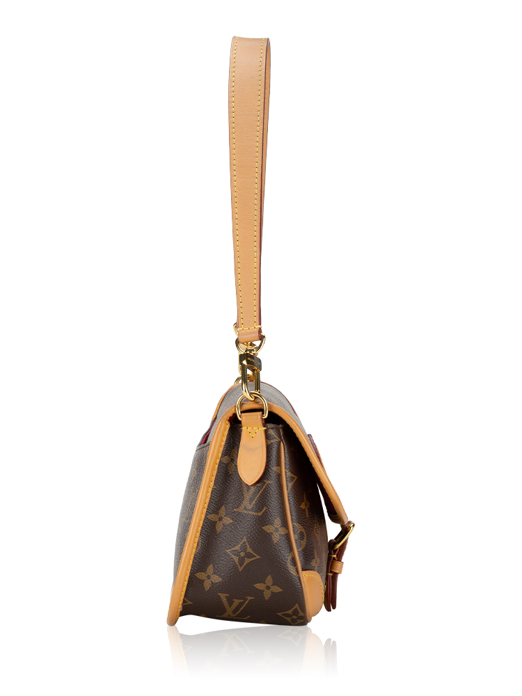 Crafted of Louis Vuitton monogram coated canvas. The bag features a vachetta cowhide top handle, and brass hardware. The crossover flap opens to a fabric interior with zip pockets.