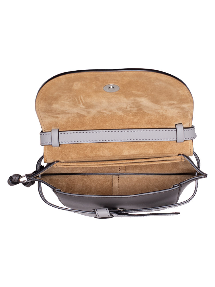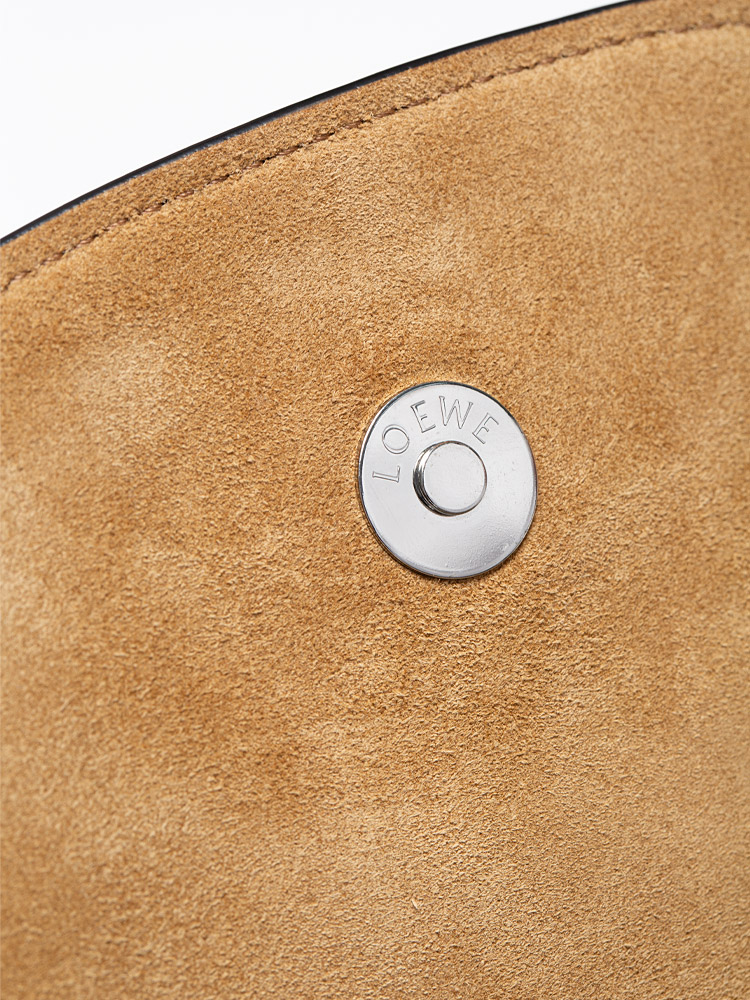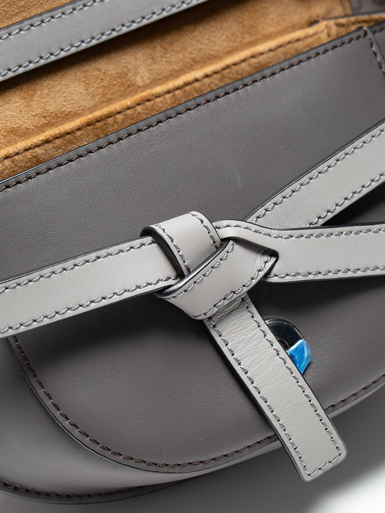 Crafted of smooth calfskin leather. The bag features a front knotted detail that holds the front flap, an adjustable jacquard Loewe logo strap and polished silver hardware. The flap opens up to a suede interior with a patch pocket.