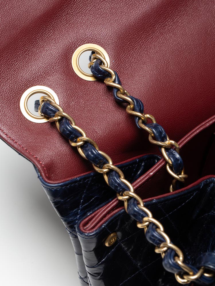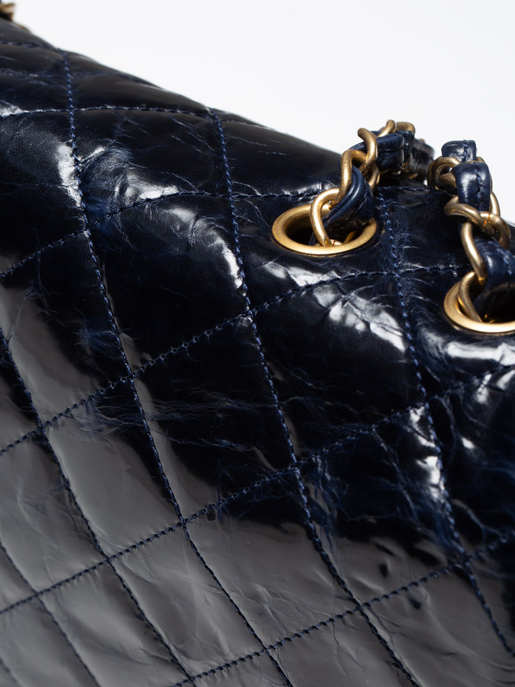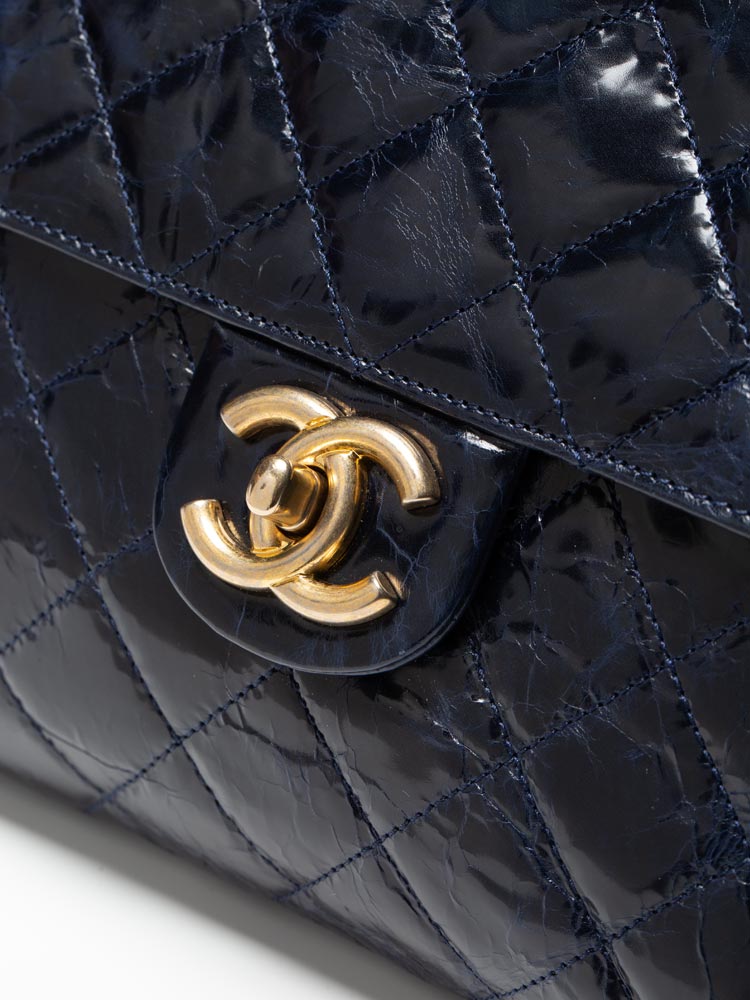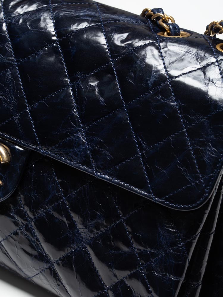 Crafted of quilted crackled glazed calfskin leather. The bag features a leather aged gold chain link shoulder strap and a aged gold Chanel CC turn lock for the frontal half flap. The flap opens to a leather interior with a zipper and patch pocket.