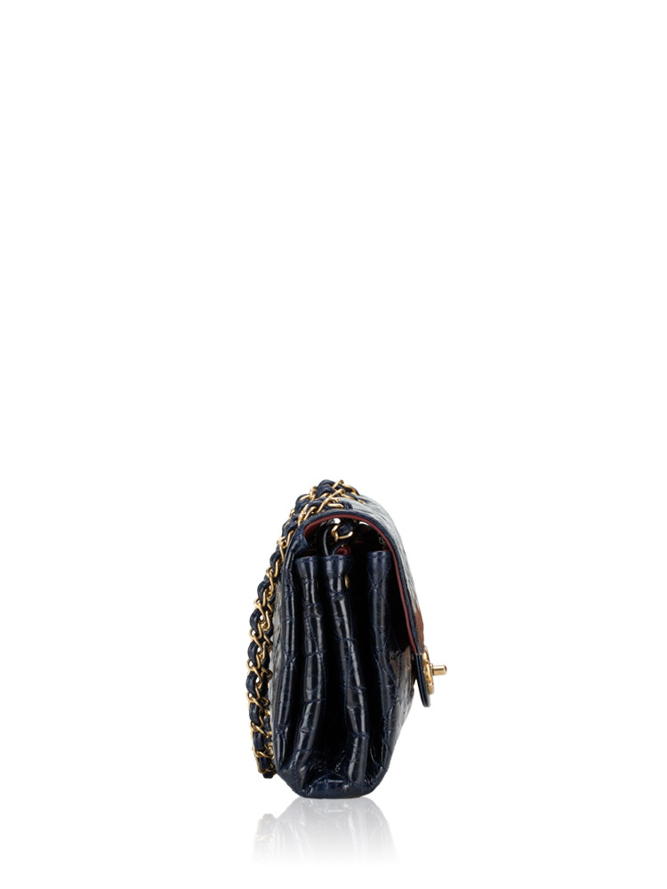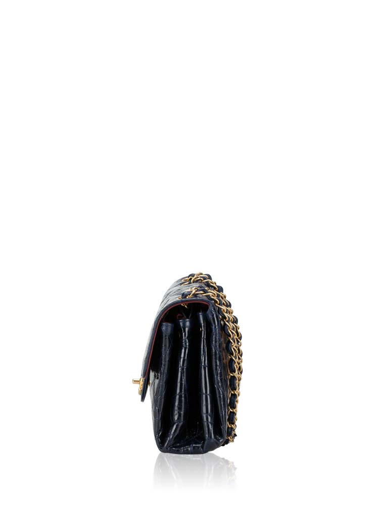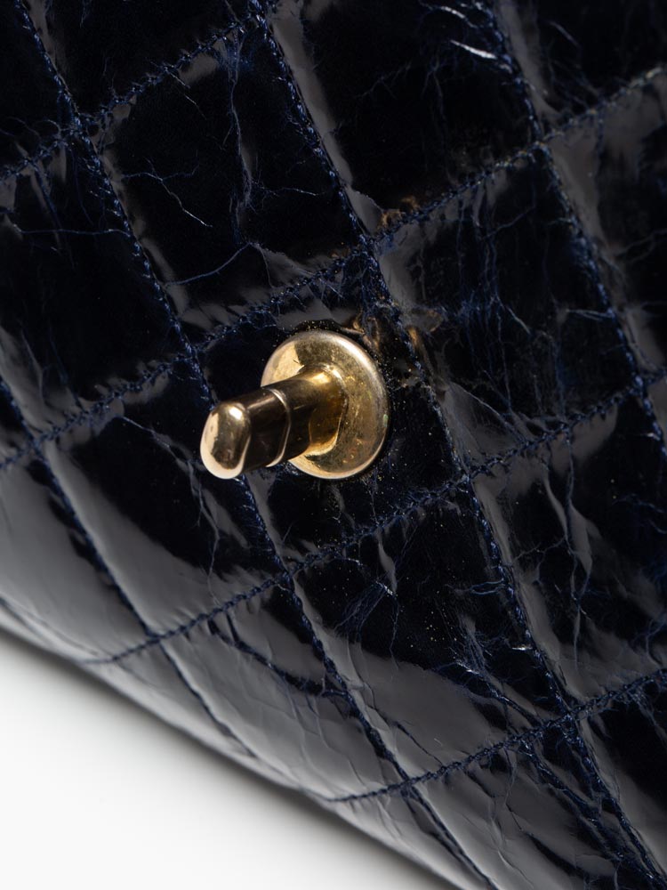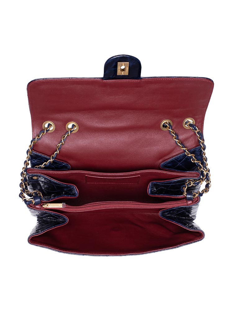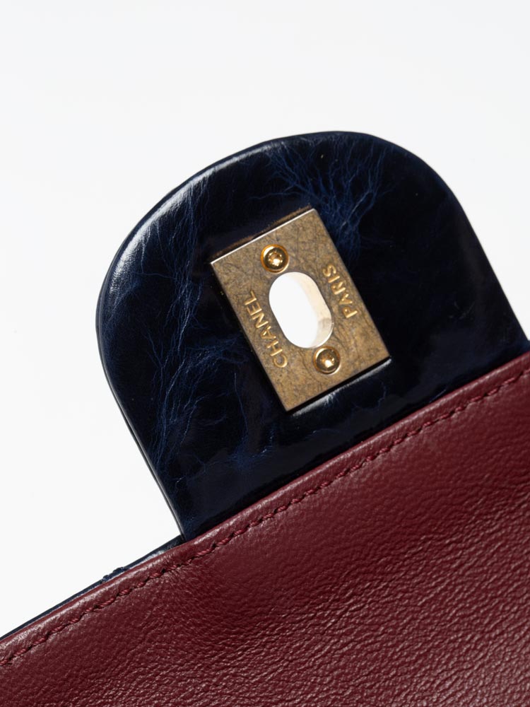 Crafted of quilted crackled glazed calfskin leather. The bag features a leather aged gold chain link shoulder strap and a aged gold Chanel CC turn lock for the frontal half flap. The flap opens to a leather interior with a zipper and patch pocket.