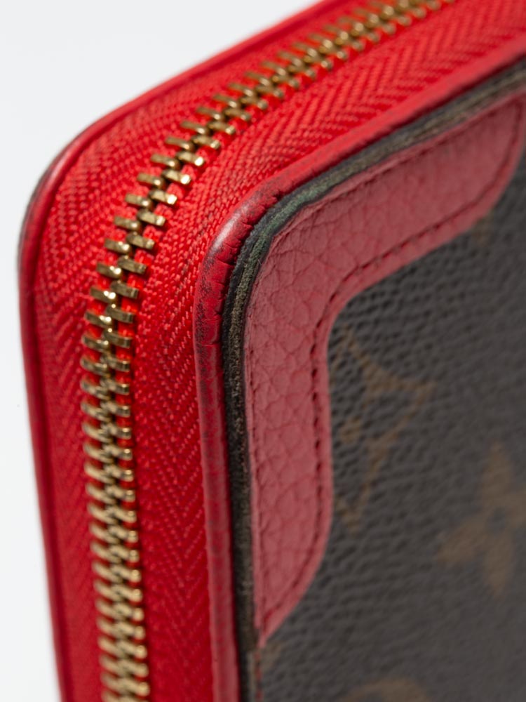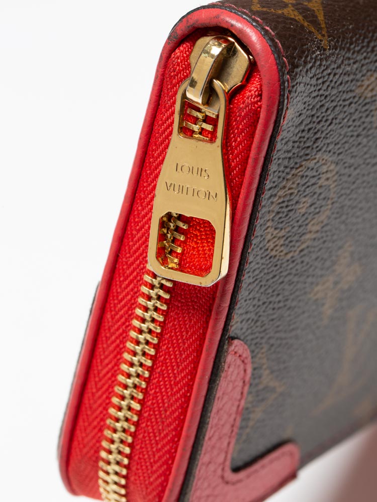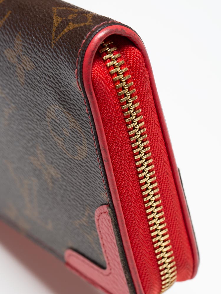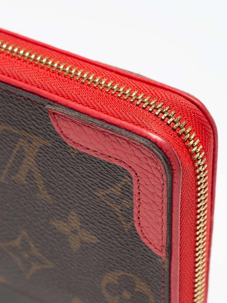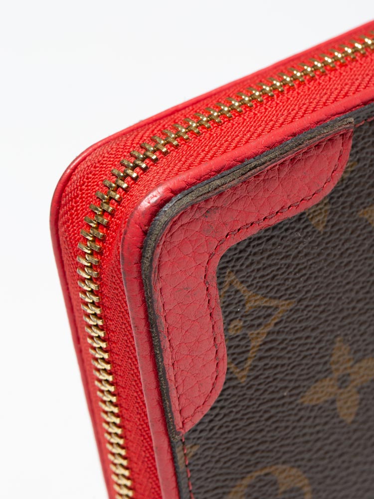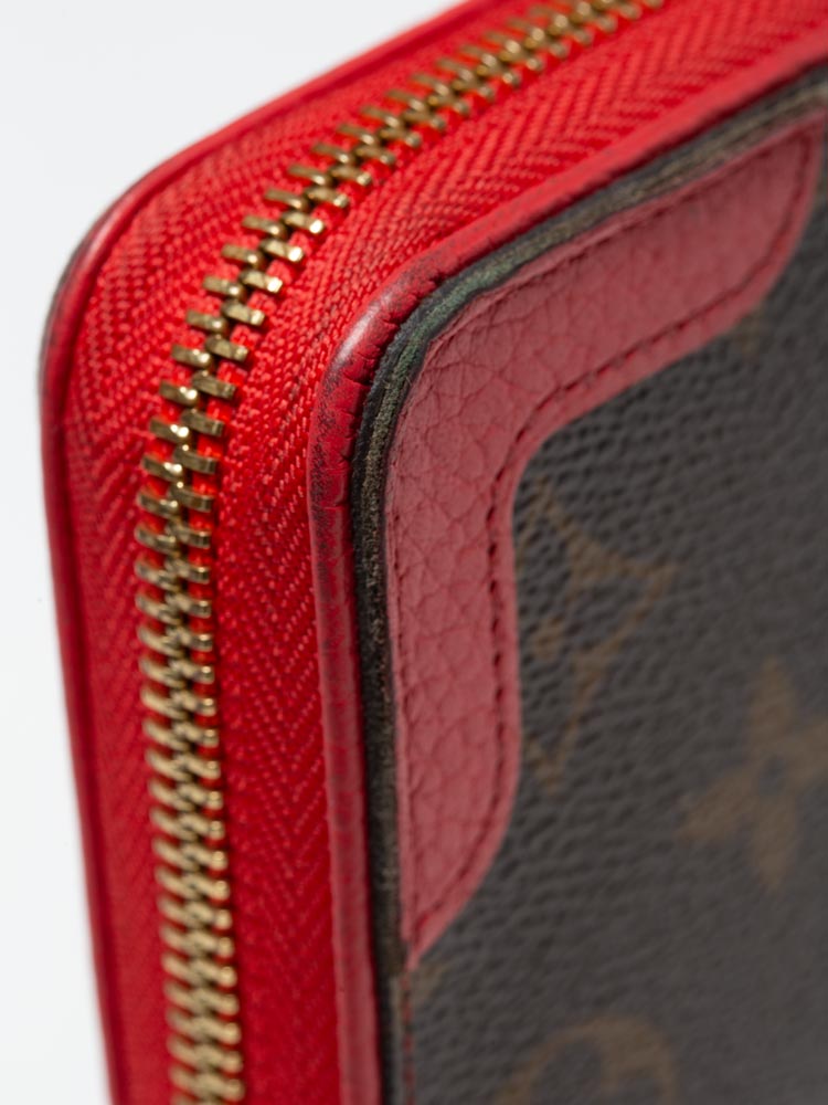 Crafted of traditional monogram-coated canvas with leather corner trim. It opens with a zipper to a cross-grain leather interior with multiple credit card slots, a zippered pocket, and two main compartments.