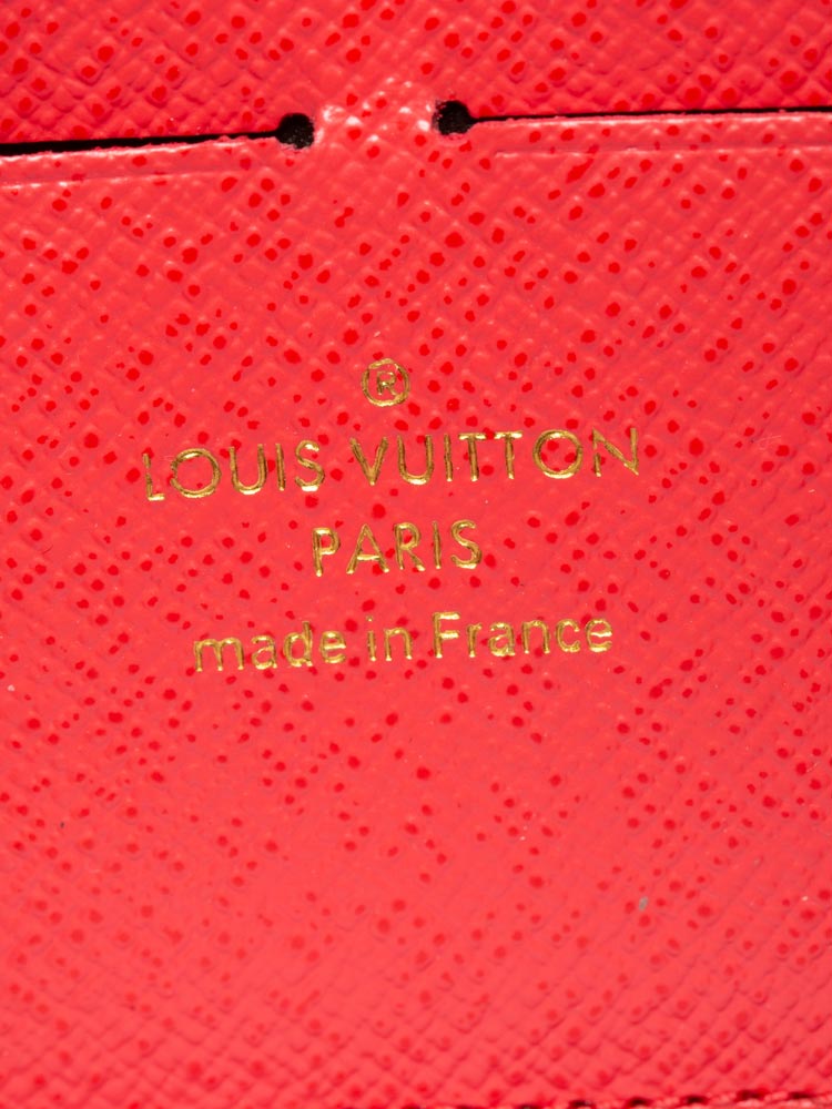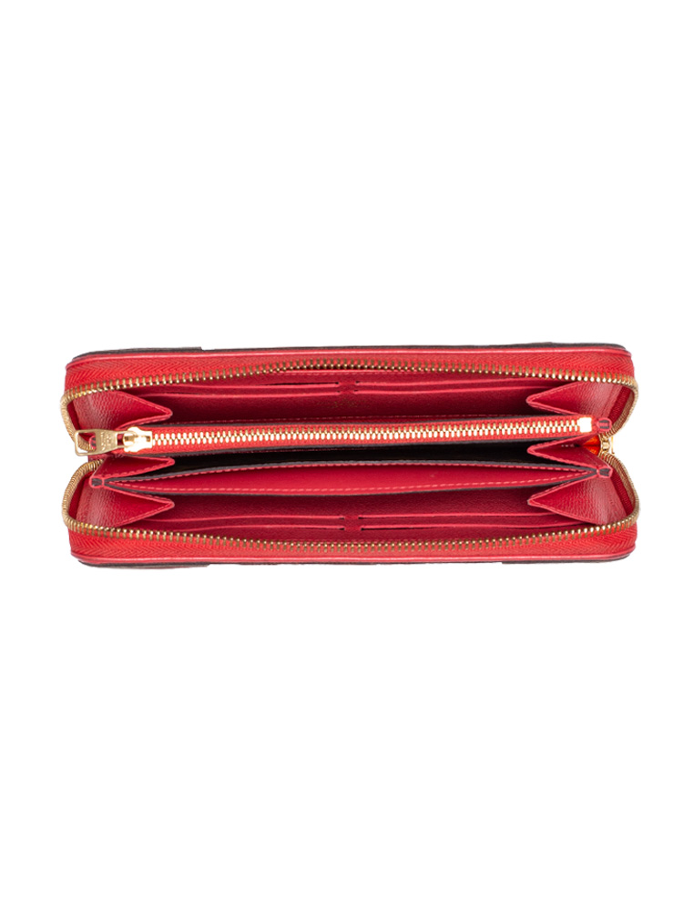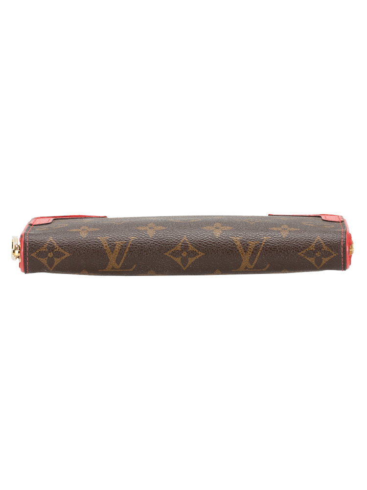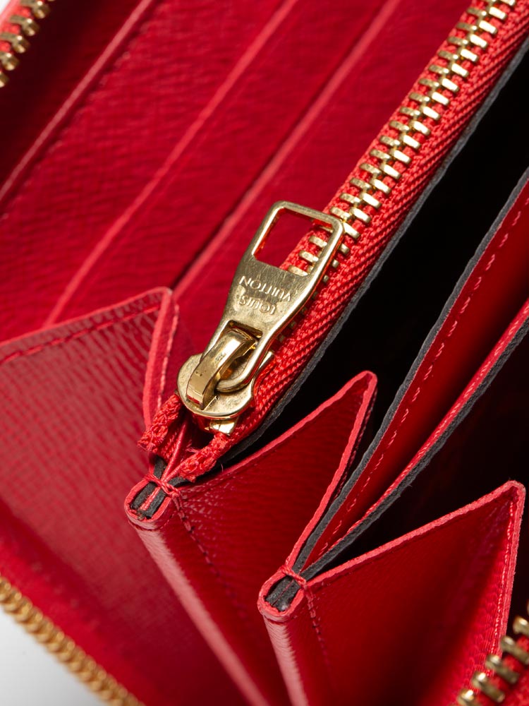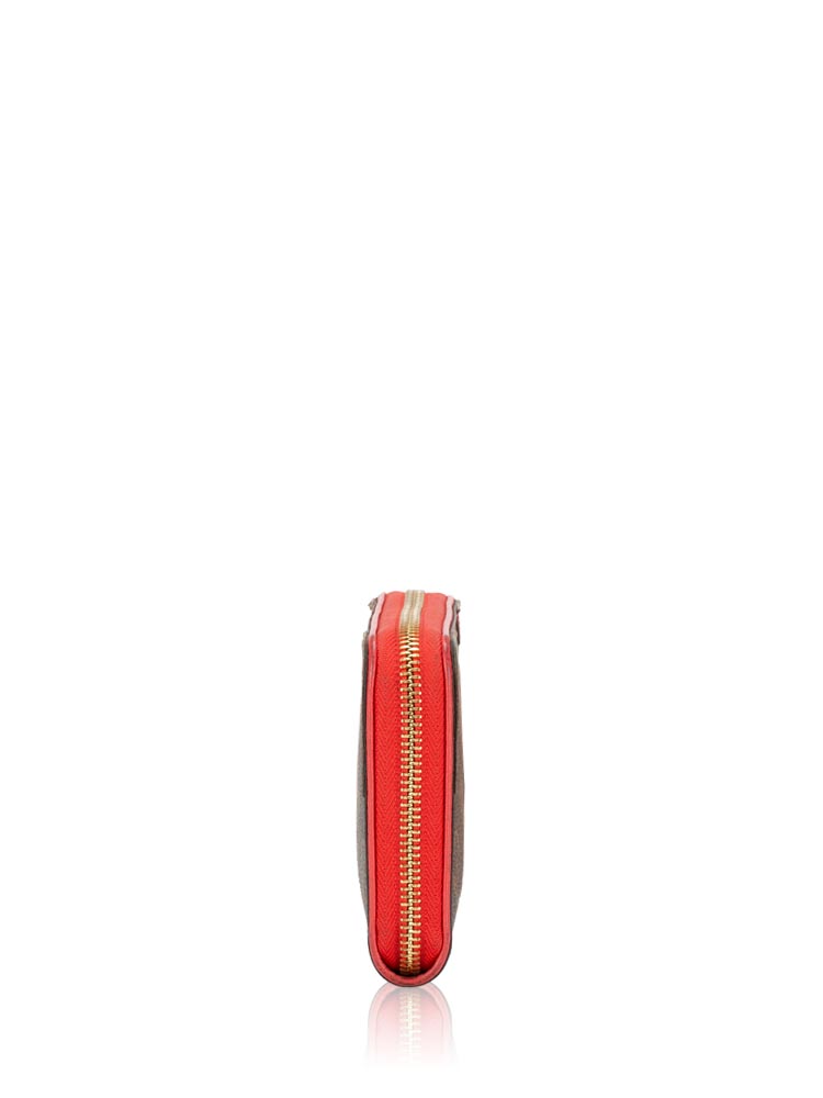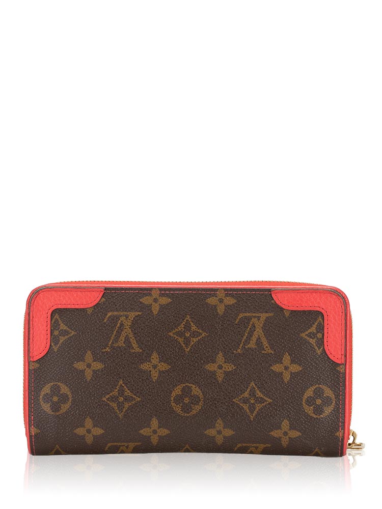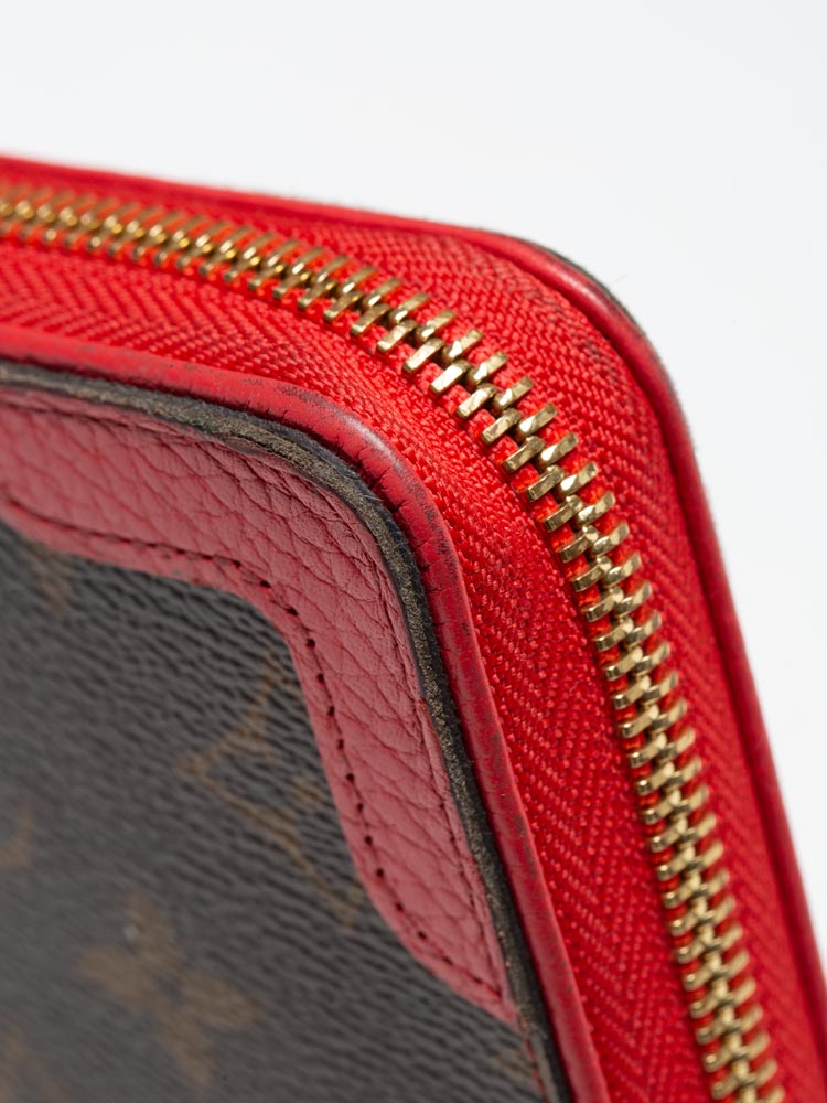 Crafted of traditional monogram-coated canvas with leather corner trim. It opens with a zipper to a cross-grain leather interior with multiple credit card slots, a zippered pocket, and two main compartments.