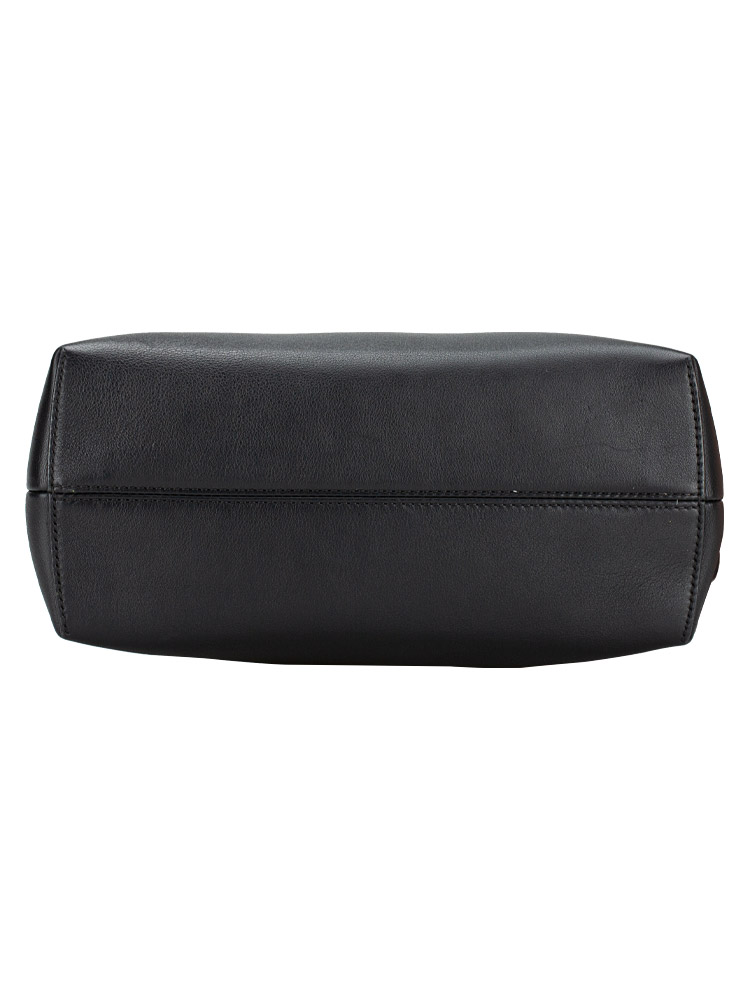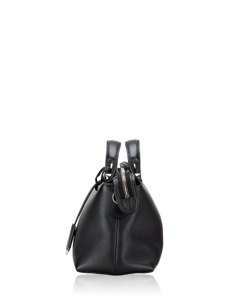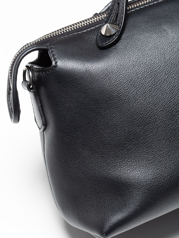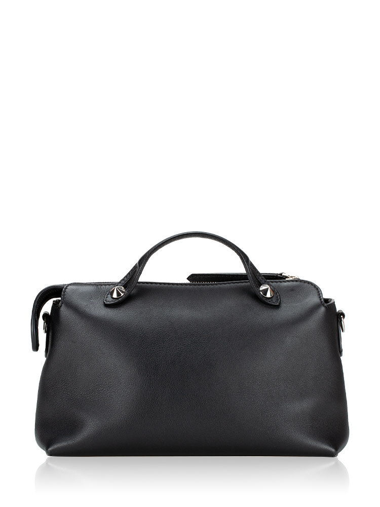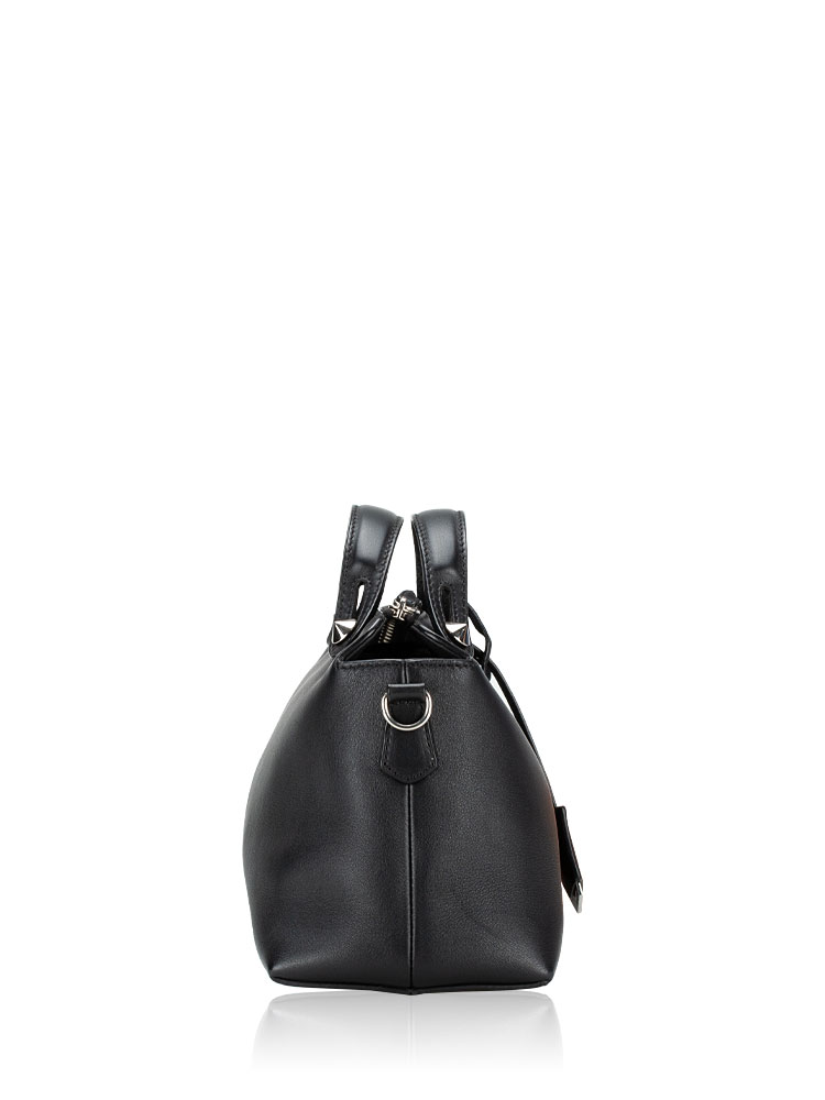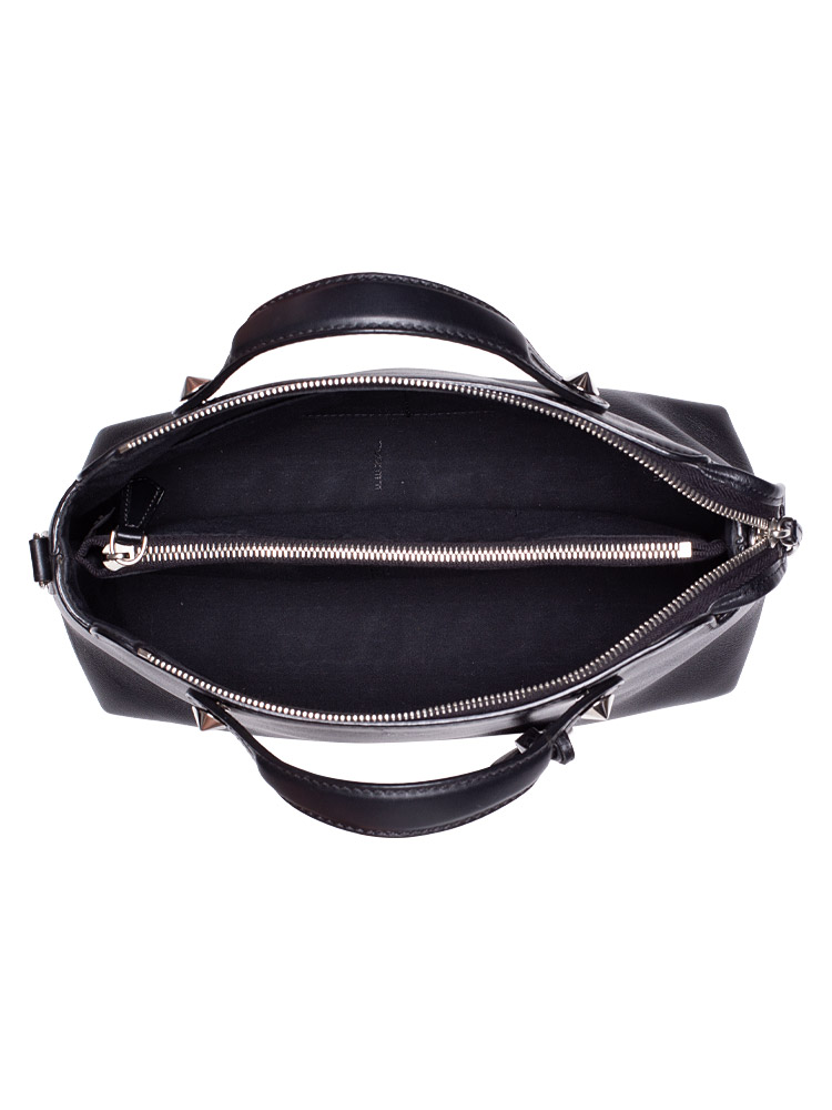 Crafted of calfskin leather. It features top handles with polished studs and a shoulder strap with adjustable clasps. The top zipper opens to a partitioned jacquard interior with a zipper compartment and slip pockets.