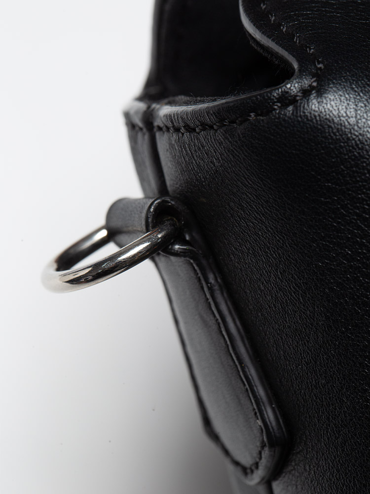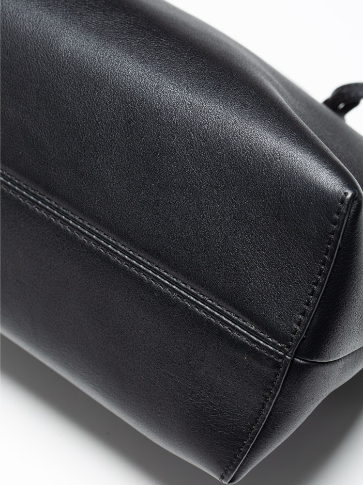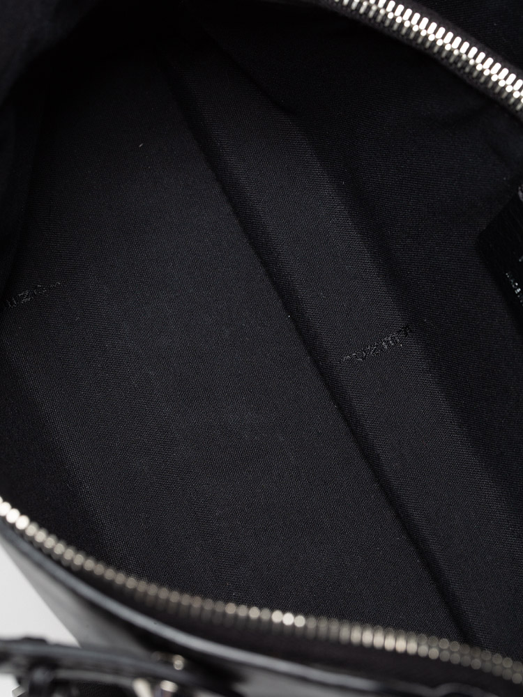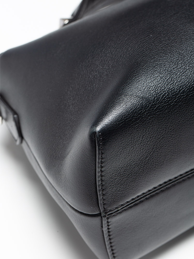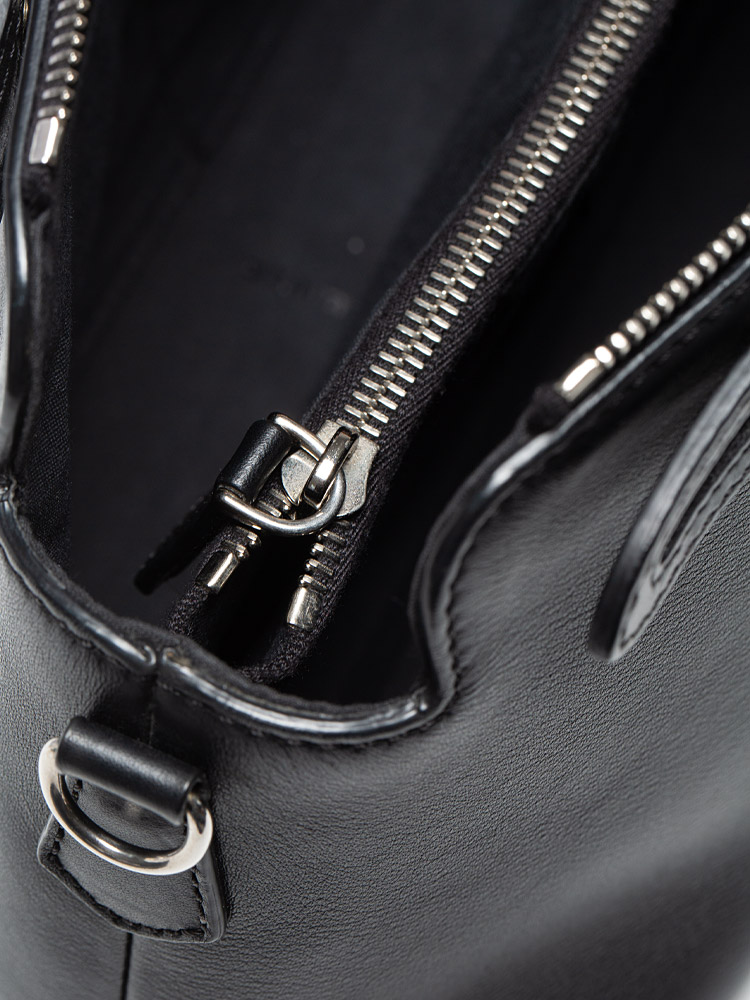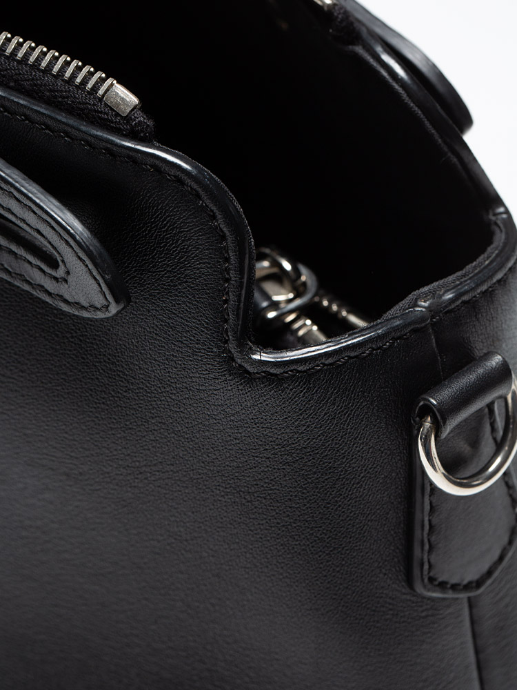 Crafted of calfskin leather. It features top handles with polished studs and a shoulder strap with adjustable clasps. The top zipper opens to a partitioned jacquard interior with a zipper compartment and slip pockets.