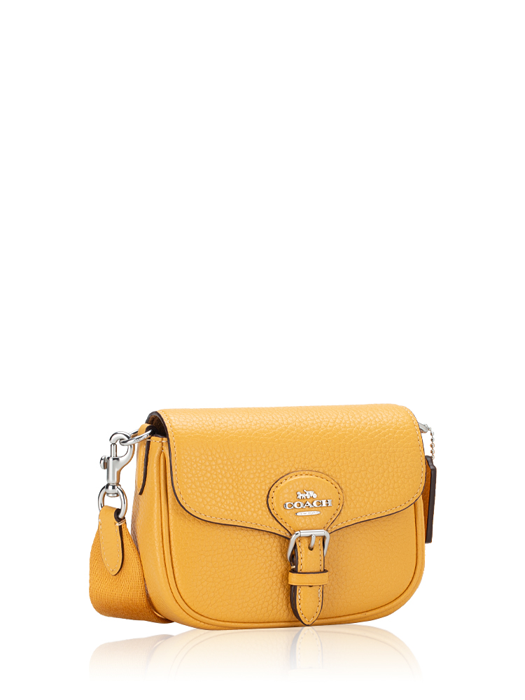 Made of pebbled leather. The bag features a flap with magnetic closure that opens to suede lining with two slip pocket, exterior one slip pocket at back, adjustable and removable long strap.