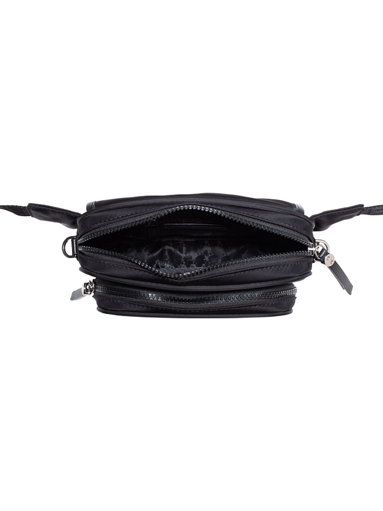 Made of nylon with ikonik polyester lining. The bag features an zip closure, silver tone hardware, one zip pocket, one eksterior front zip pocket, and four card slips.