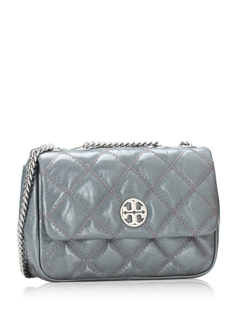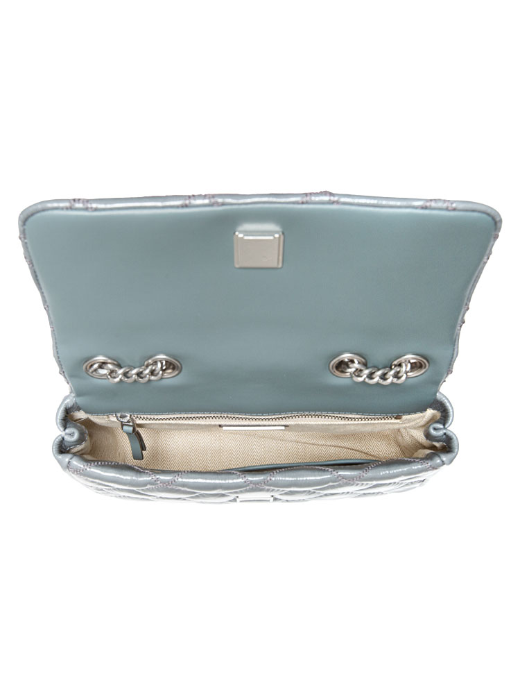 Crafted of textured quilted leather with fabric lining. The bag features an open magnetic flap closure, silver tone hardware, one zip pocket, one slip pocket, and one rear eksterior slip pocket.