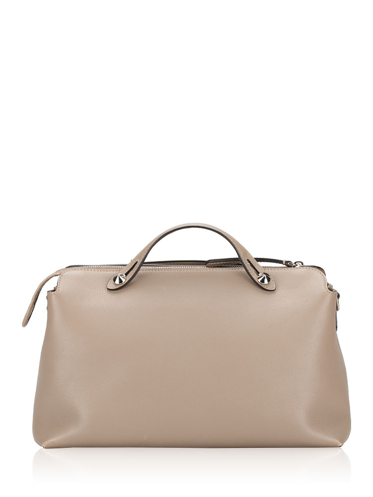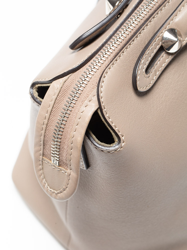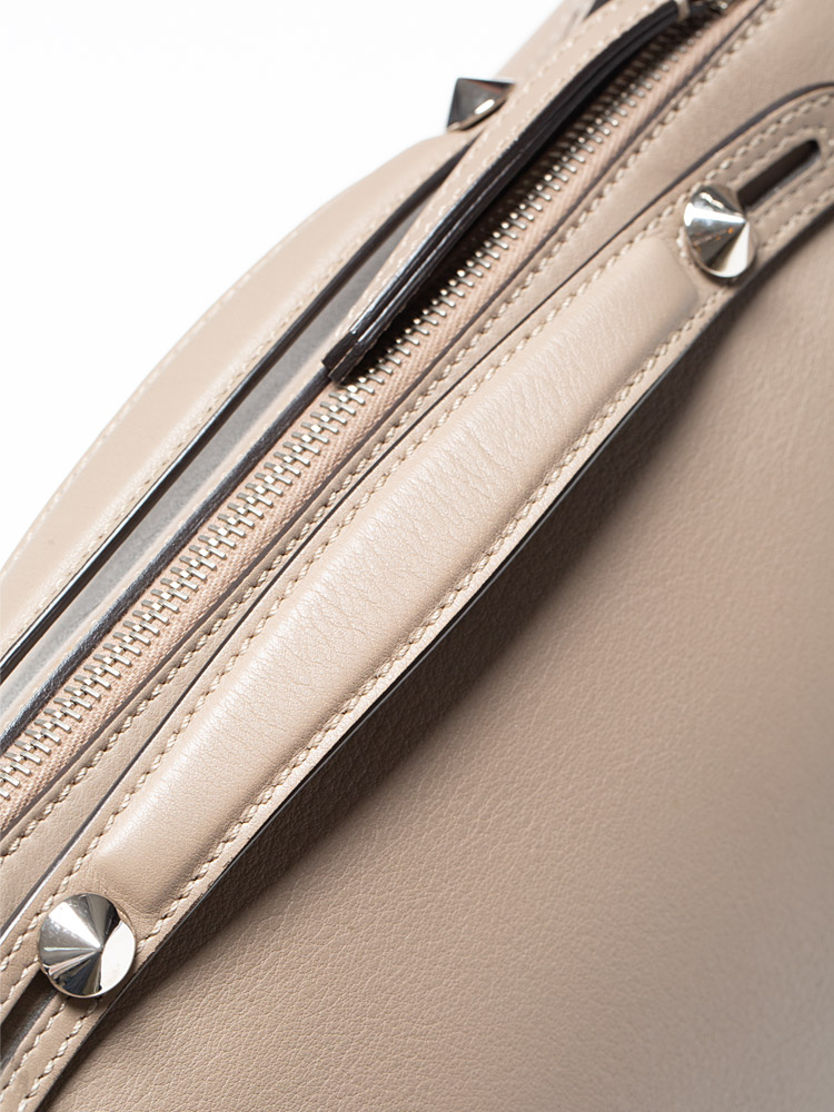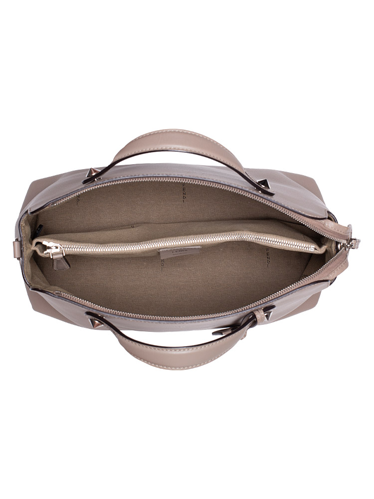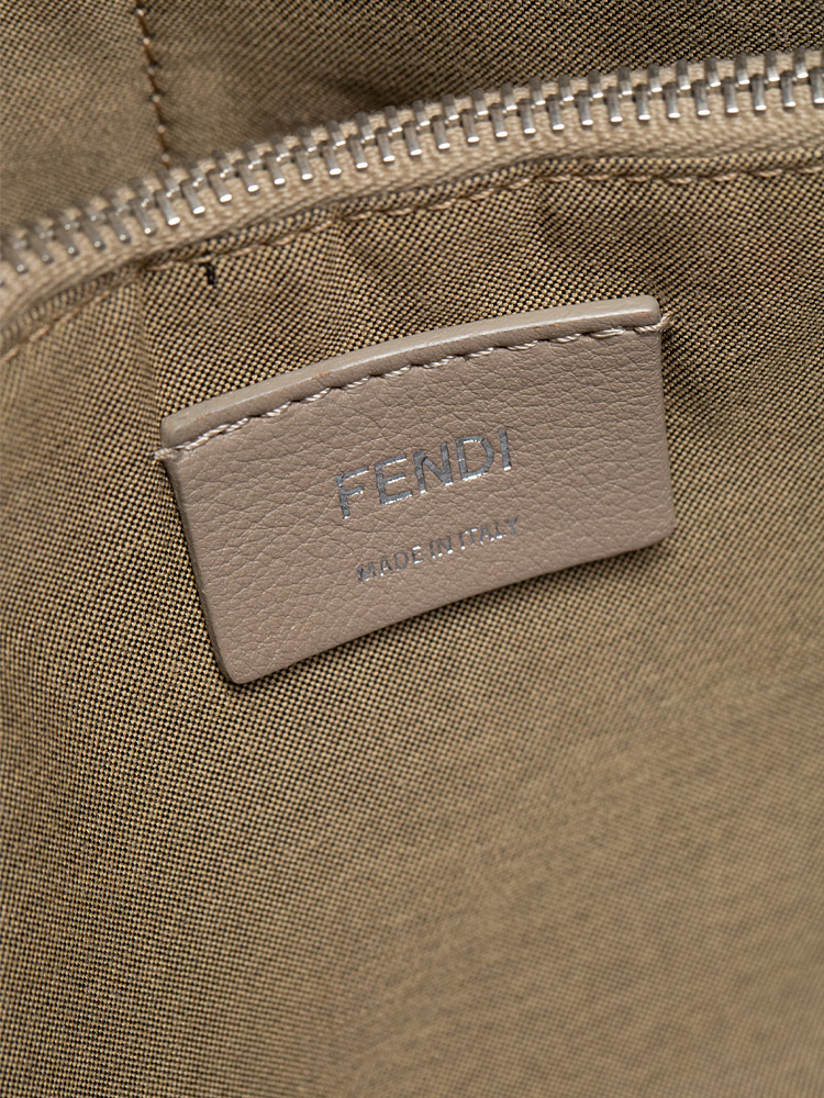 This bag is crafted of calfskin leather material. It features double top handles, an optional adjustable shoulder strap, and Fendi stamp at front. The top zipper opens to a jacquard lining with patch and zipper pockets.