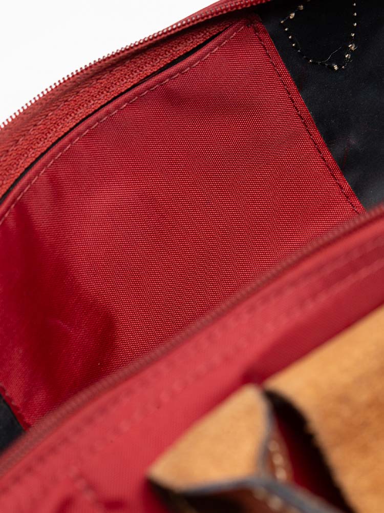 Made of nylon material. The bag features a zip closure with flap button closure that opens to nylon lining with interior two slip pockets.