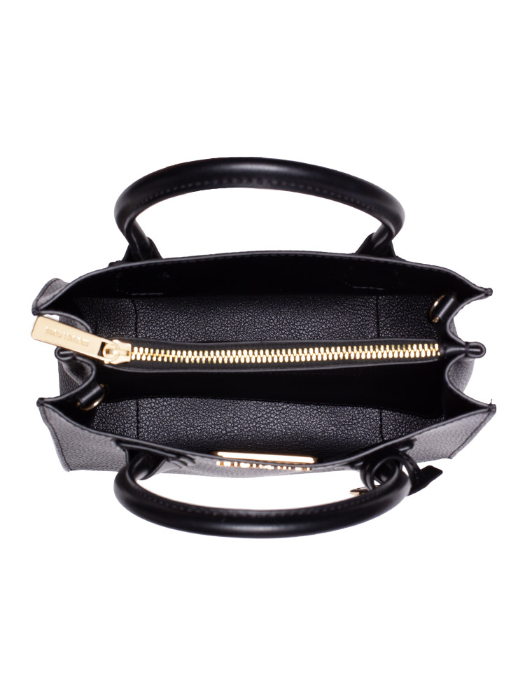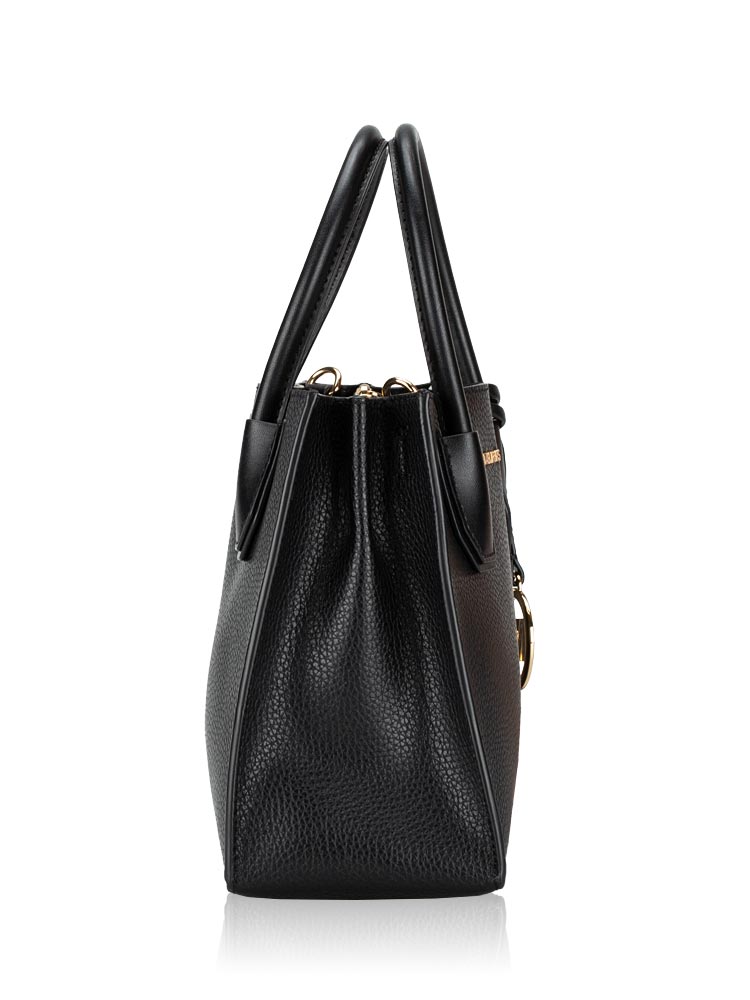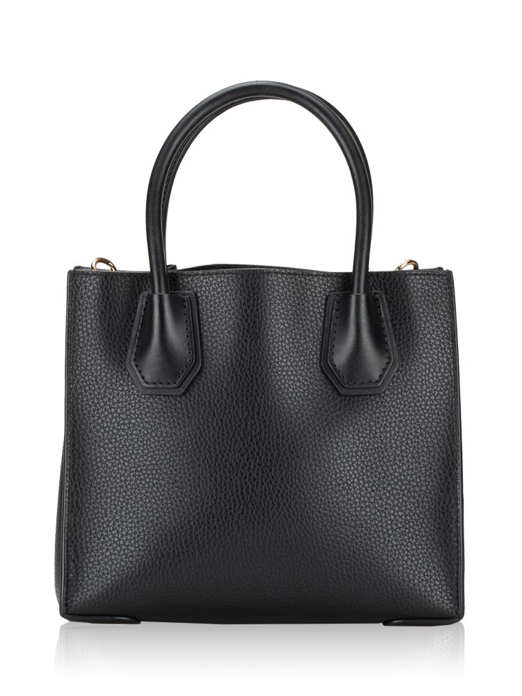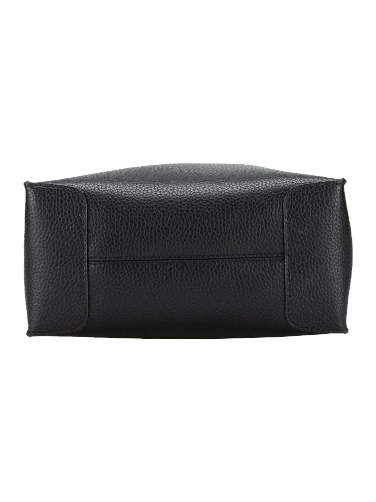 Crafted of pebble leather, the bag features double handles, open top that leads to double compartments divided by middle zip pocket, saffiano and polyester lining, Interior three card slots, and an optional long strap.