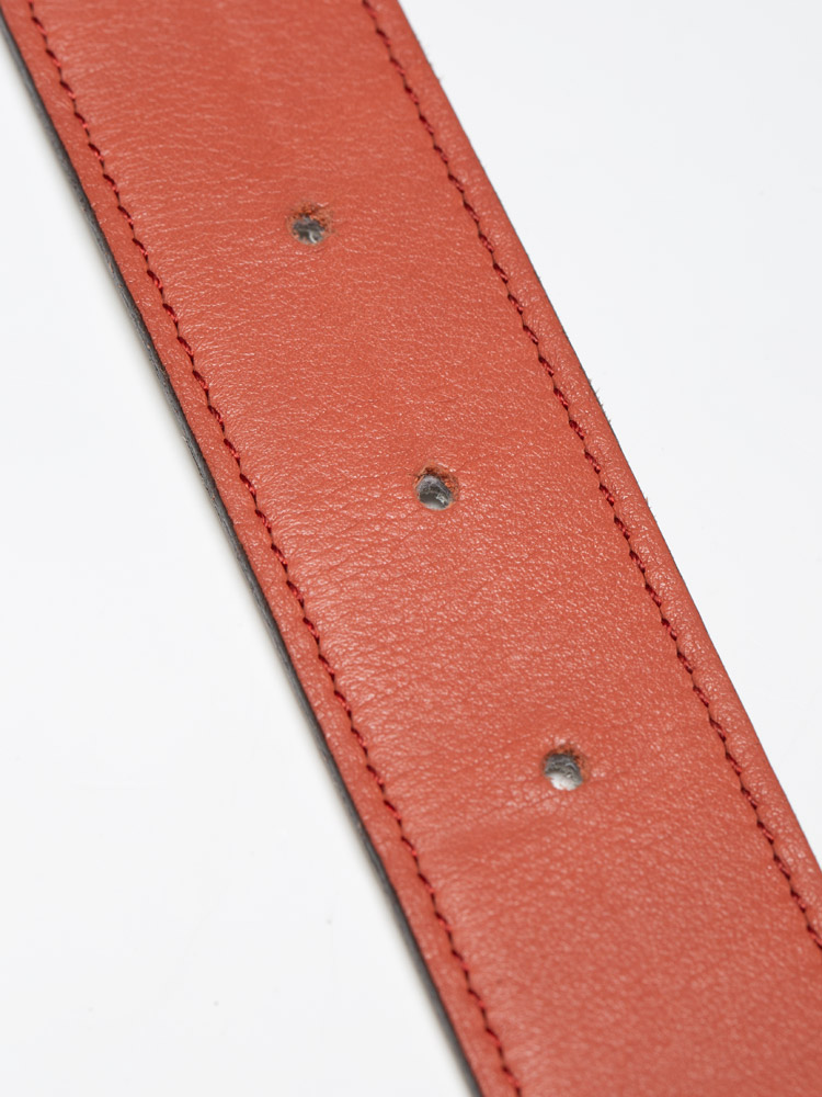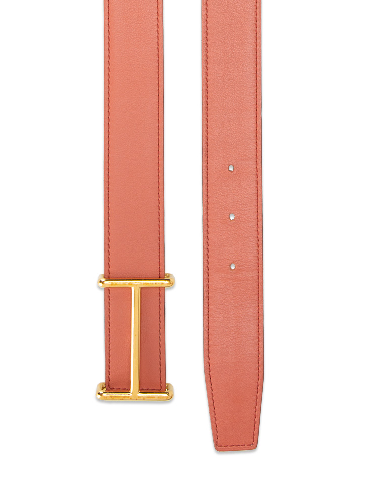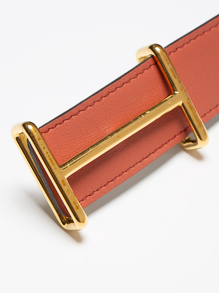This stylish reversible belt is Epsom calf in that it reverses to a swift calf with a stylized Hermes H gold-plated buckle.