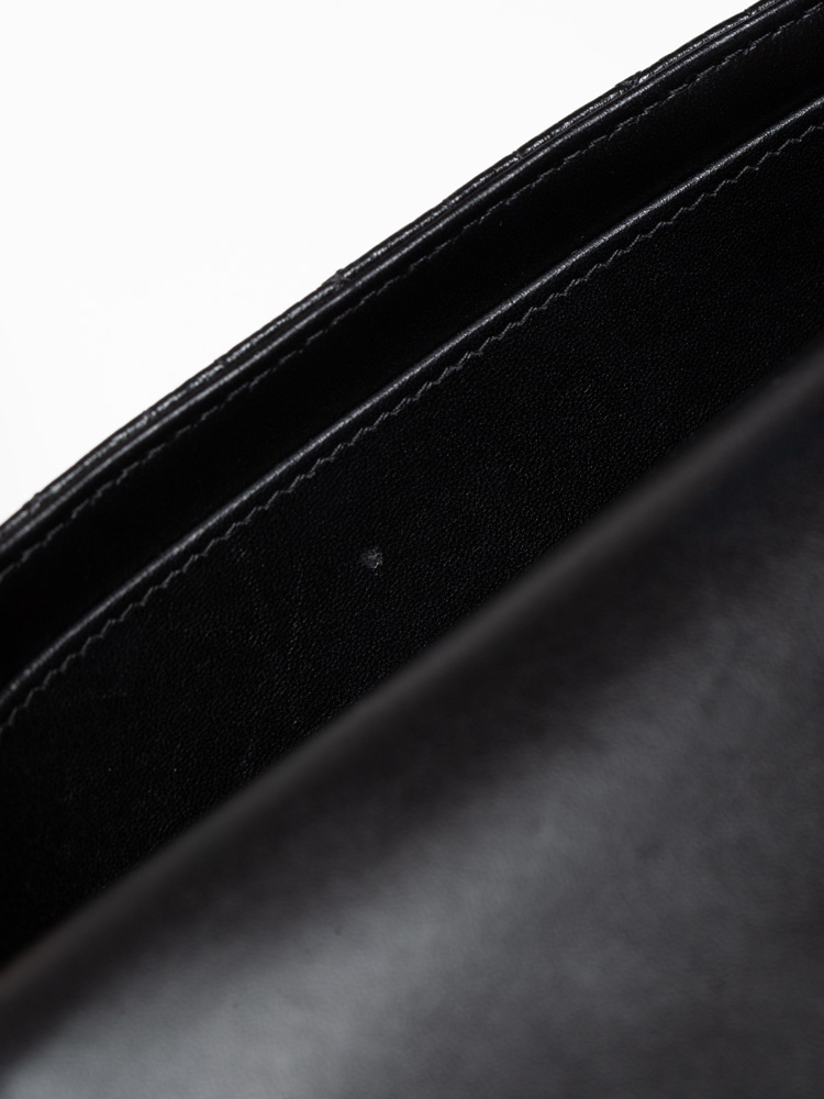 Crafted of calfskin material. The bag features a gold chain and leather shoulder strap, a rear pocket, and a gold turn lock. It opens to a matching leather interior with zipper and patch pockets.