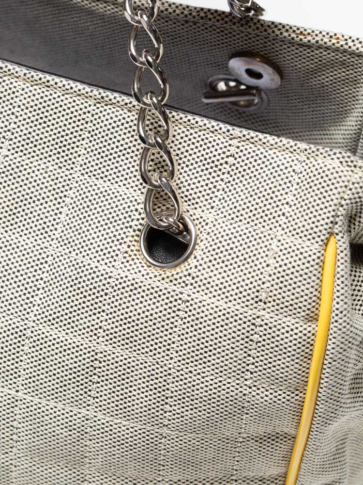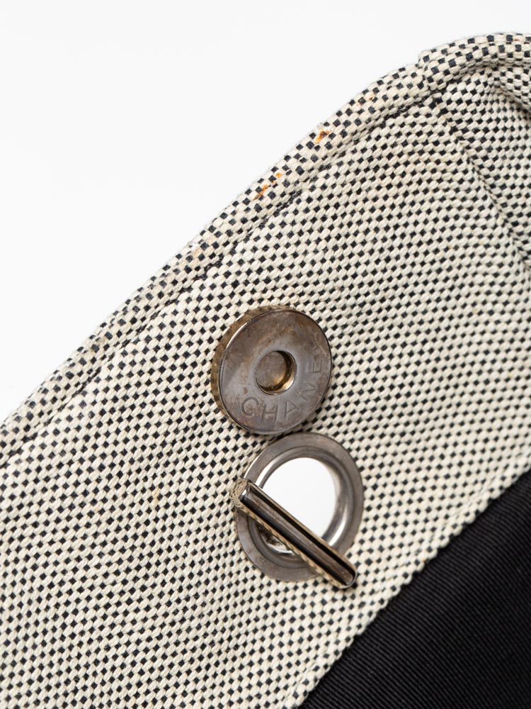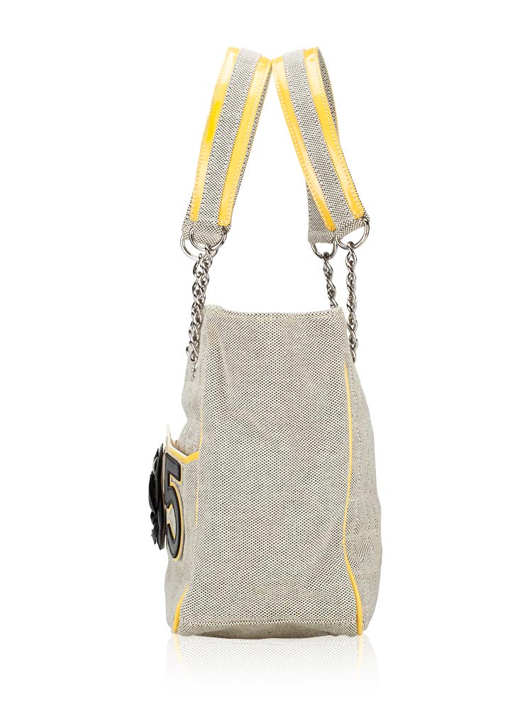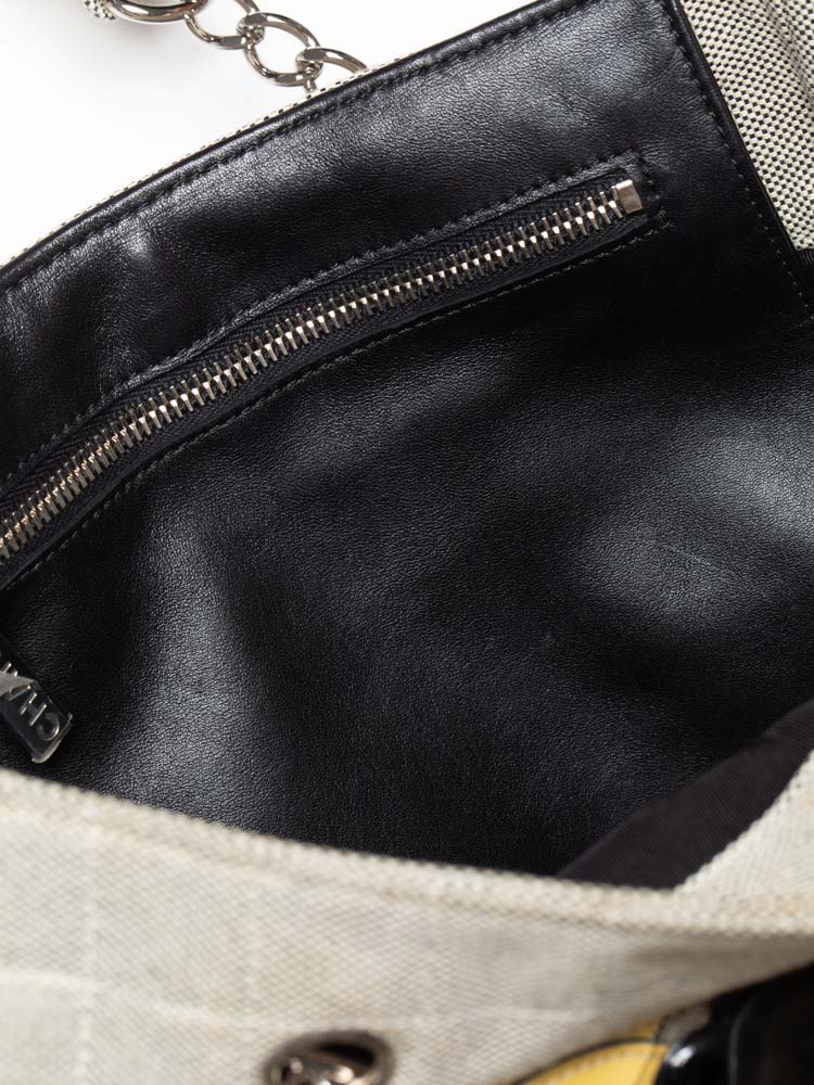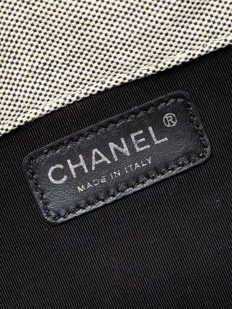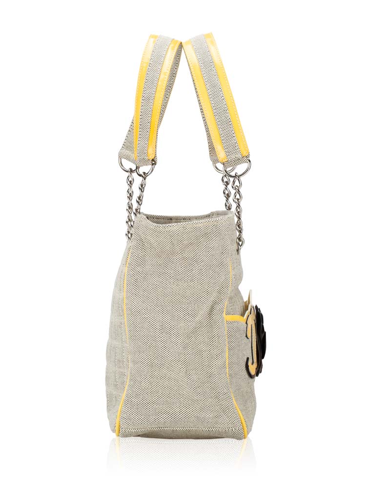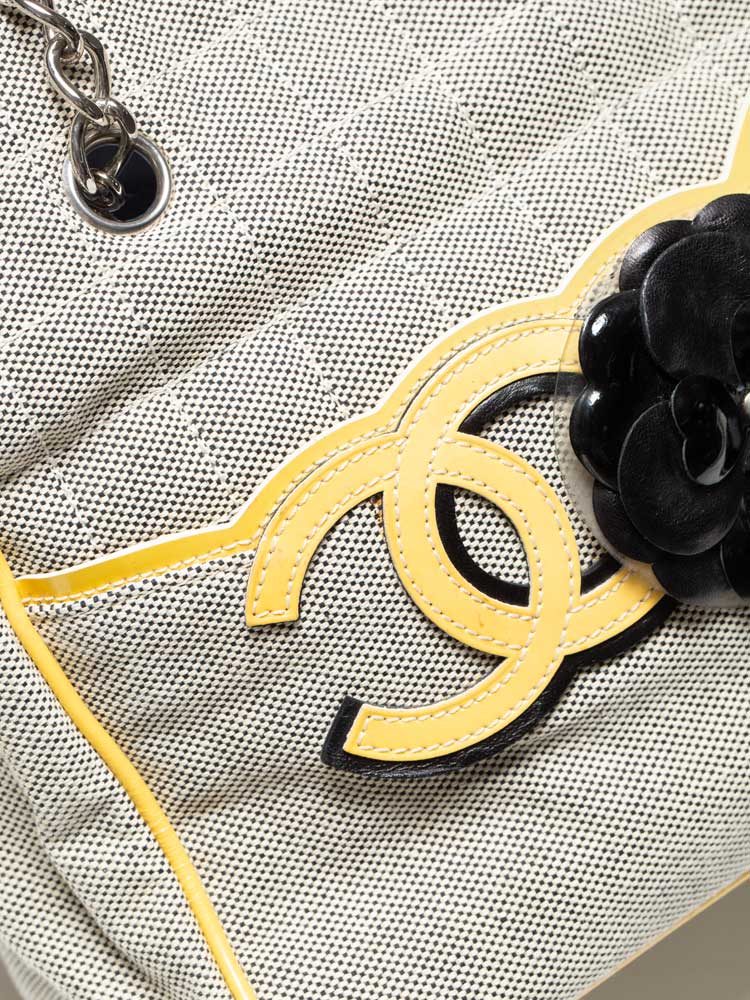 Crafted of fine toile canvas. The bag features canvas shoulder straps with silver chain links and a front display of patent leather cut-outs with a Chanel CC logo, a 3-D camellia patent leather flower, and a black number 5,
