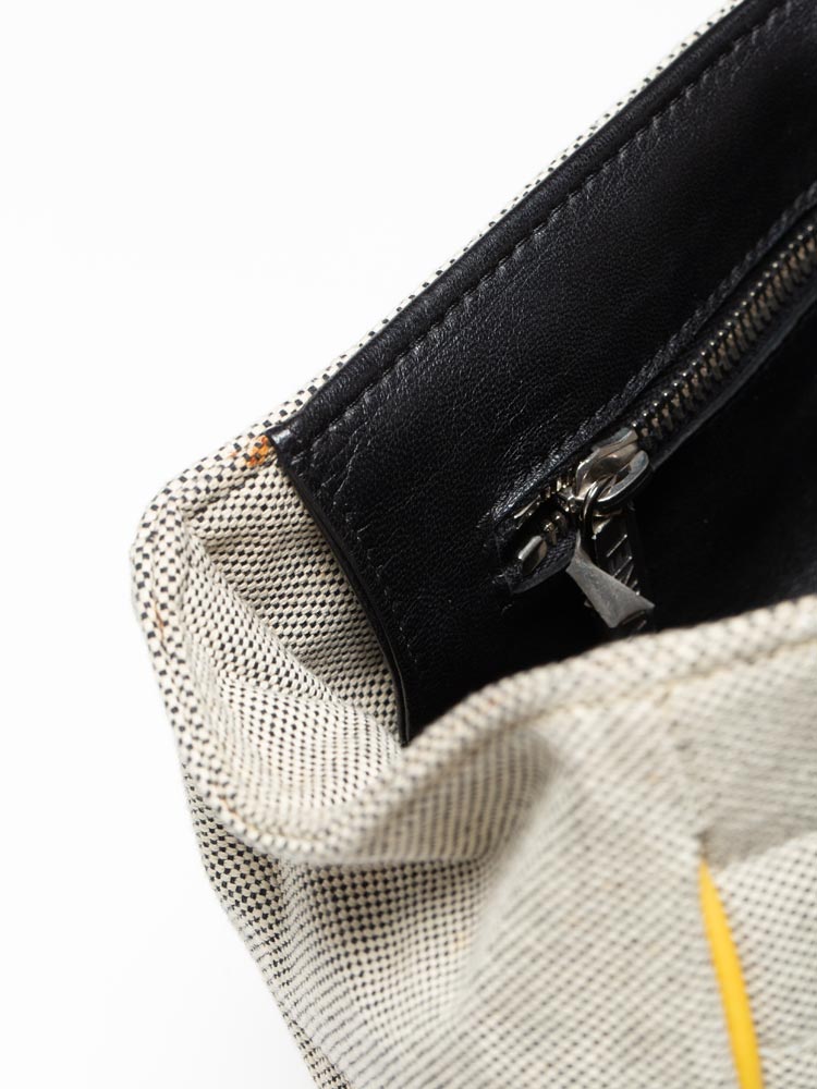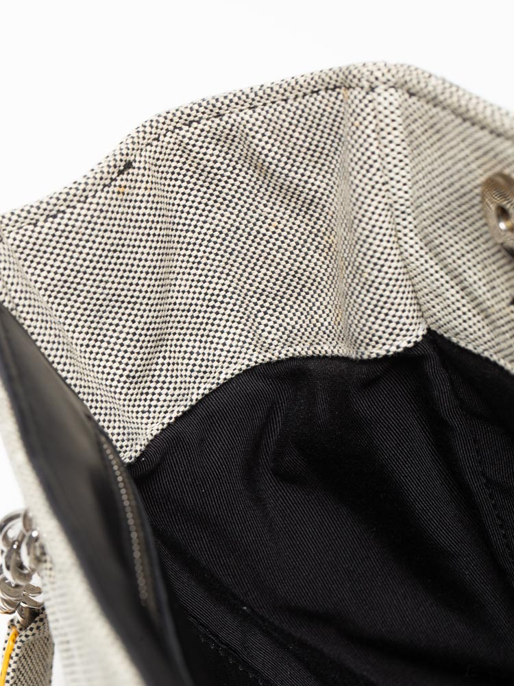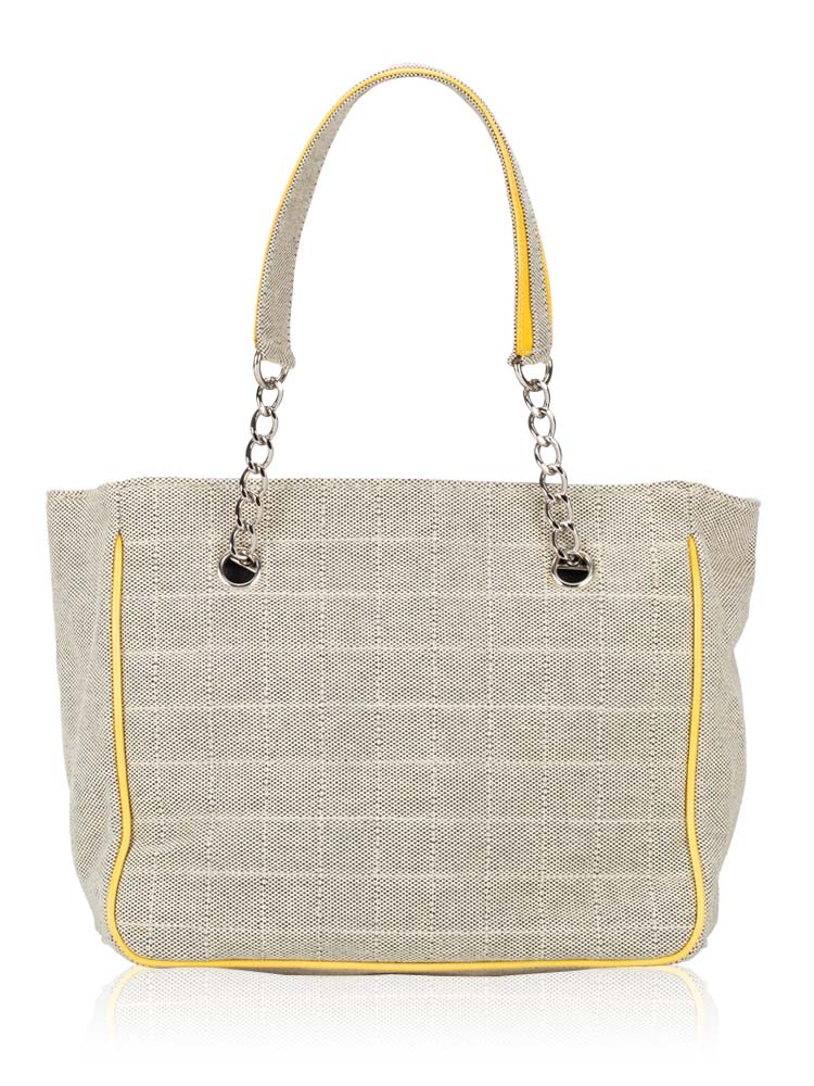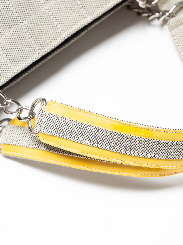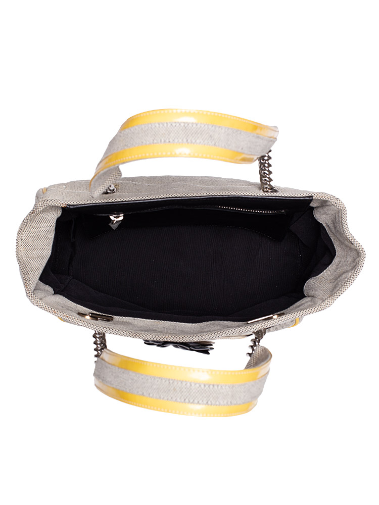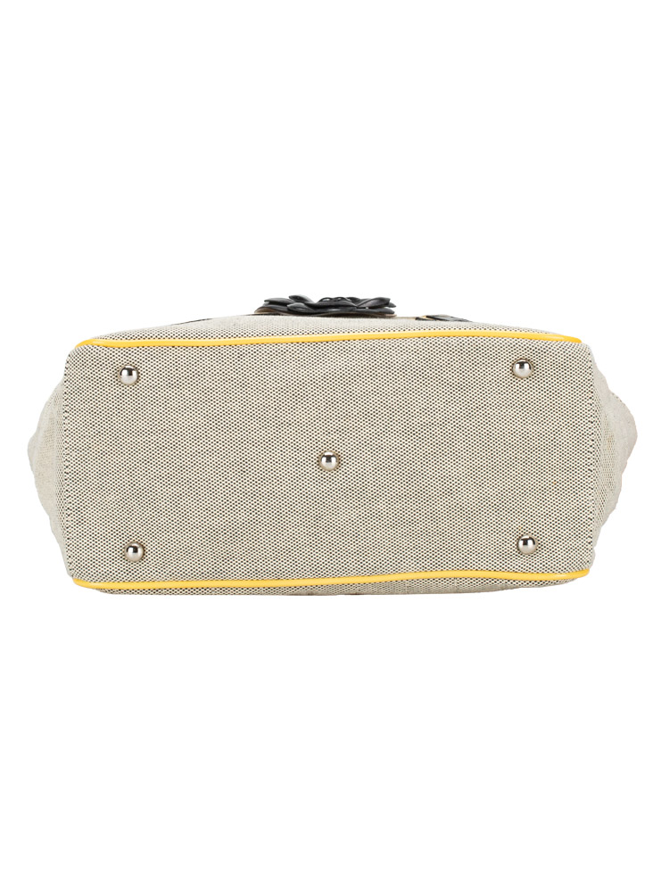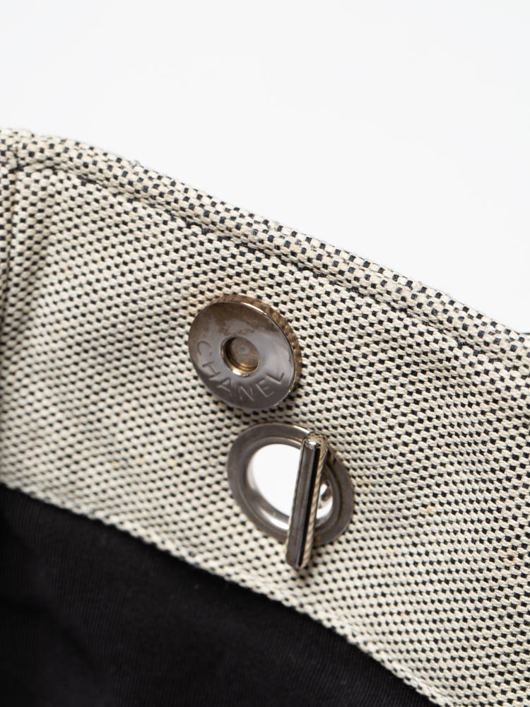 Crafted of fine toile canvas. The bag features canvas shoulder straps with silver chain links and a front display of patent leather cut-outs with a Chanel CC logo, a 3-D camellia patent leather flower, and a black number 5,
