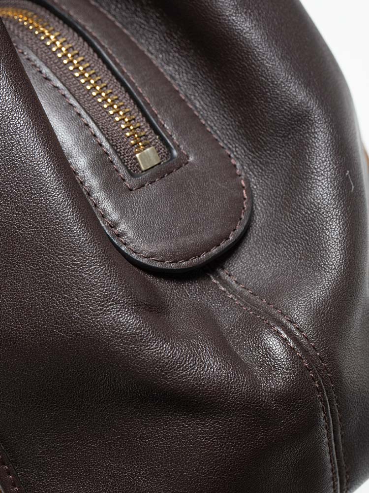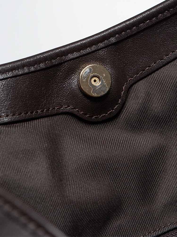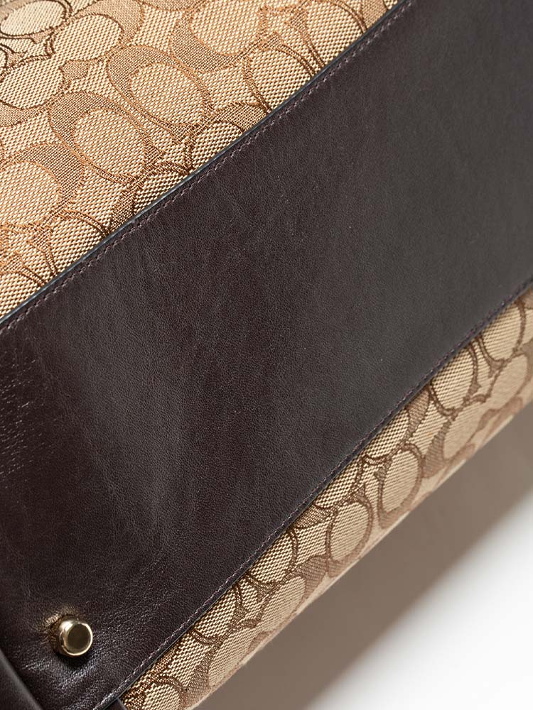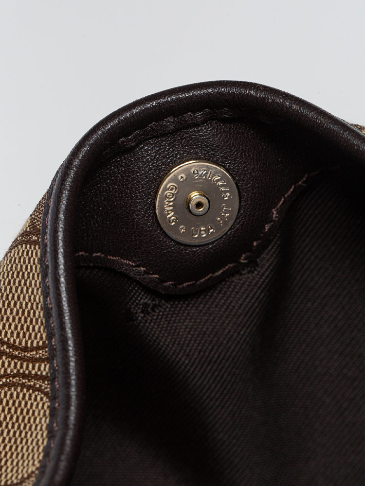 Made of signature jacquard leather. The bag features a magnetic closure that opens to fabric lining with interior middle zip comparments, one zip pocket, two slip pockets.