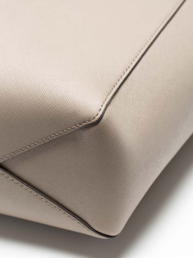 Made of saffiano leather. The bag features a zip closure that opens to fabric lining with interior one zip pocket, one slip pocket.