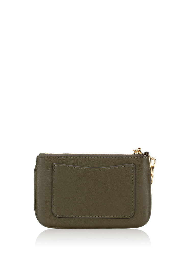 Made of leather. The wallet features a zip closure that opens to polyester lining with one slip pocket, exterior one slip pocket at back.