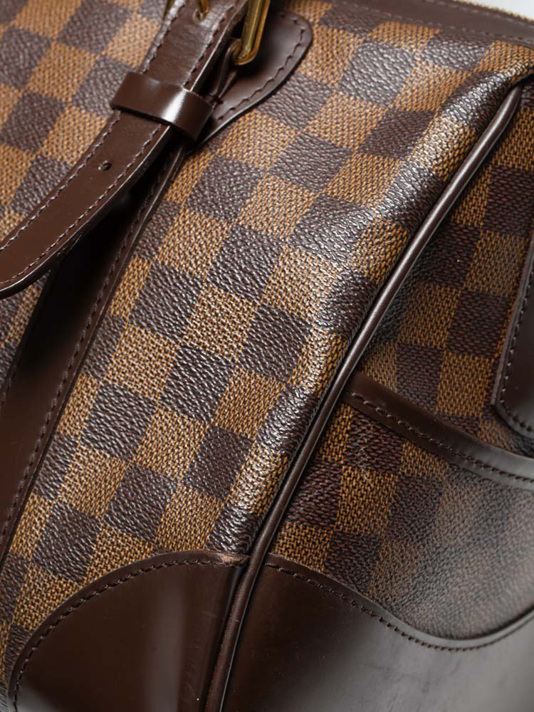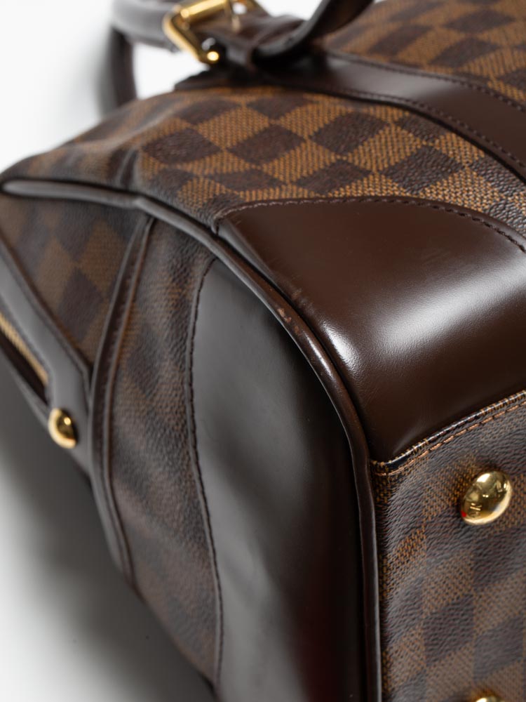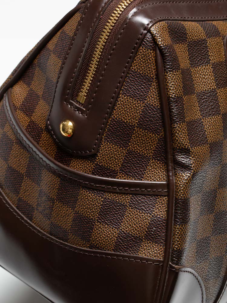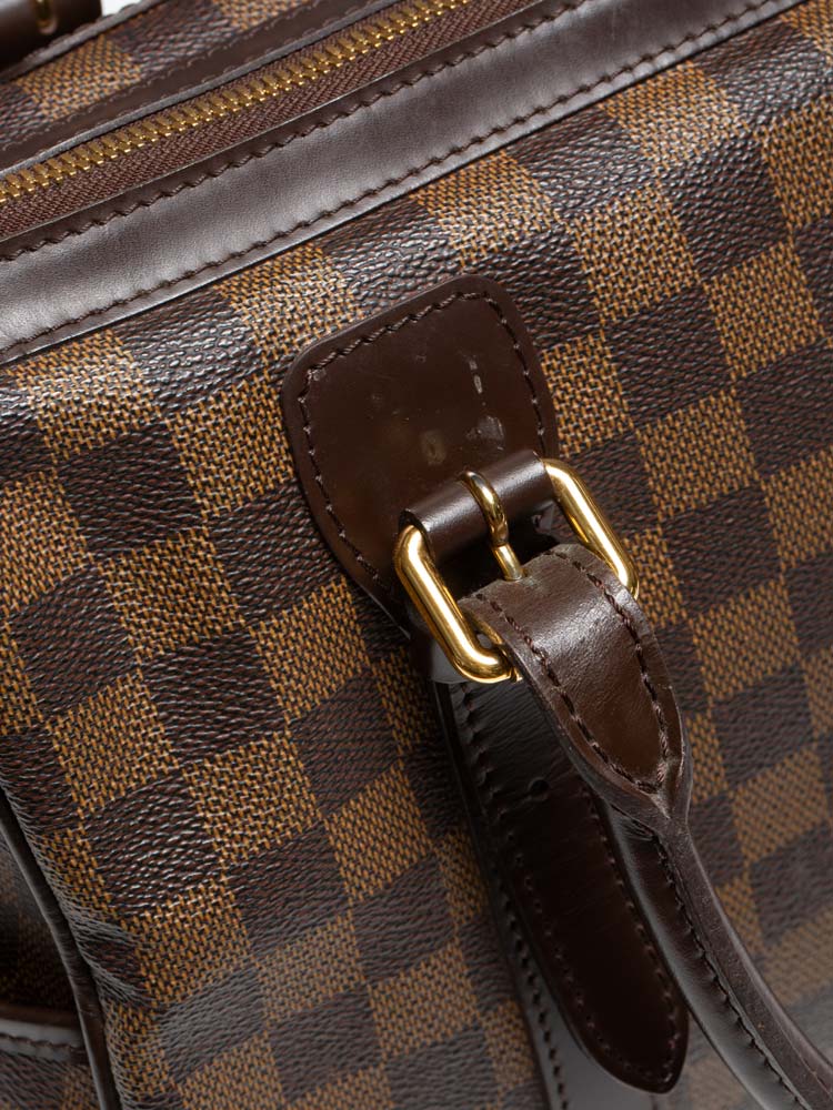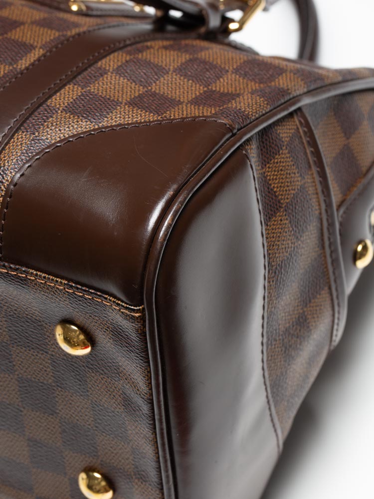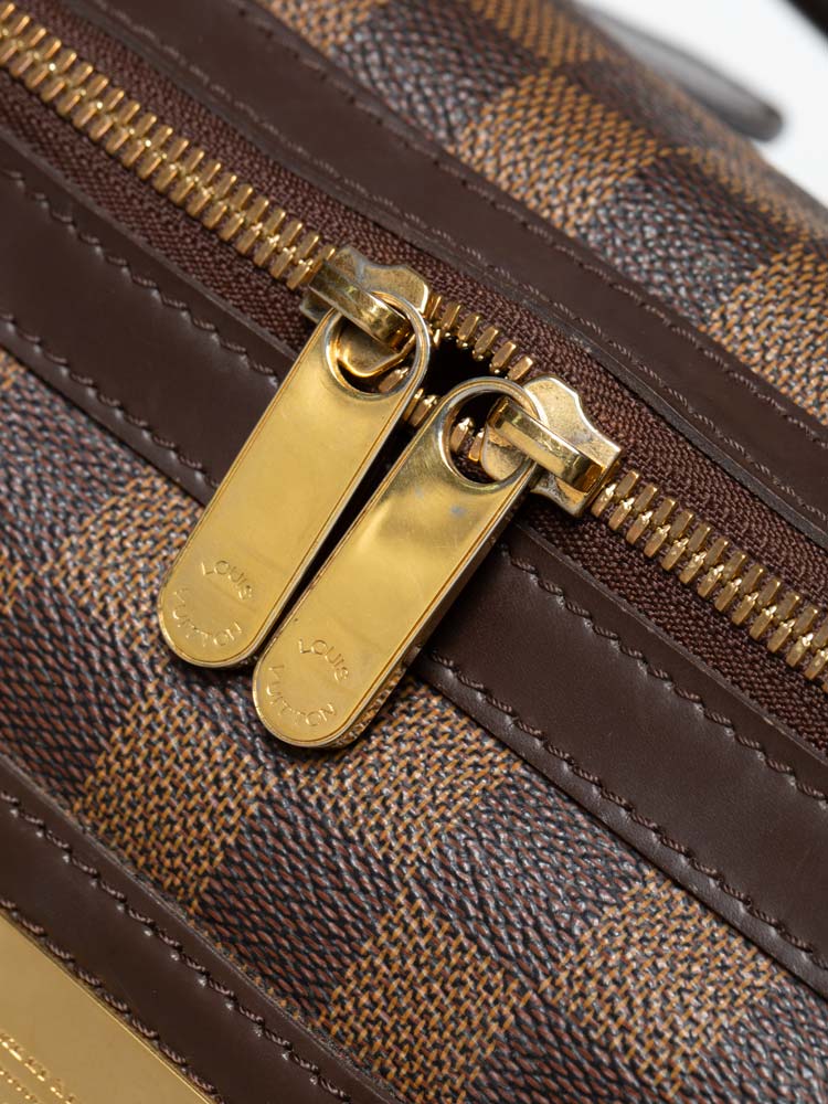 This bag is crafted of Louis Vuitton Damier Ebene coated canvas. It features adjustable top handles, leather trim, and Louis Vuitton lettering on metal plaque. The top zipper opens to a microfiber lining with slip pockets.