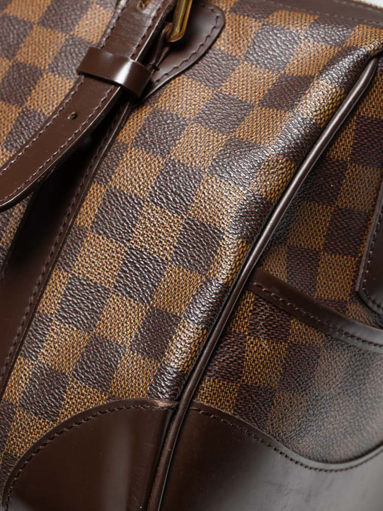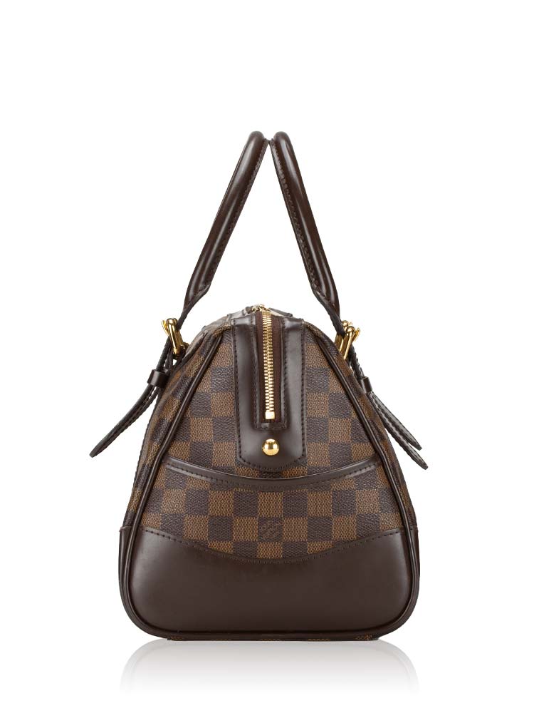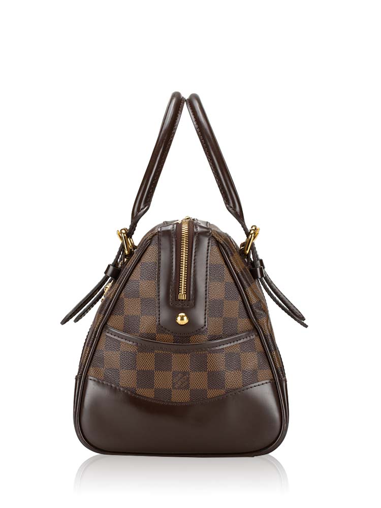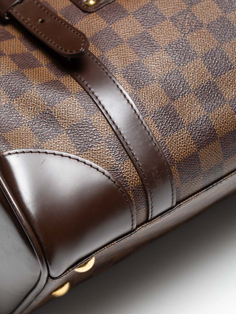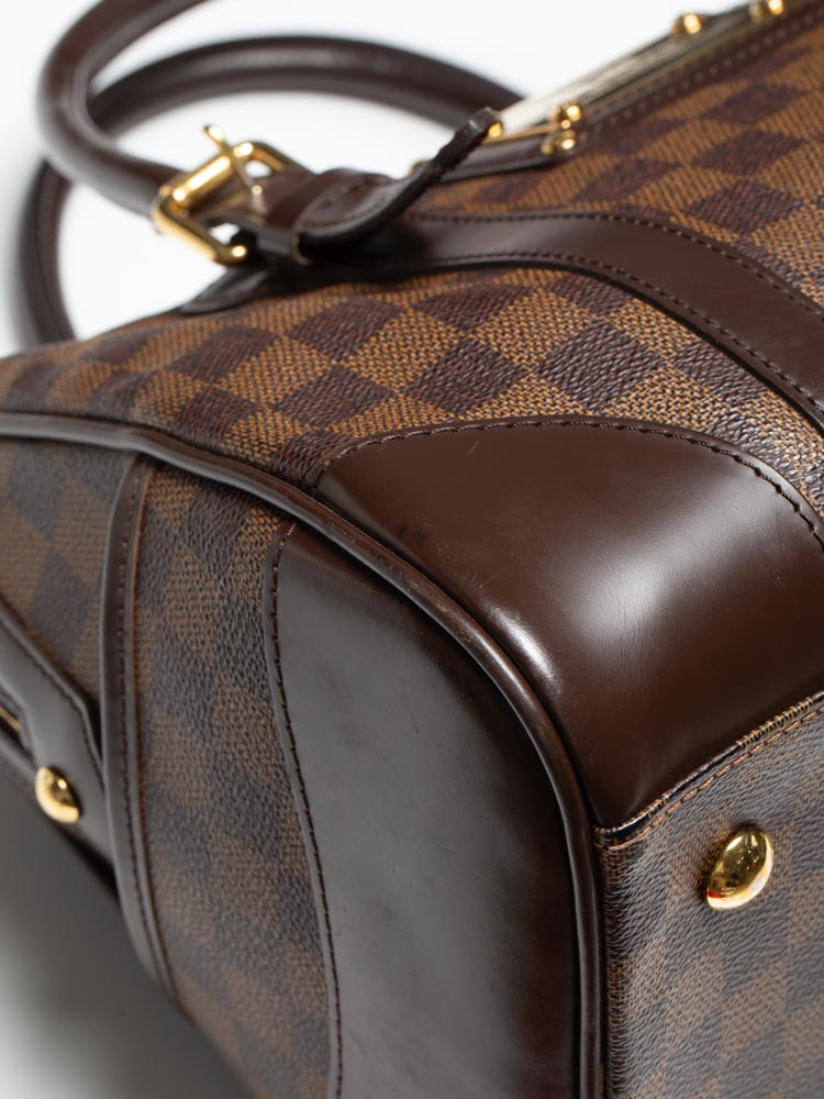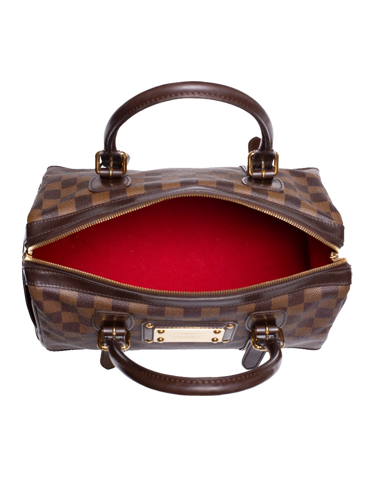 This bag is crafted of Louis Vuitton Damier Ebene coated canvas. It features adjustable top handles, leather trim, and Louis Vuitton lettering on metal plaque. The top zipper opens to a microfiber lining with slip pockets.