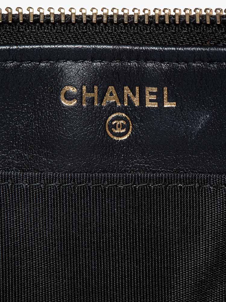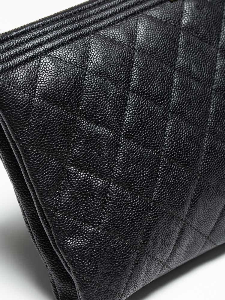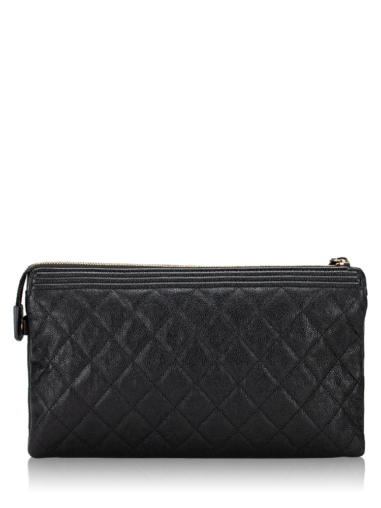 Crafted of diamond quilted caviar leather, and features a Boy CC push lock at the top crest. The zipper opens to a partitioned fabric and leather interior with card slots, patch pockets, and a central zipper compartment.
