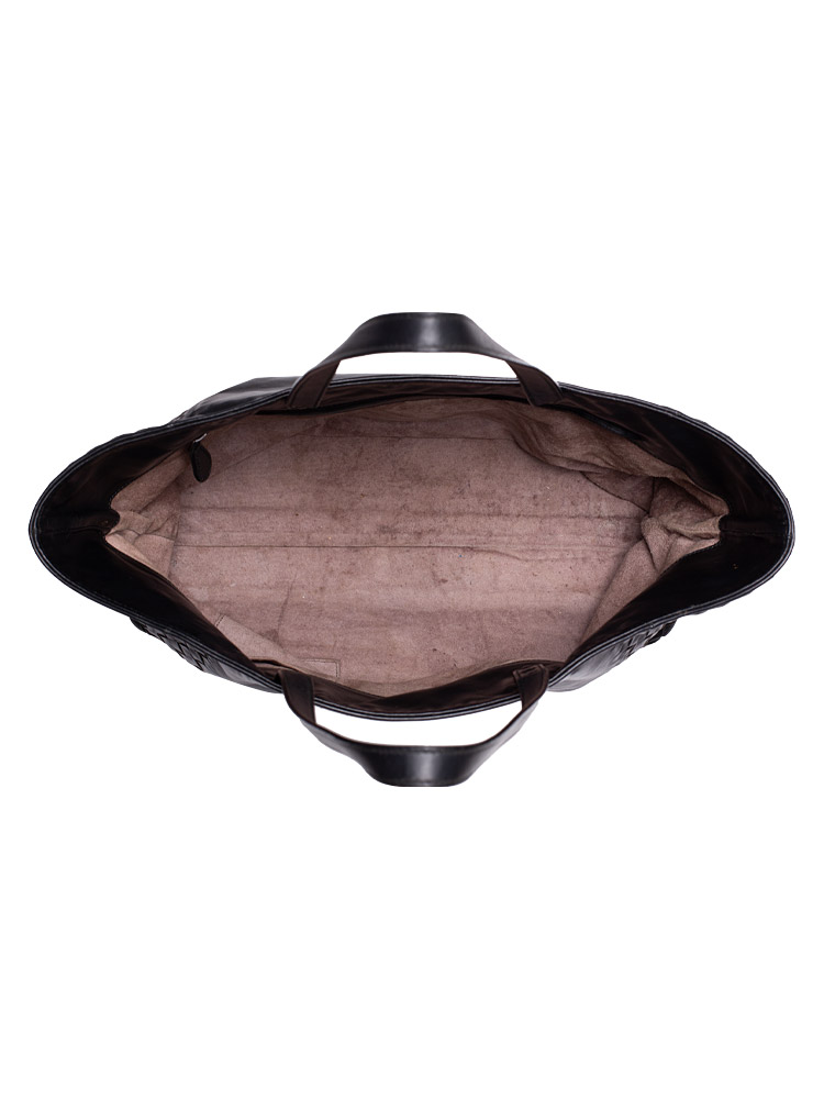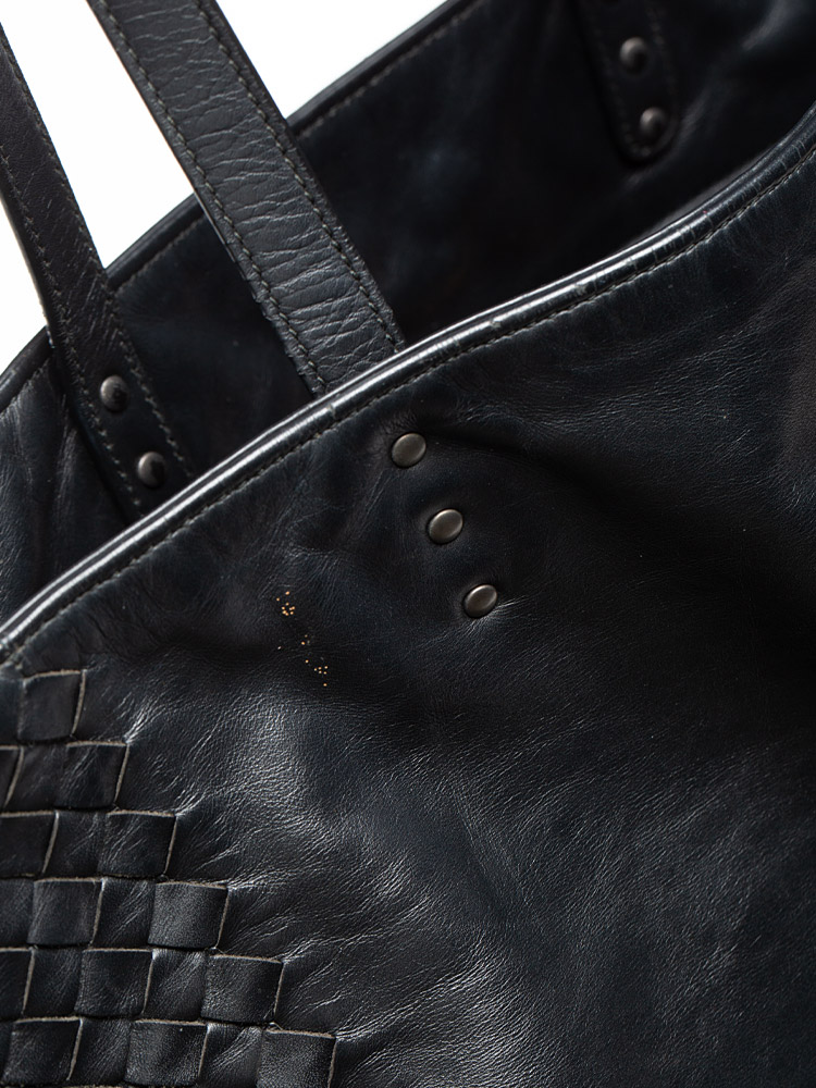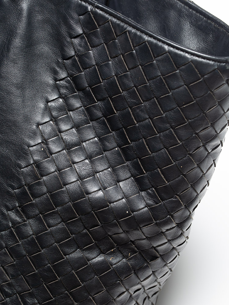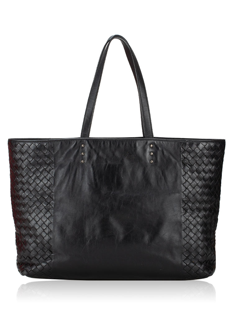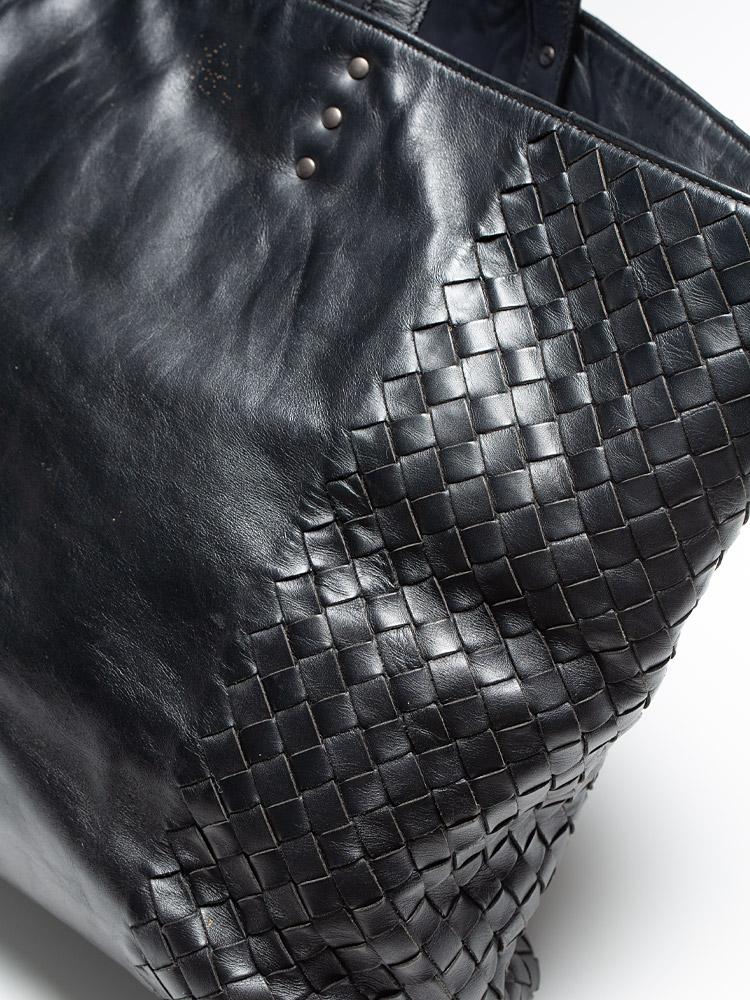 Crafted of lambskin leather with woven leather sides. The bag features top strap handles. It opens to a pig skin interior with zipper and patch pockets.