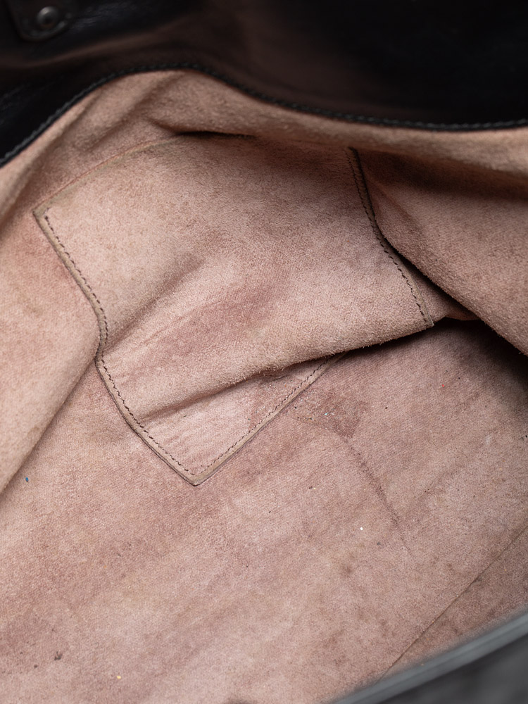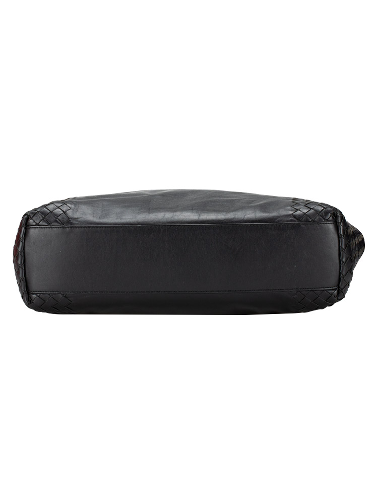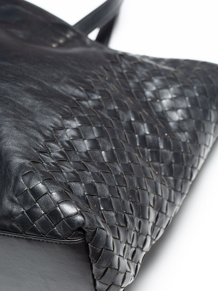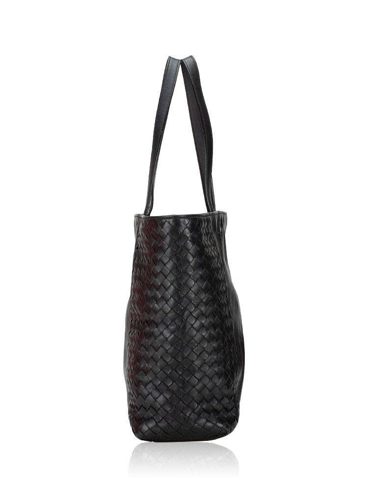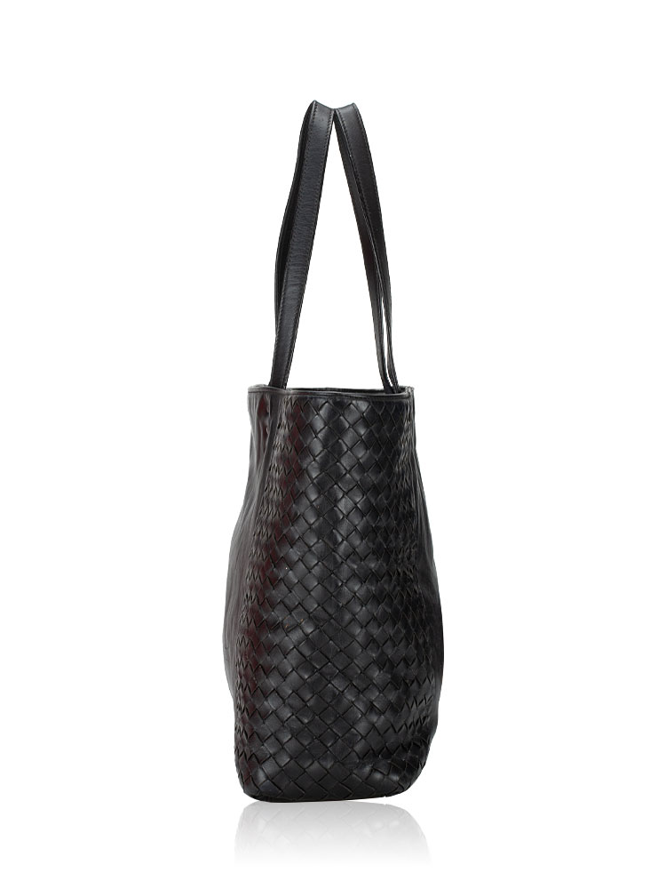 Crafted of lambskin leather with woven leather sides. The bag features top strap handles. It opens to a pig skin interior with zipper and patch pockets.