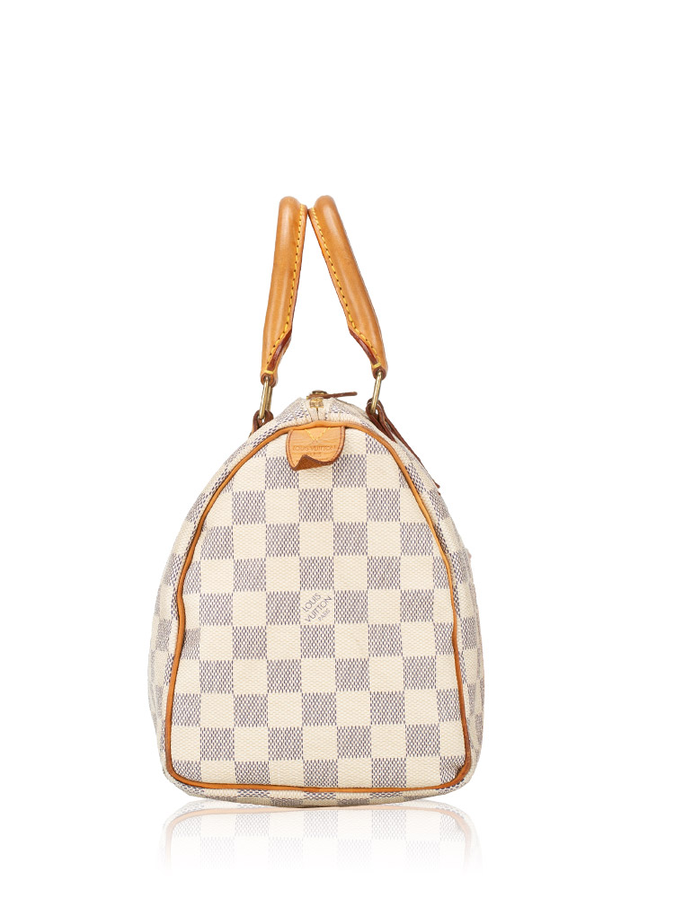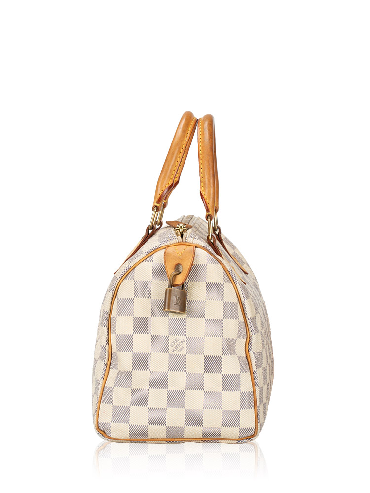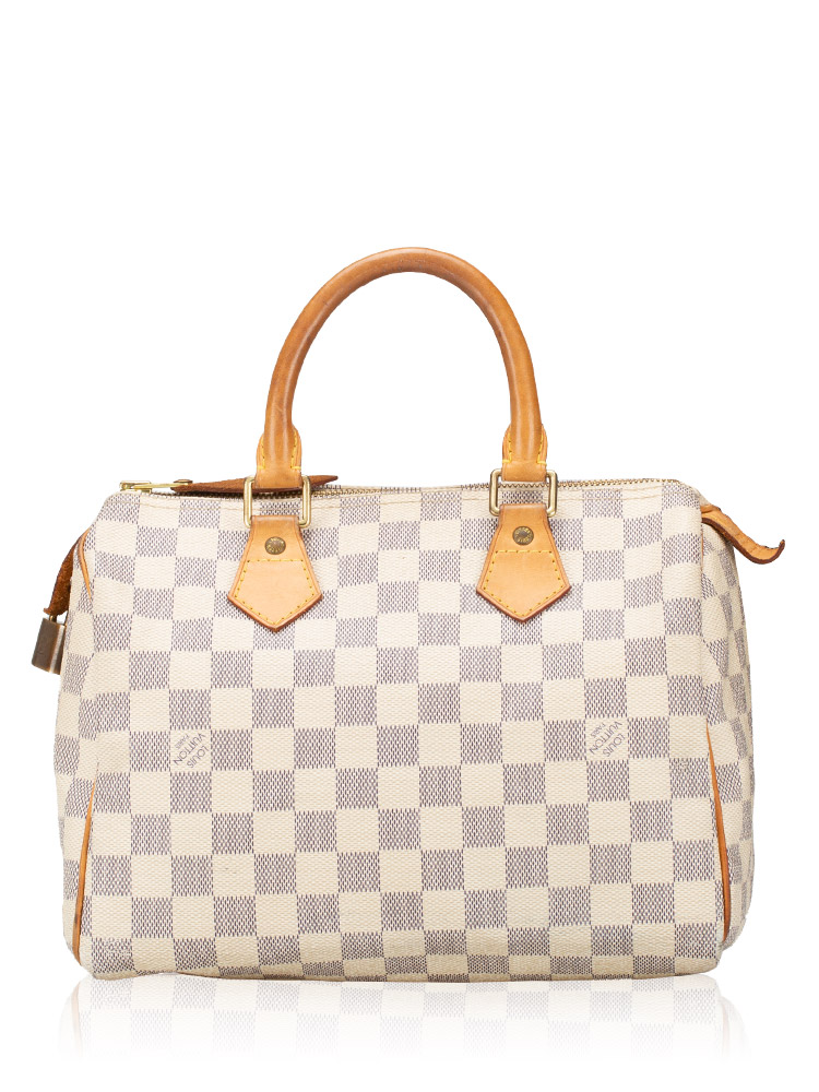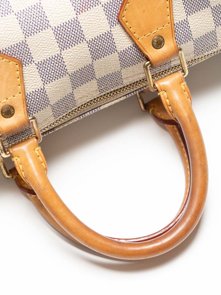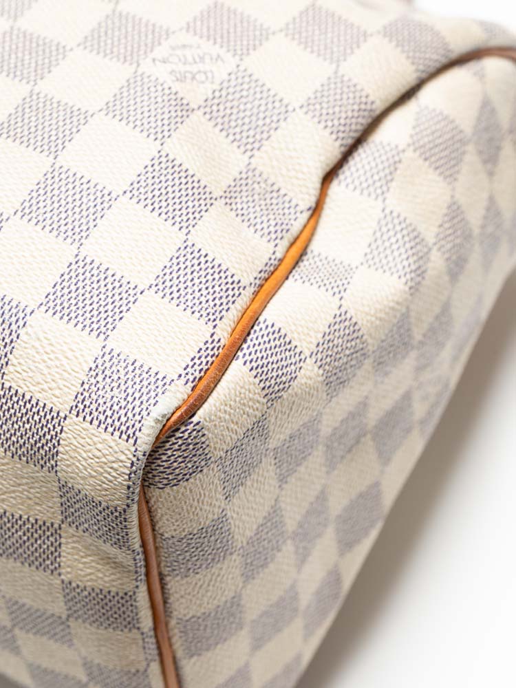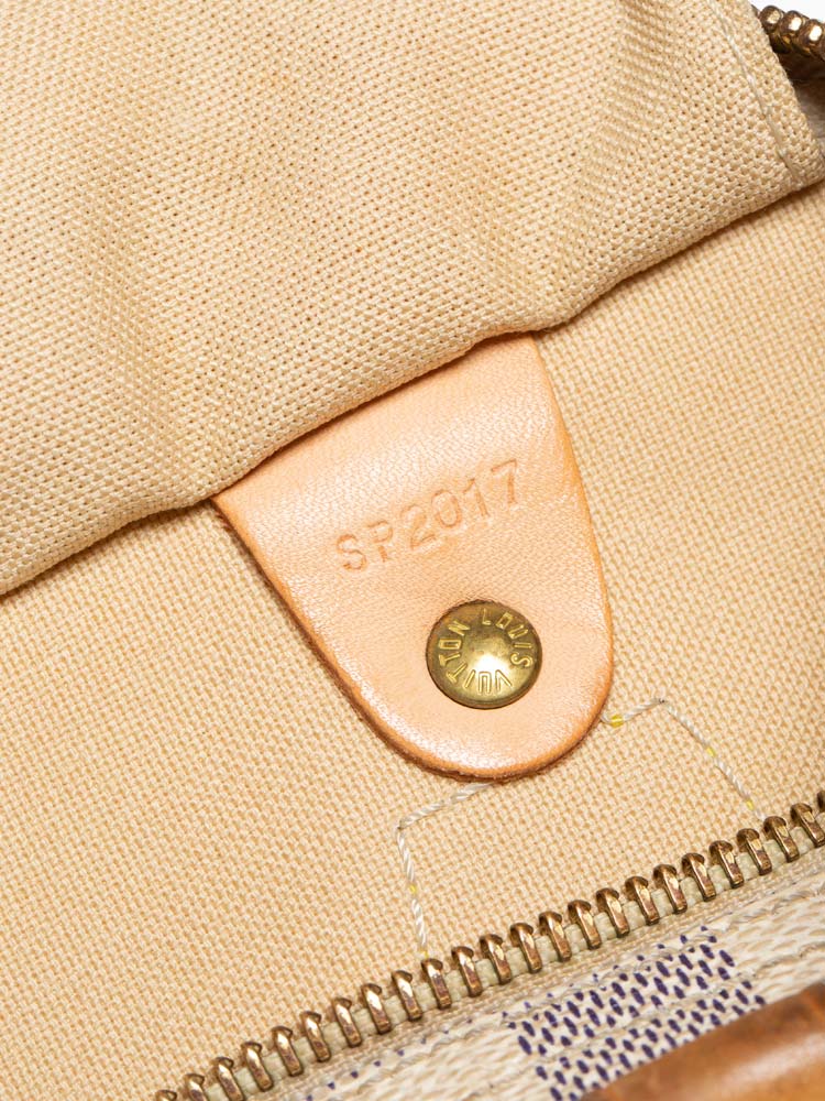 Crafted of Louis Vuitton damier azur coated canvas. It features vachetta cowhide trim and rolled top handles, with polished brass hardware. The top zipper opens to a fabric interior with a hanging flat pocket.