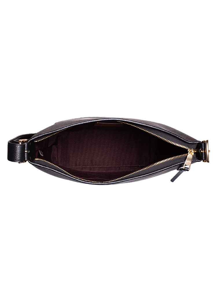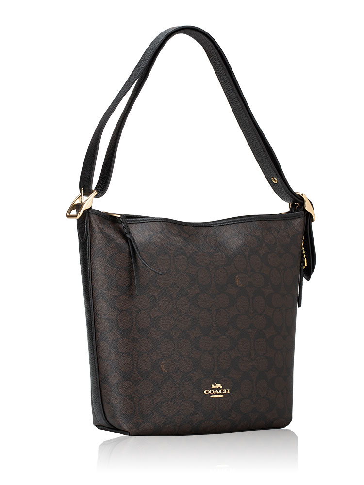 Made of signature coated canvas and pebbled leather. The bag features a zip closure that opens to fabric lining with one zip pocket, two slip pockets, exterior one zip pocket at back, adjustable and removable shoulder strap.