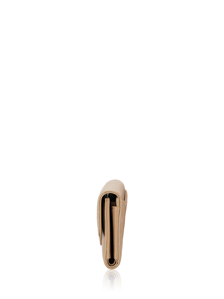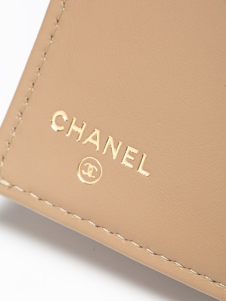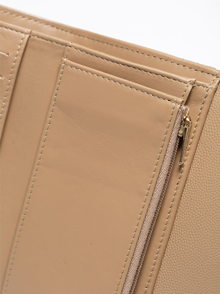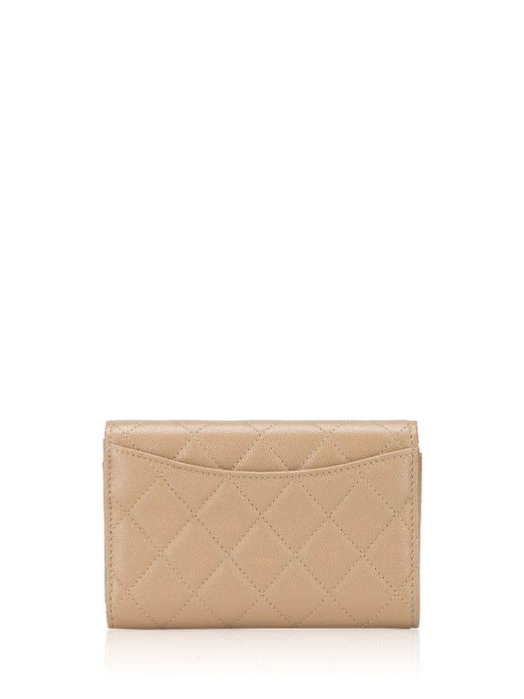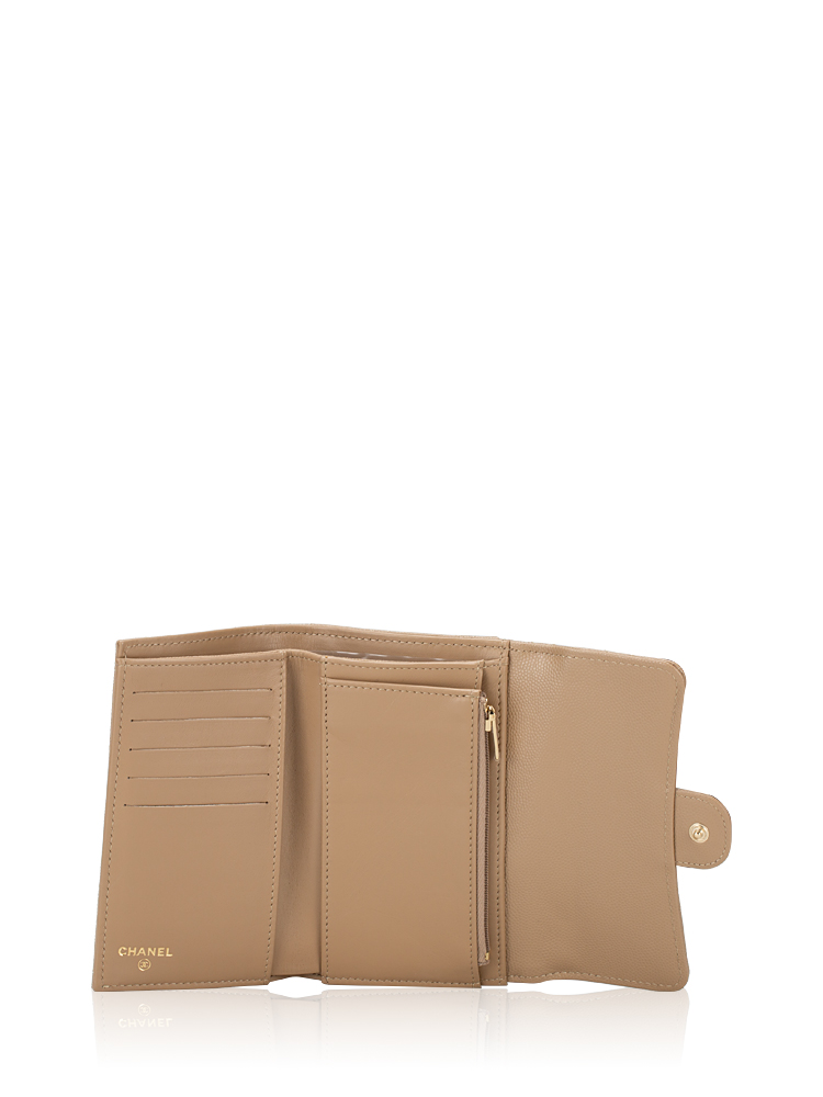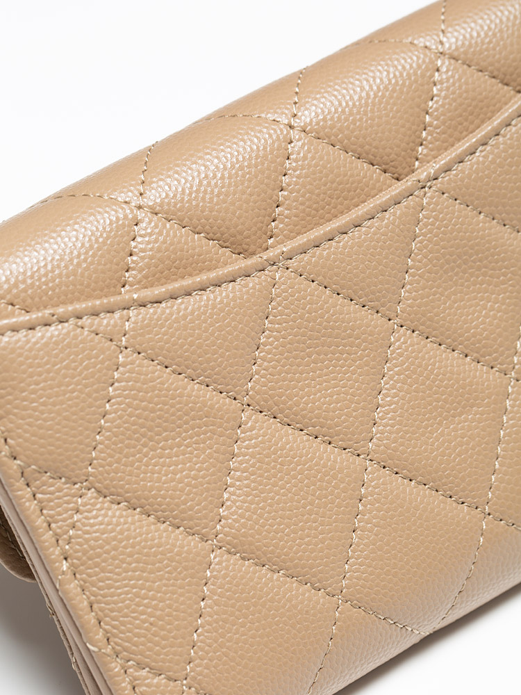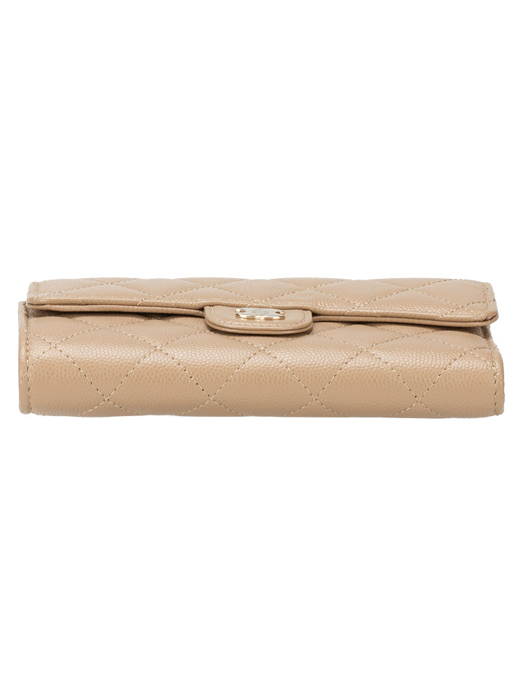 This wallet is crafted of diamond-quilted caviar leather. The crossover flap features a polished gold CC logo and opens to a leather interior with card slots, patch pockets, a billfold, and a zipper compartment.