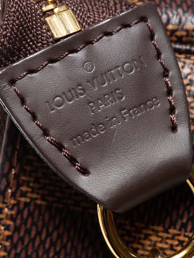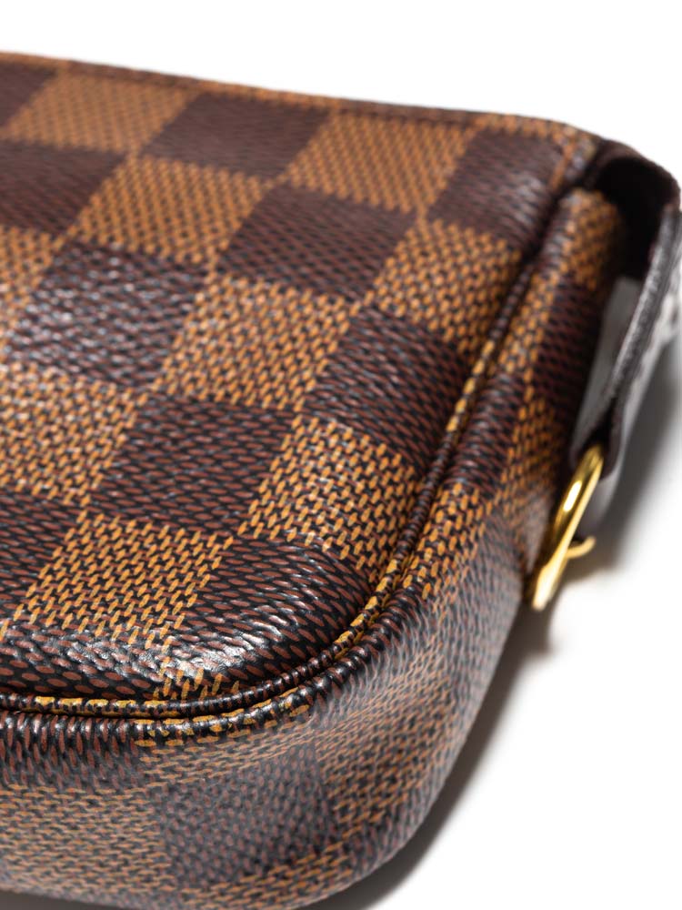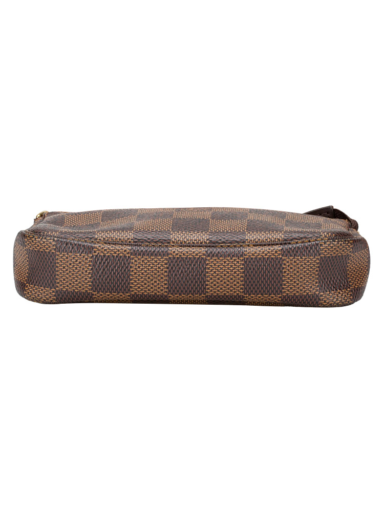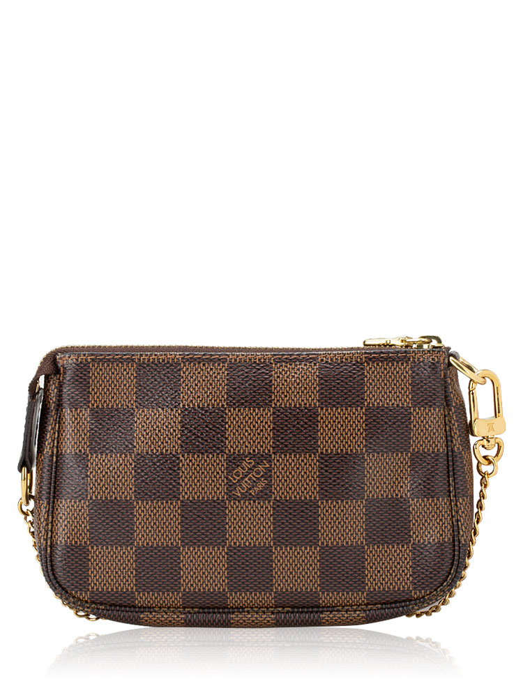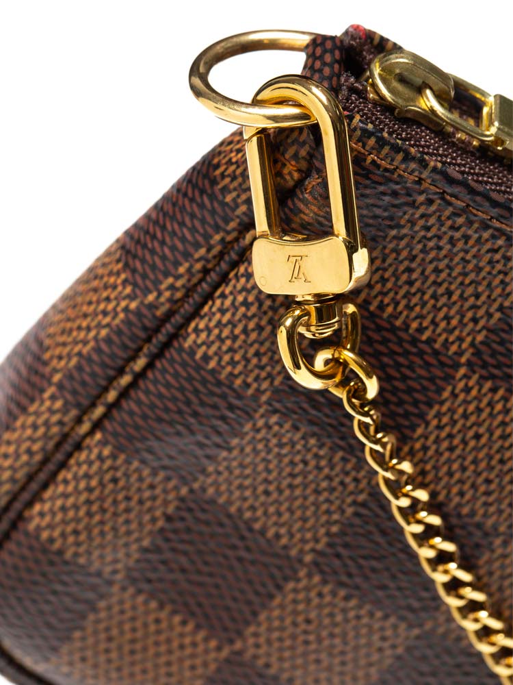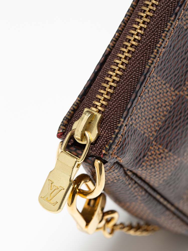 This pochette is crafted of Louis Vuitton Damier Ebene coated canvas. It features with gold chain strap . The top zipper opens to a fabric interior.