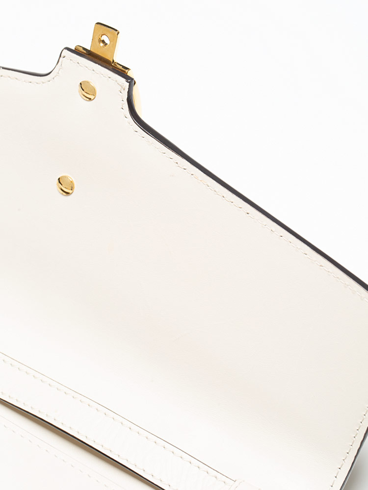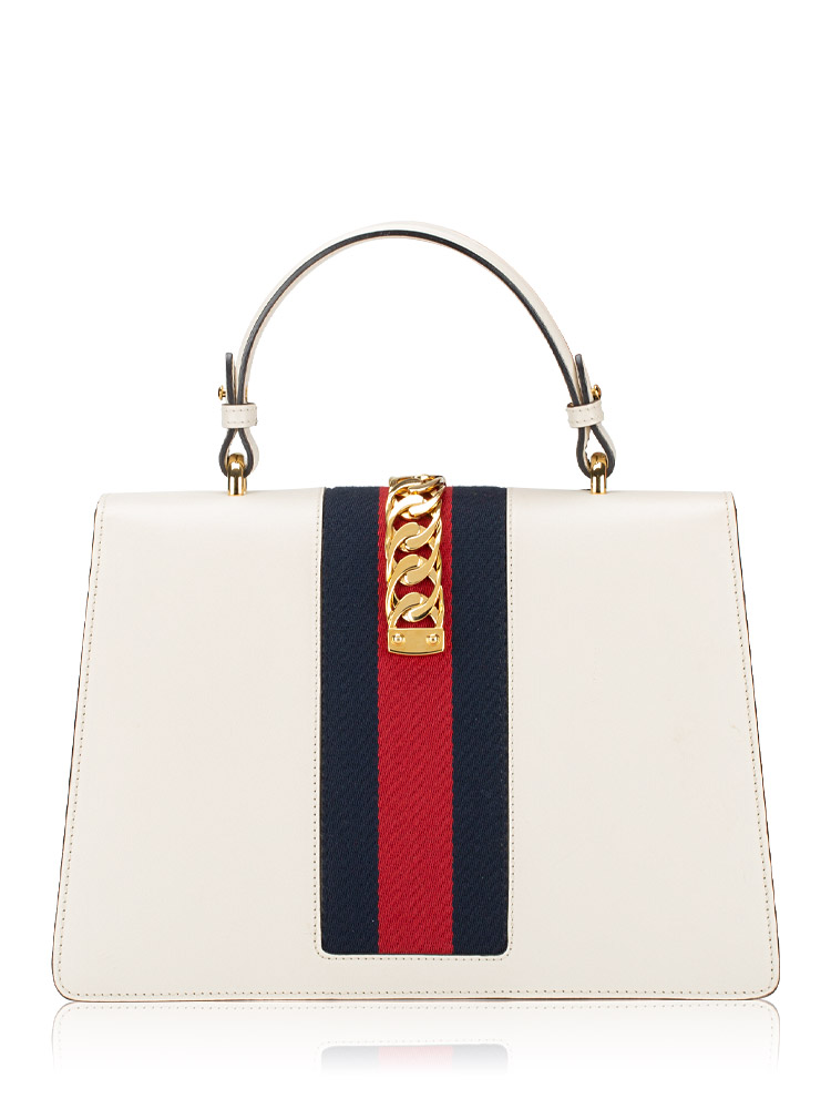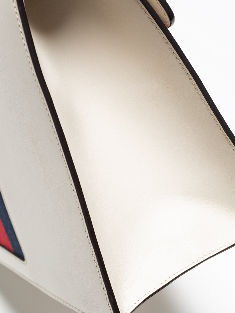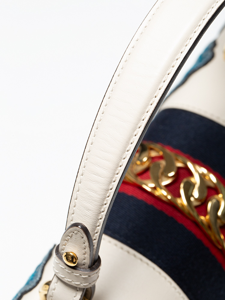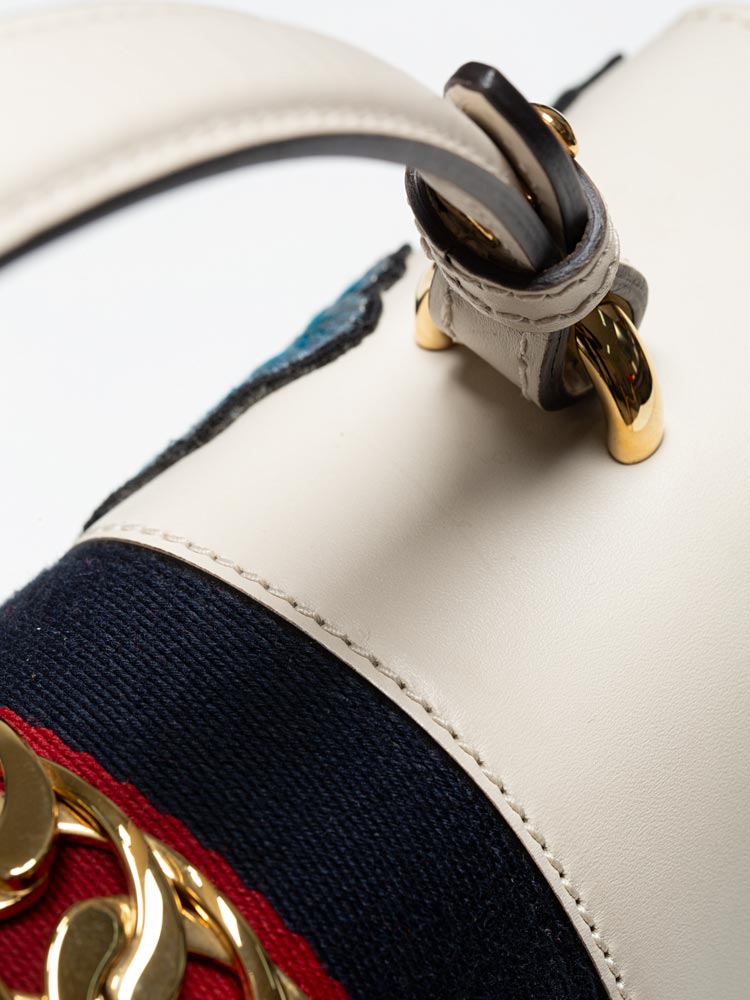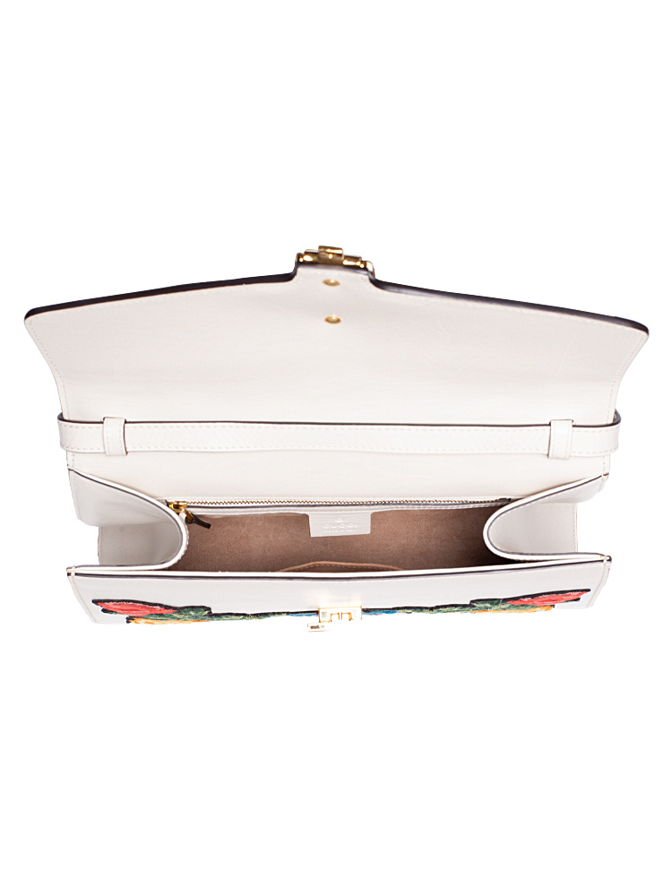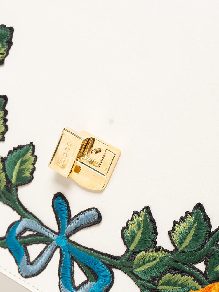 Crafted of calfskin leather. Features a front detailed with a central web stripe and signature floral embroidery, a gold chain with a buckle closure, and an optional shoulder strap. The flap opens to a suede interior with a patch and zipper pocket.