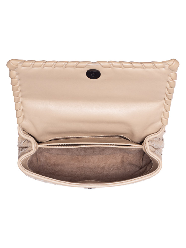 Crafted of soft woven lambskin leather. Features a chain-link shoulder strap with a shoulder pad and a front flap with a magnetic snap. This opens to a partitioned suede interior with a center slip pocket.