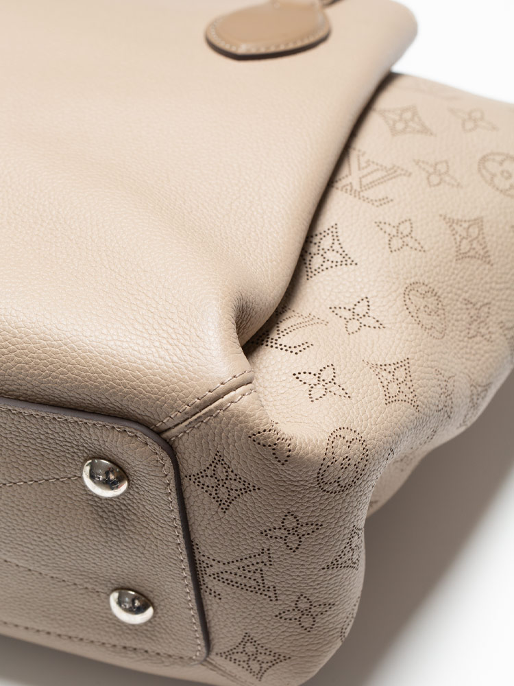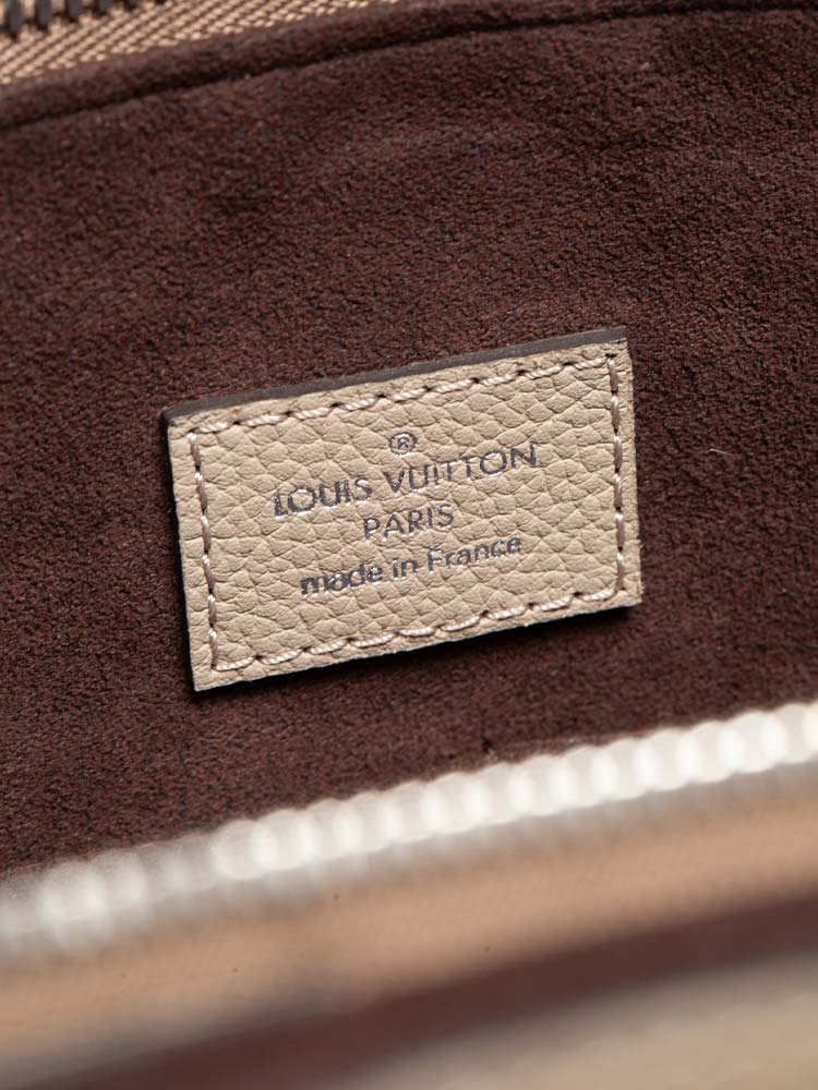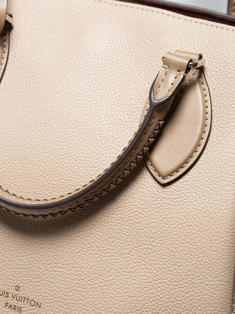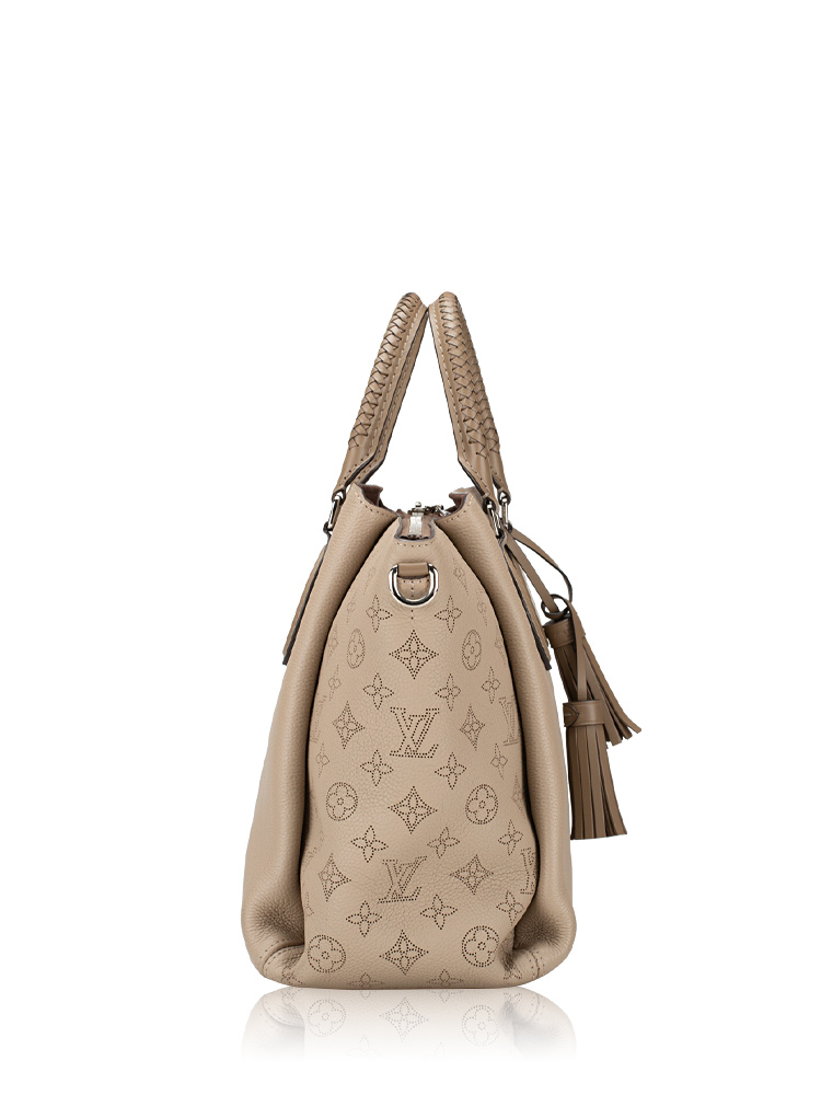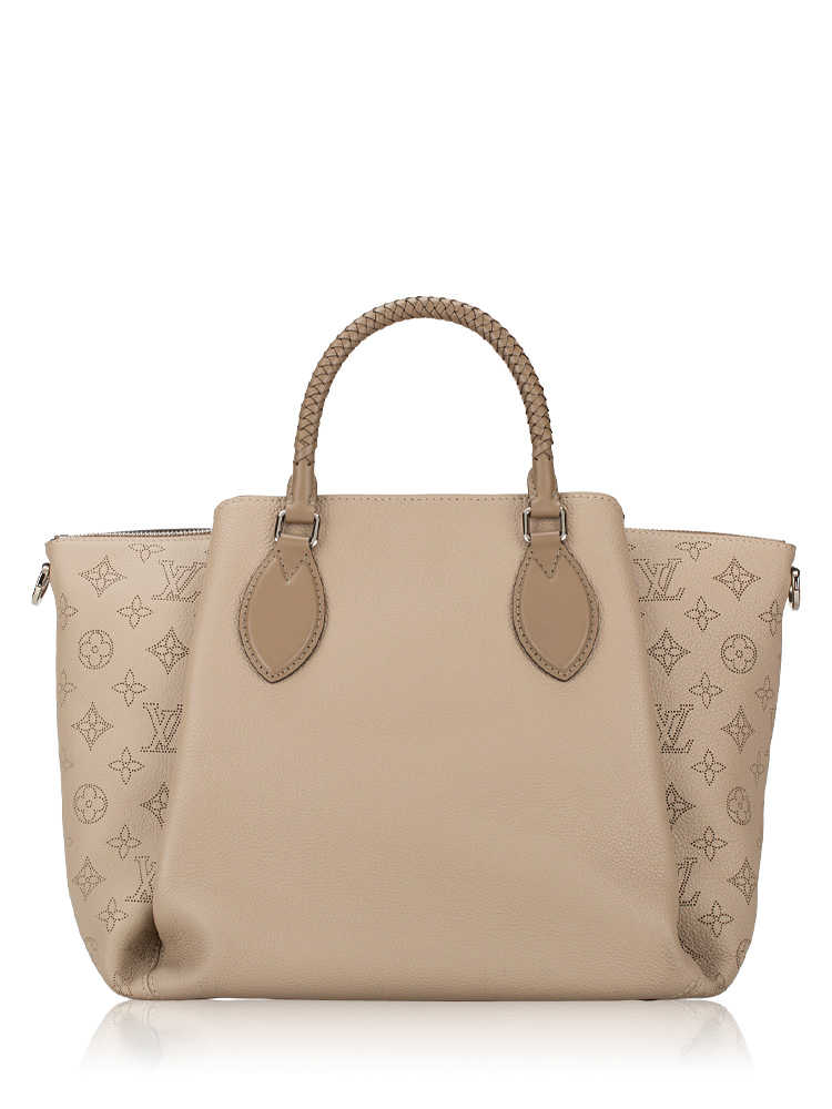 Crafted of grained calfskin and monogram perforated leather leather in beige. The shoulder bag features braided rolled beige leather top handles and silver hardware. This opens to a microfiber interior with flat pockets.