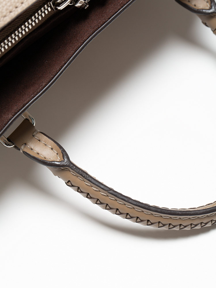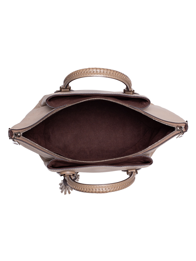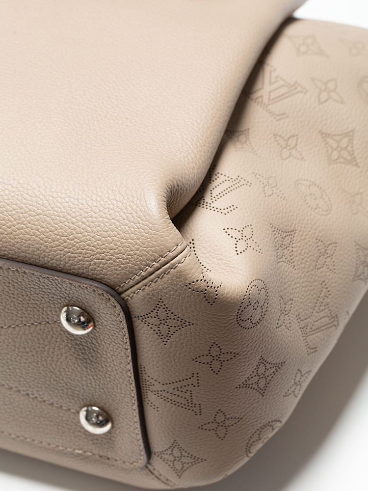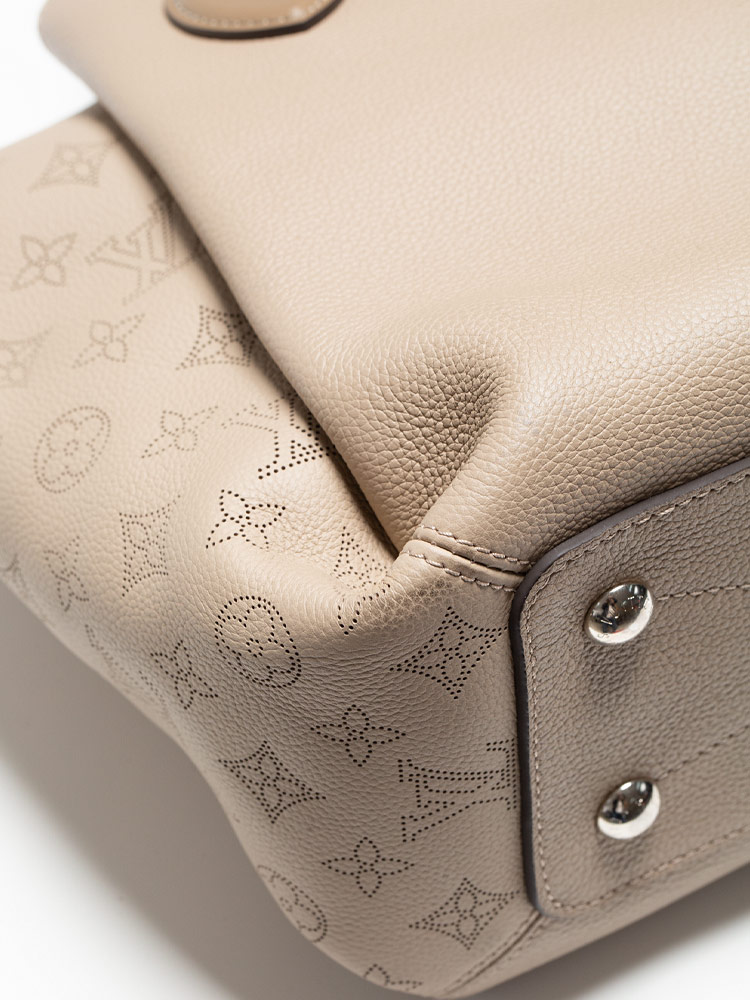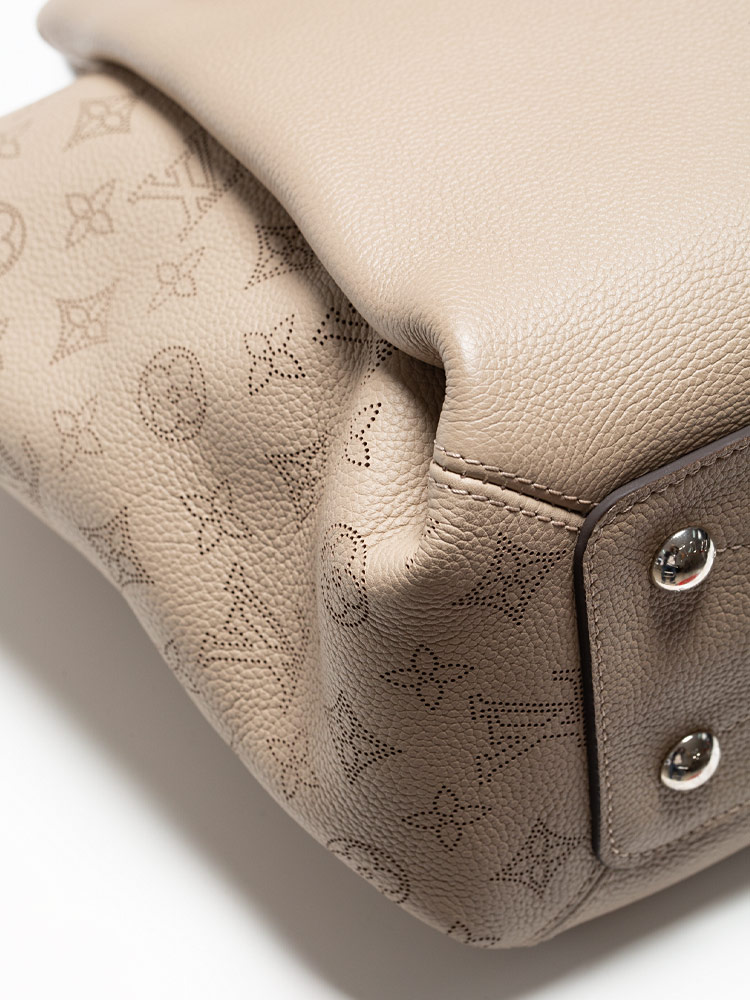 Crafted of grained calfskin and monogram perforated leather leather in beige. The shoulder bag features braided rolled beige leather top handles and silver hardware. This opens to a microfiber interior with flat pockets.